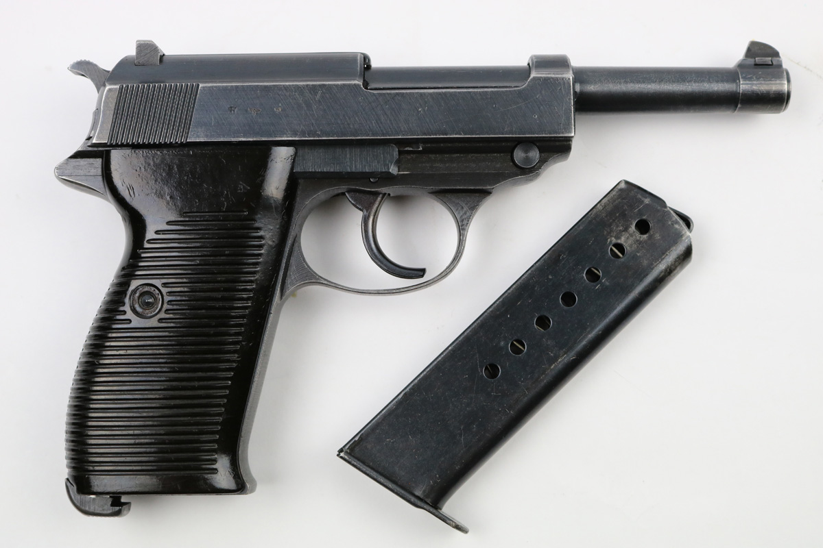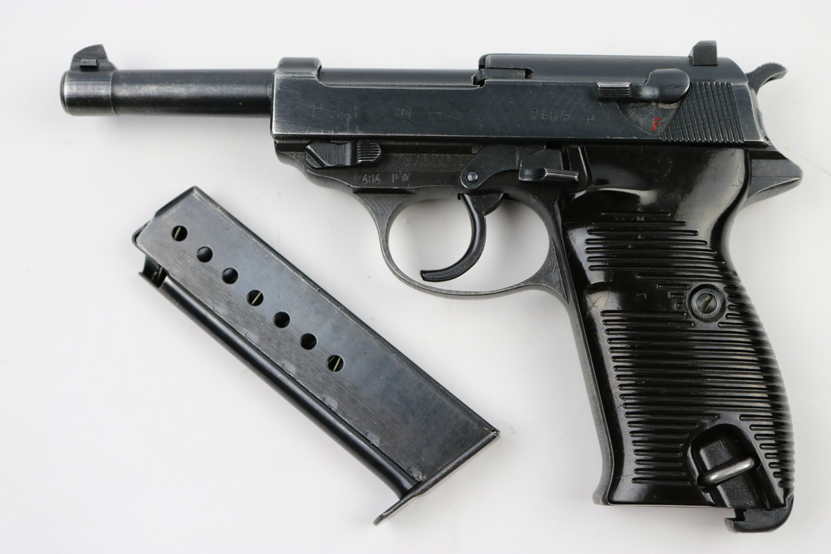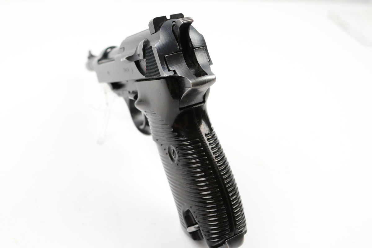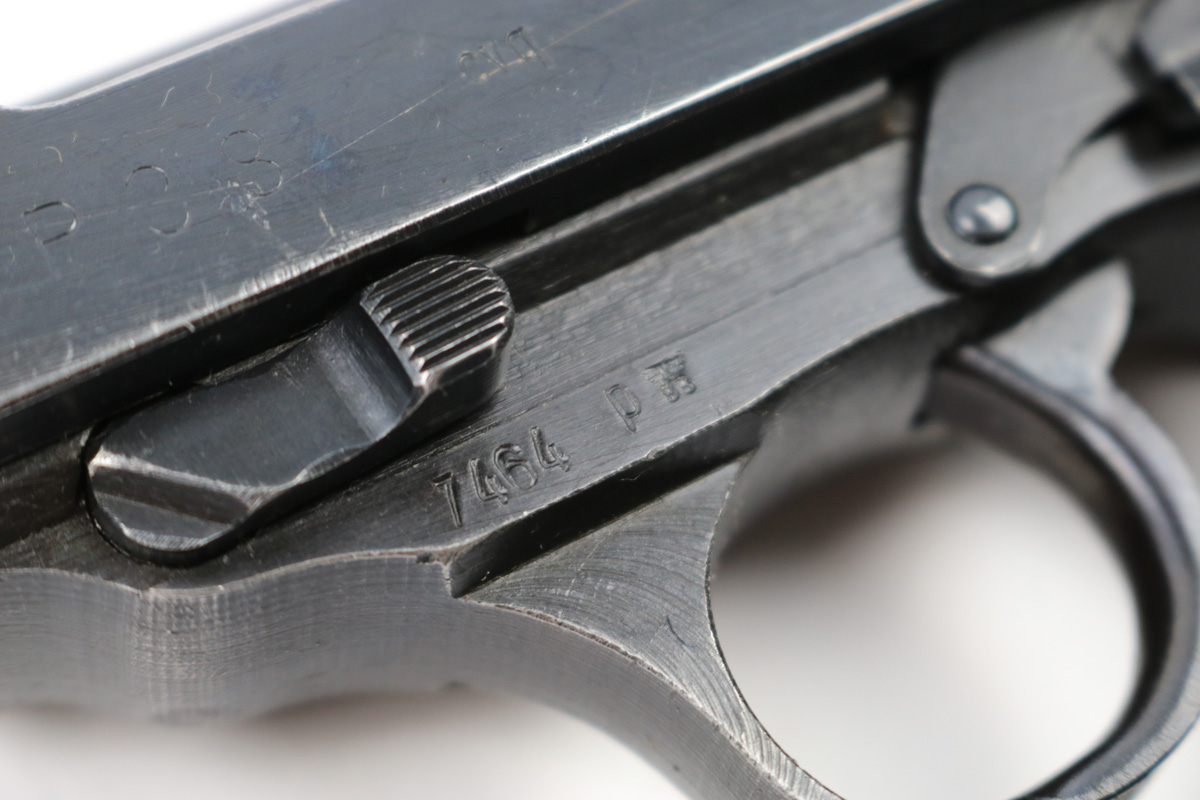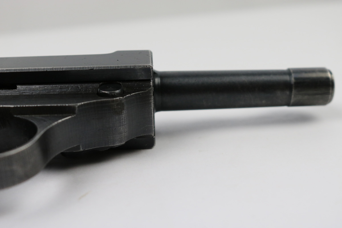 6/20/18 – This is an original WW2 production Spreewerk P.38. The pistol is all correct and original with serial number 7464p. The serial number puts time of production around May of 1943. The slide has some light thinning and edge wear. There’s similar thinning on the barrel as well. The front strap (commonly) has bluing loss throughout. The bore is very clean though with strong rifling and only trace amounts of patina (normal use wear). Comes with period correct and original grips, as well as a waffen 706 jvd magazine.