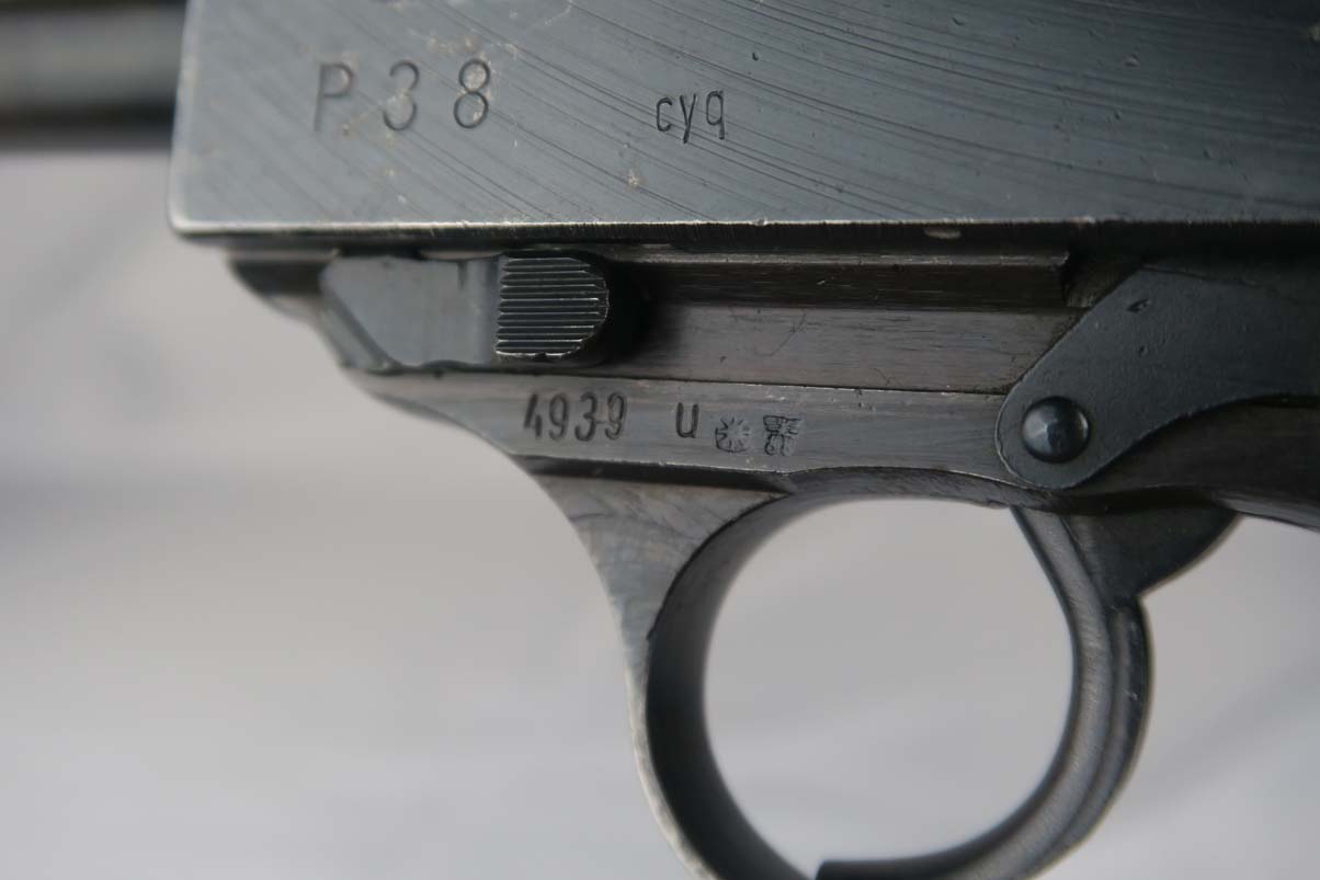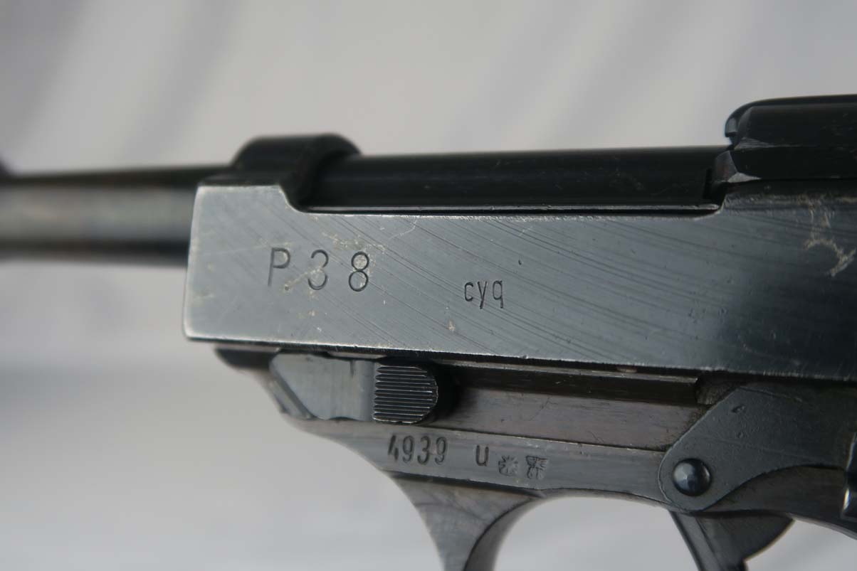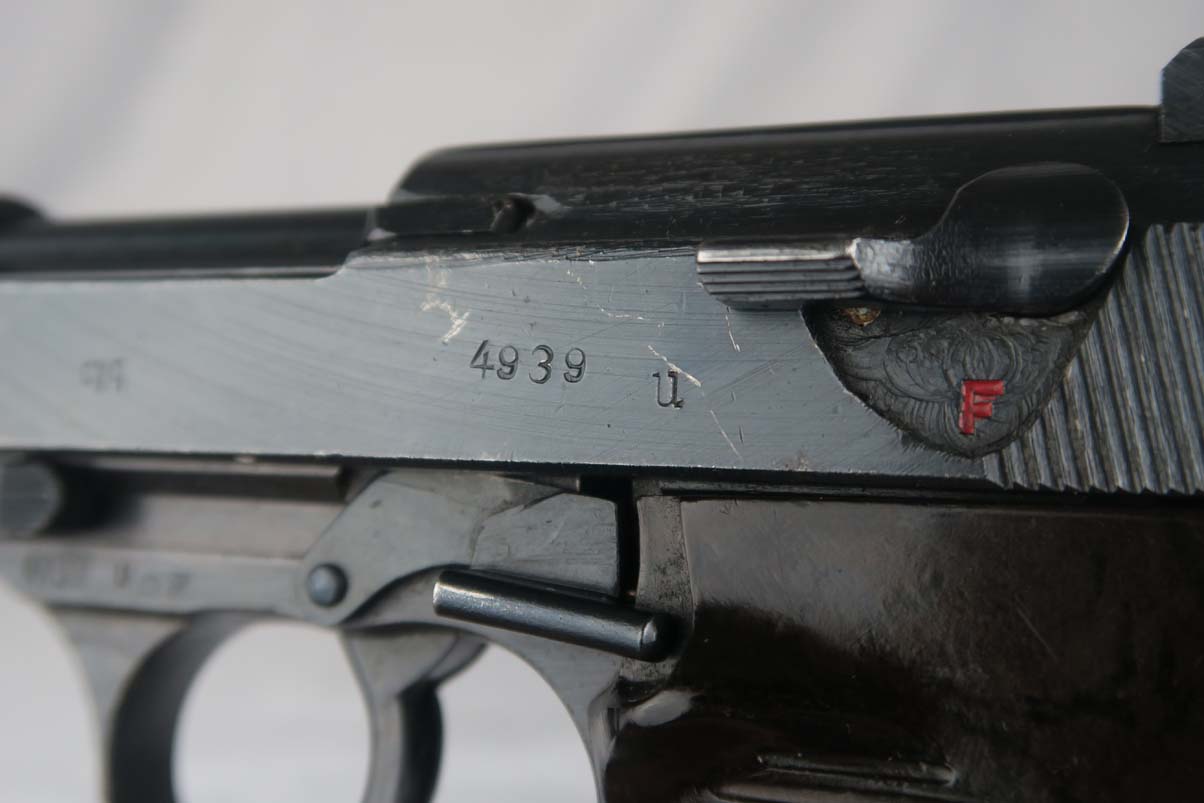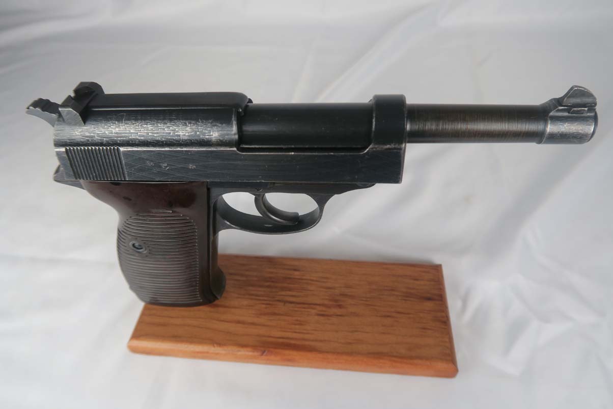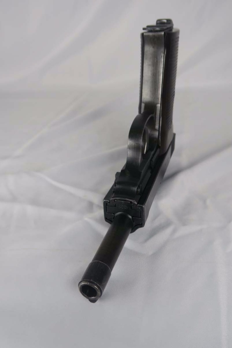 7/26/17 – This is a Spreewerke P.38 that was manufactured in 1944 for use by the German Army.  It is all original and matching, with about 90-92% bluing remaining.  Various minor scratches and edge finish loss, as well as a thin front strap.  Records have cyq pistols from the ‘u’ block being manufactured in September of 1944 – fairly late in the war.  This pistol has a cog style hammer, which is a late feature befitting of a late-war gun.  Excellent grips.  Minty bore.  E/88 mag.