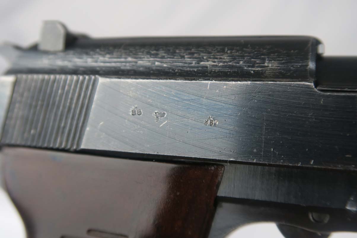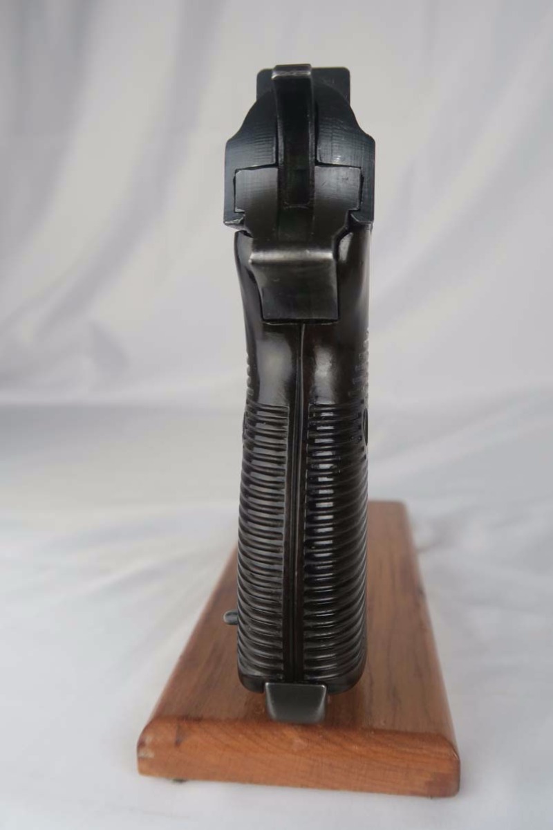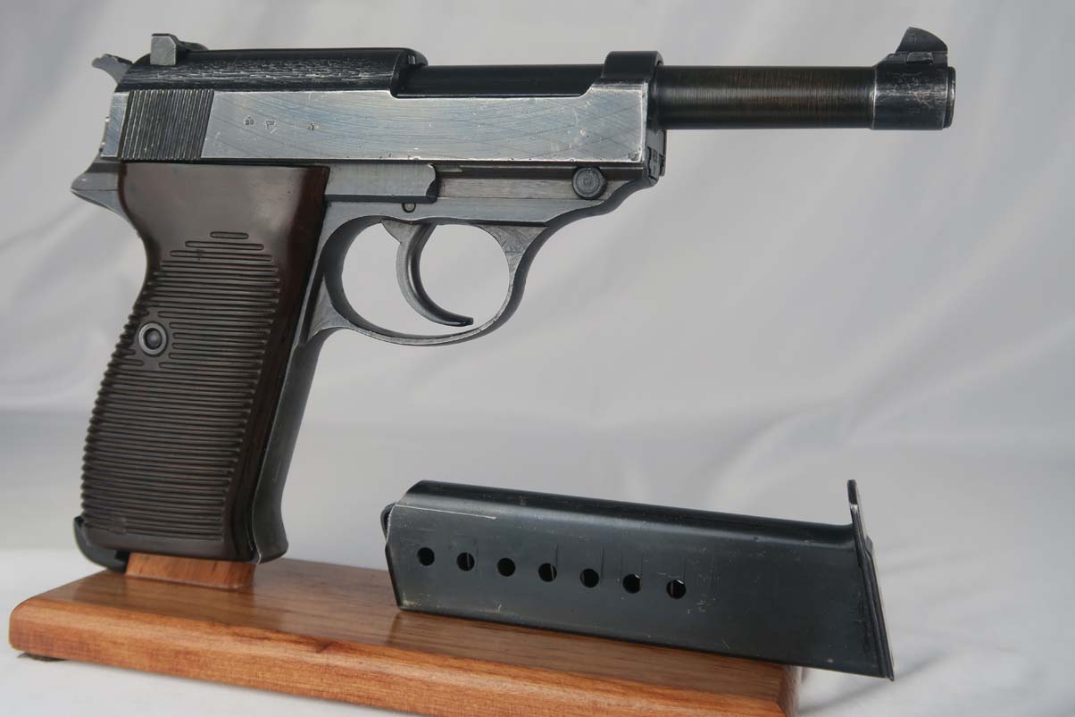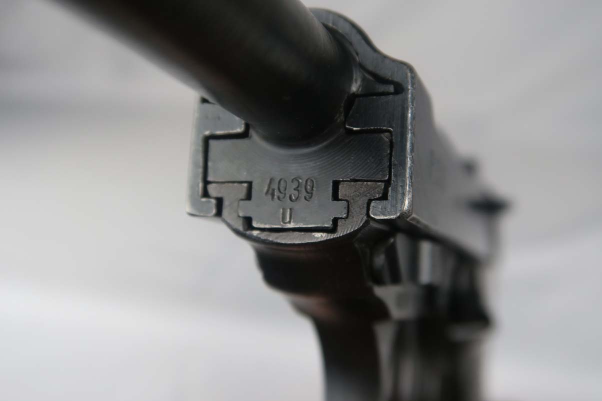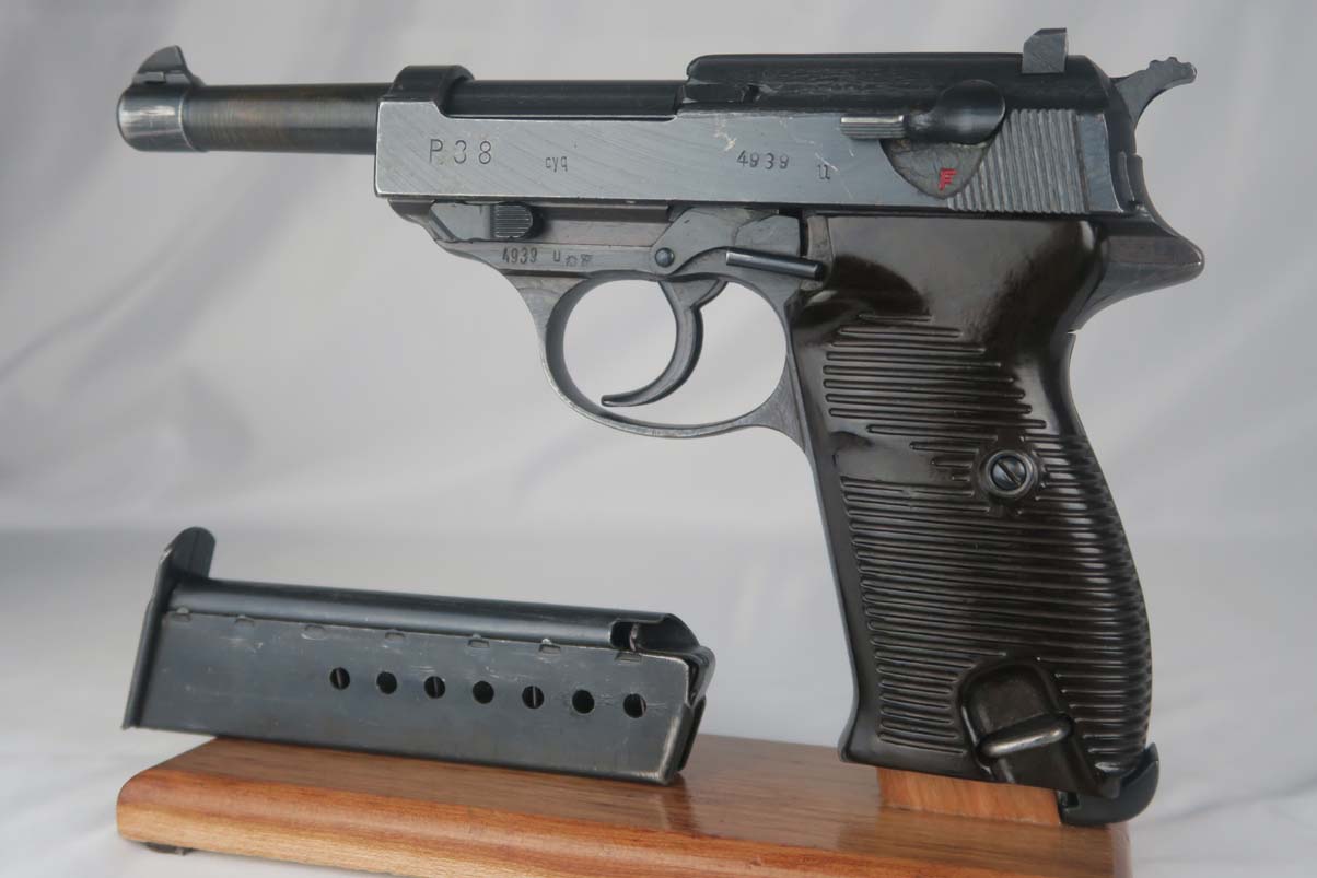 7/26/17 – This is a Spreewerke P.38 that was manufactured in 1944 for use by the German Army.  It is all original and matching, with about 90-92% bluing remaining.  Various minor scratches and edge finish loss, as well as a thin front strap.  Records have cyq pistols from the ‘u’ block being manufactured in September of 1944 – fairly late in the war.  This pistol has a cog style hammer, which is a late feature befitting of a late-war gun.  Excellent grips.  Minty bore.  E/88 mag.