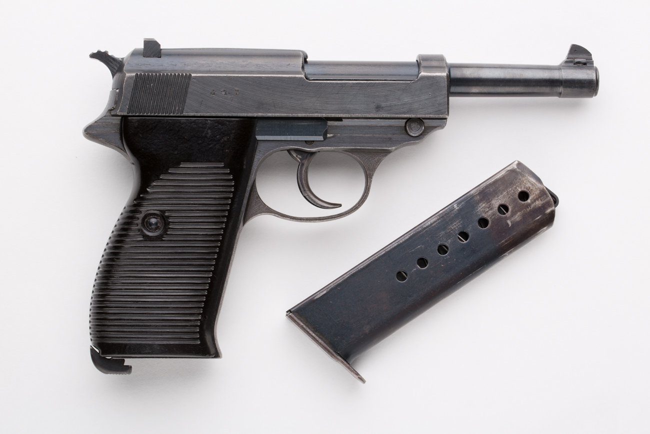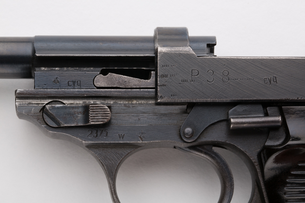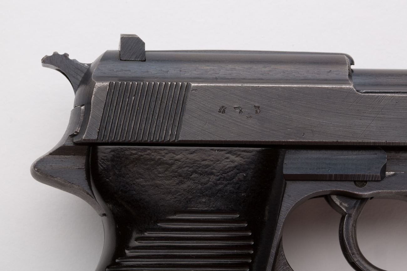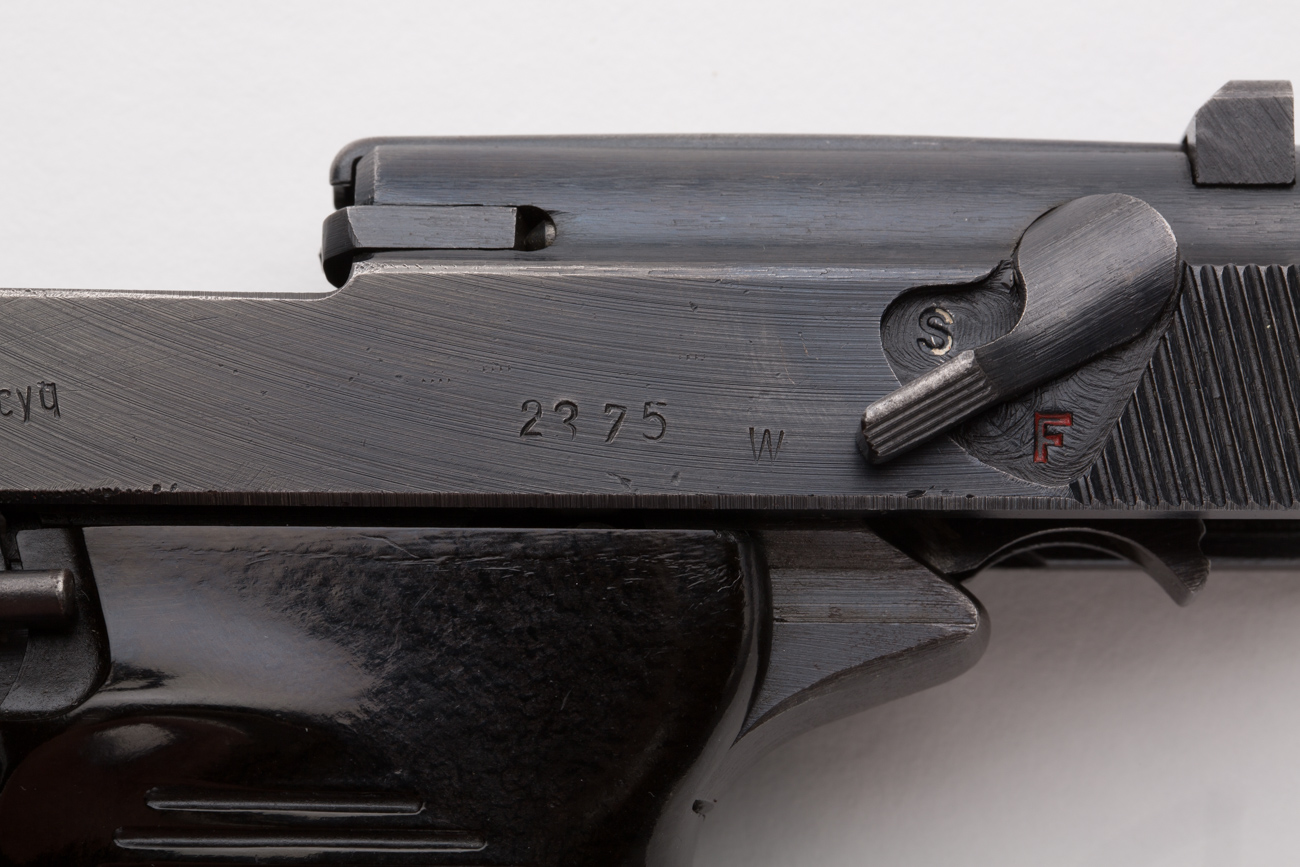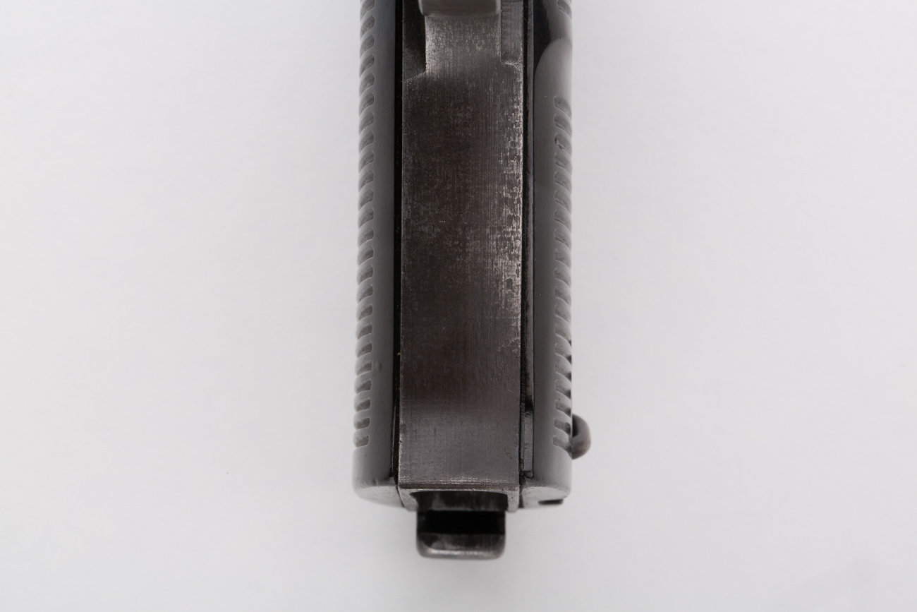 9/29/17 – This is a nice Spreewerke made P.38 from October of 1944. All matching and original with about 96-97% blue remaining. Thinning on the front strap and rough maching due to late war production. Cog style hammer. Mint bore and grips.