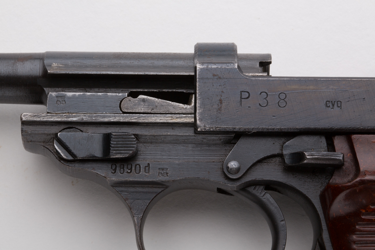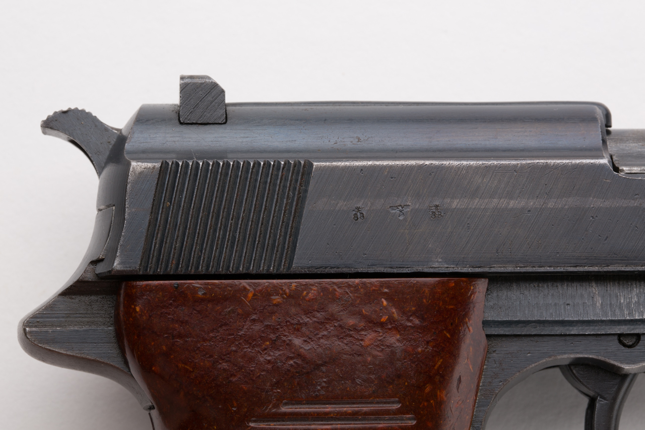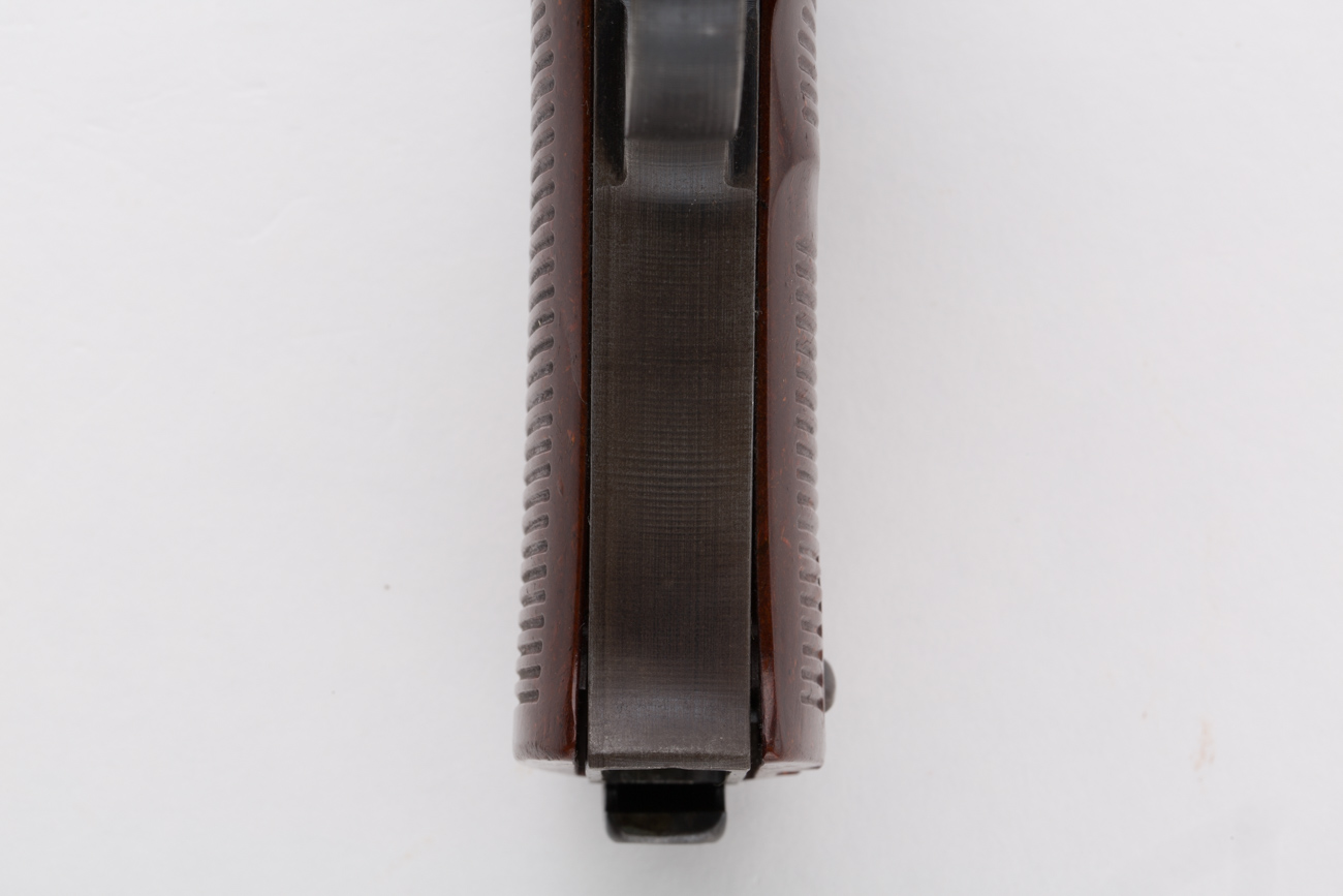 9/29/17 – This is a Spreewerke made P.38 from July of 1943.  It is all original and matching with about 95-96% blue remaining.  There is some rough machining and some patina on the barrel and front strap.  Beautiful reddish grips and strong bore with no major flaws.