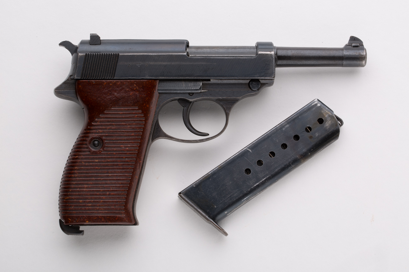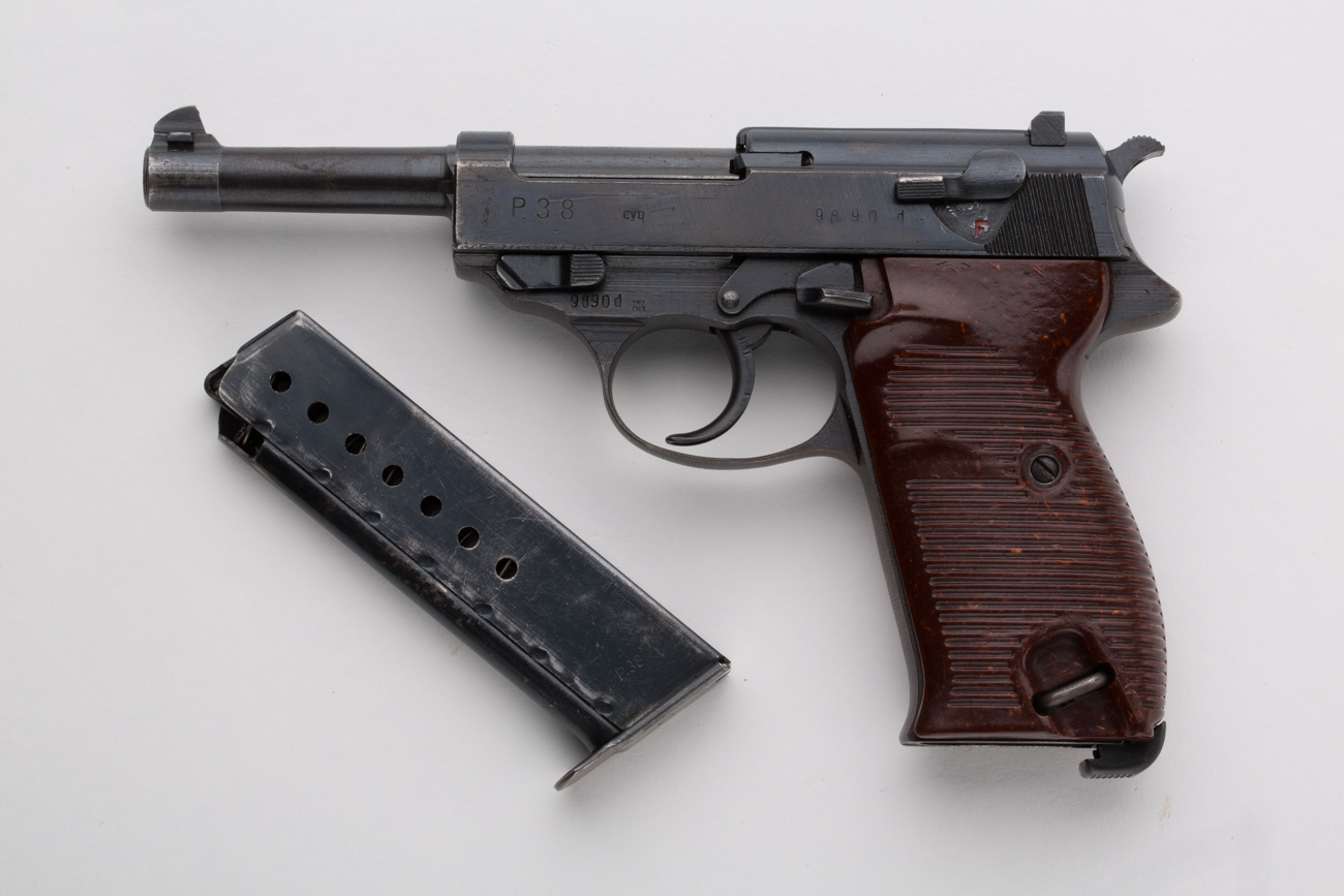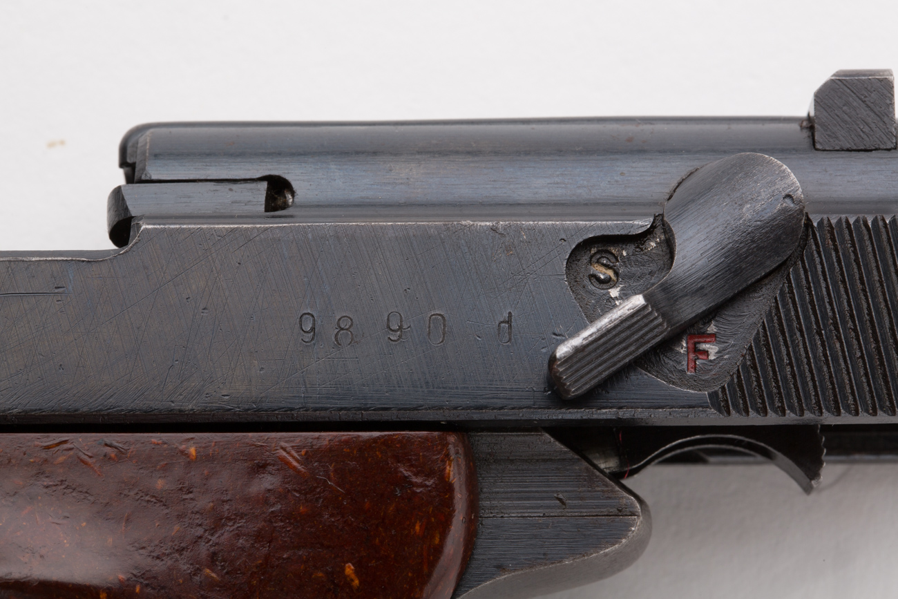 9/29/17 – This is a Spreewerke made P.38 from July of 1943.  It is all original and matching with about 95-96% blue remaining.  There is some rough machining and some patina on the barrel and front strap.  Beautiful reddish grips and strong bore with no major flaws.