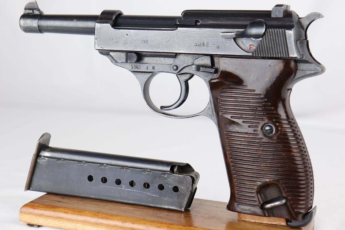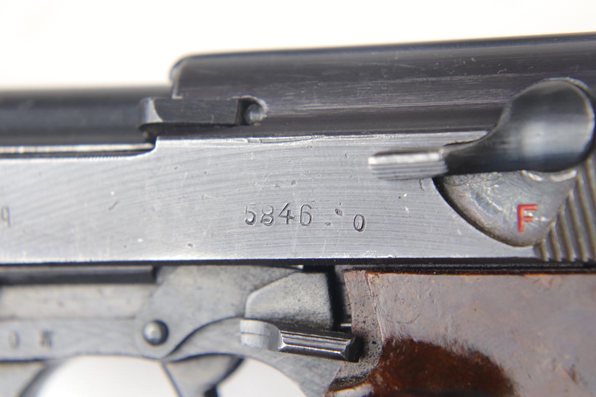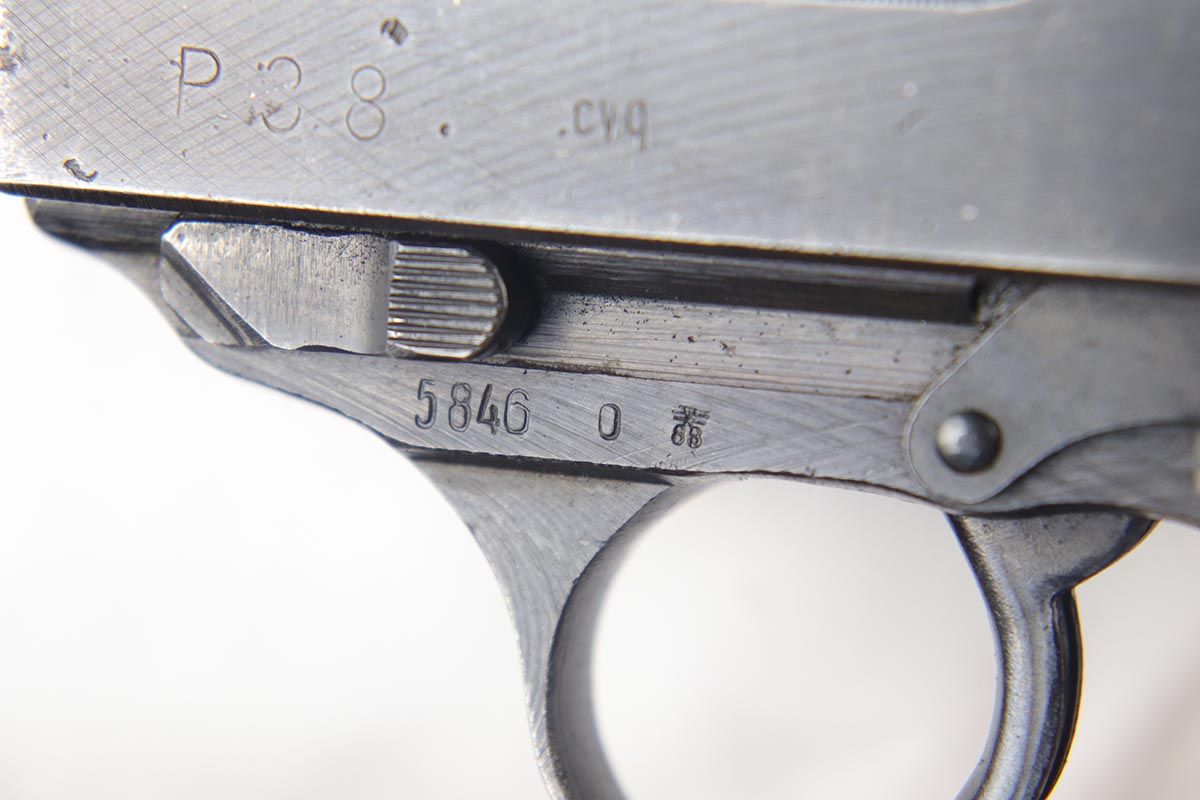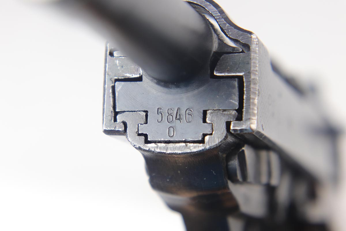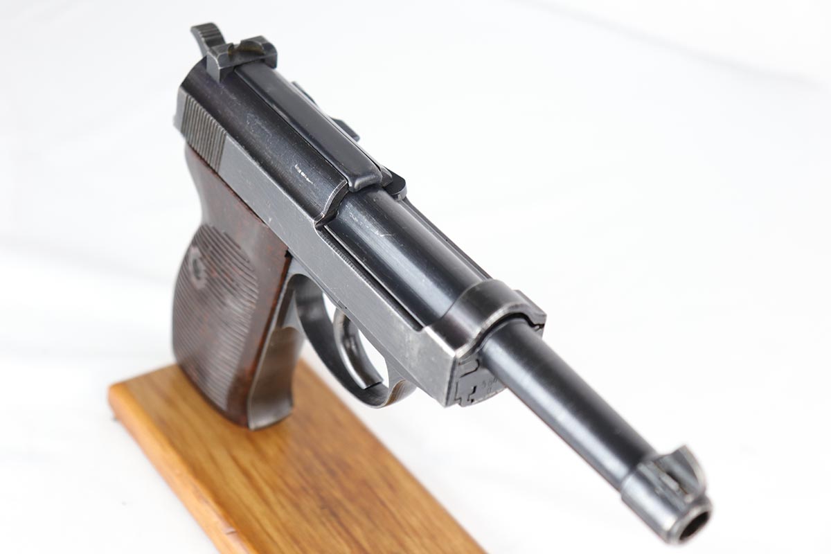 7/17/18 – This is an all matching and original Spreewerke P.38, manufactured in April of 1944. Slide, frame and barrel all match. Finish is original and rates in the low 80s with majority of finish loss on the front strap. Good mechanics, including functioning de-cocker, but the magazine is a little tight in the gun. Bore is shiny with strong rifling but minor frost throughout. Excellent reddish grips.