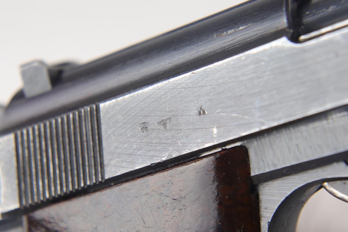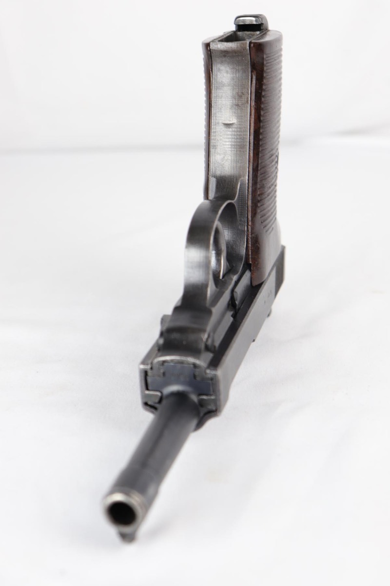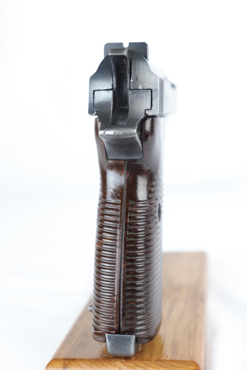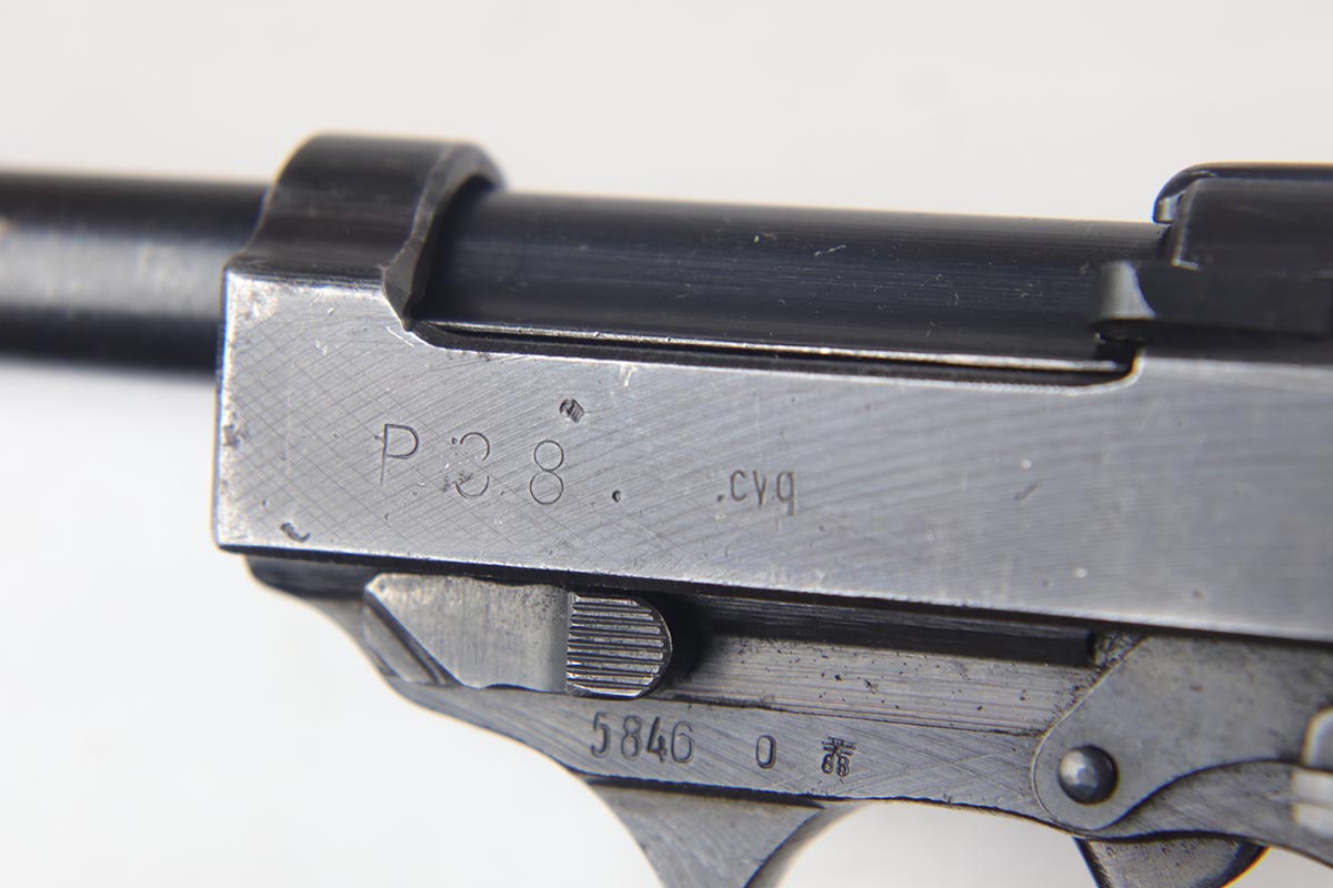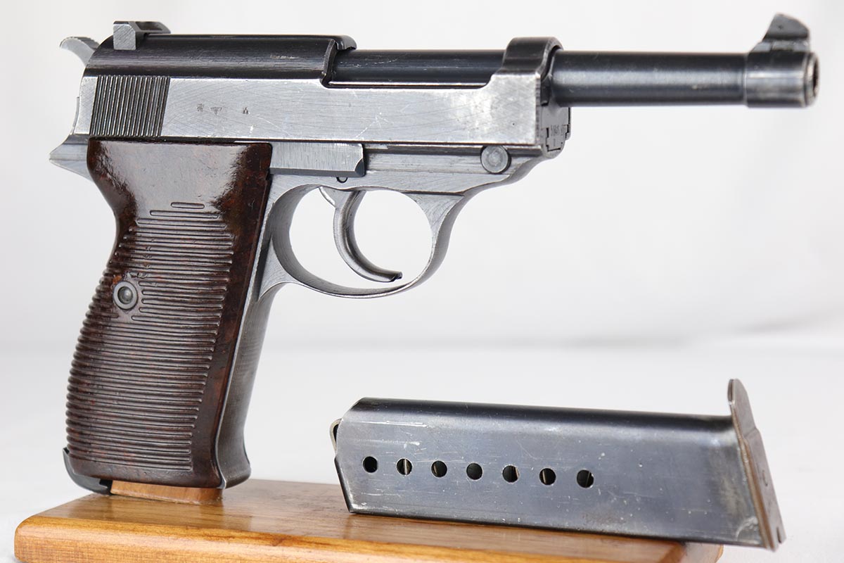 7/17/18 – This is an all matching and original Spreewerke P.38, manufactured in April of 1944. Slide, frame and barrel all match. Finish is original and rates in the low 80s with majority of finish loss on the front strap. Good mechanics, including functioning de-cocker, but the magazine is a little tight in the gun. Bore is shiny with strong rifling but minor frost throughout. Excellent reddish grips.