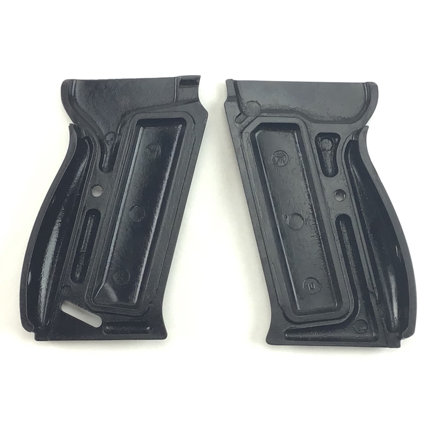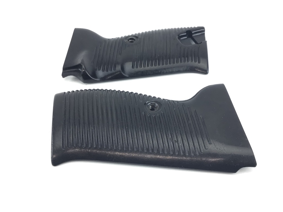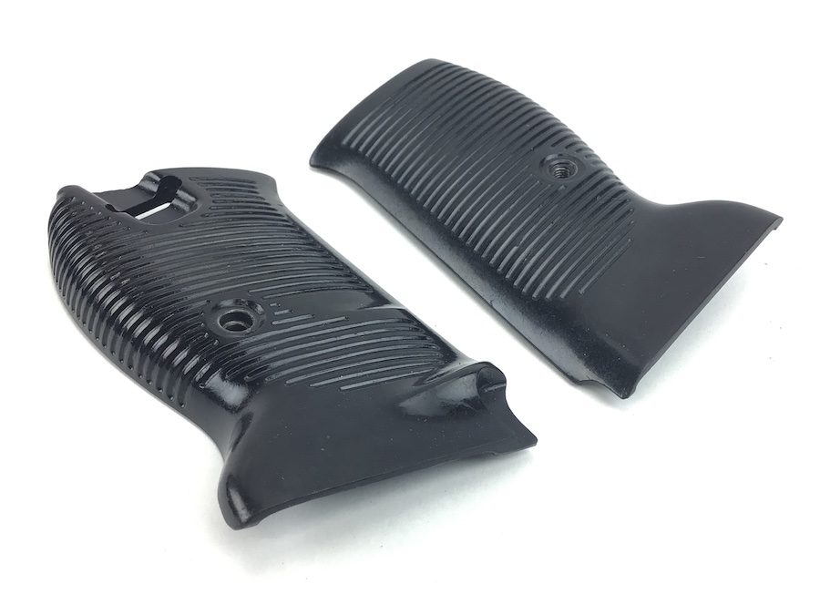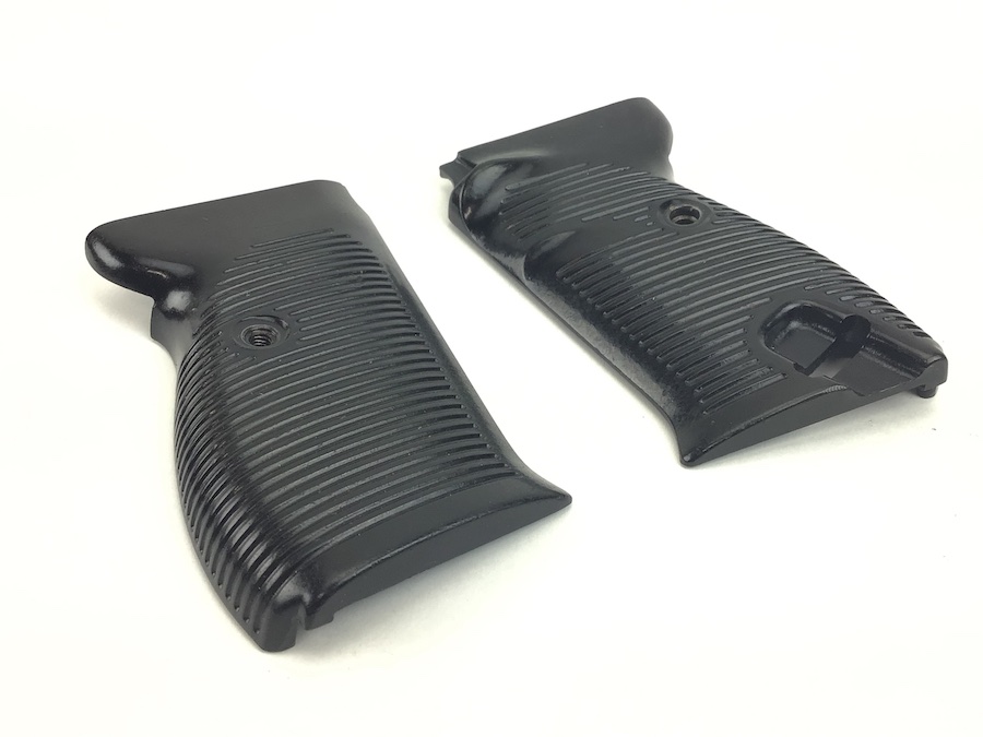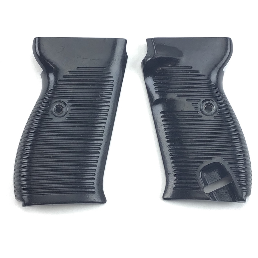 8/17/21 – Original and minty condition deep brown, almost black, bakelite grips made by Posselt. Manufactured for the Spreewerke P.38’s. The company of Julius Posselt in Gablonz produced the grips for the Spreewerk-made P38s from the end of 1943 until the end of WWII. These grips have the typical exterior of the majority found on P38s, except that they show only 5 grooves that are broken by the grip screw. No chips or cracks.