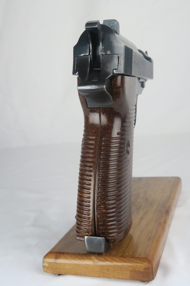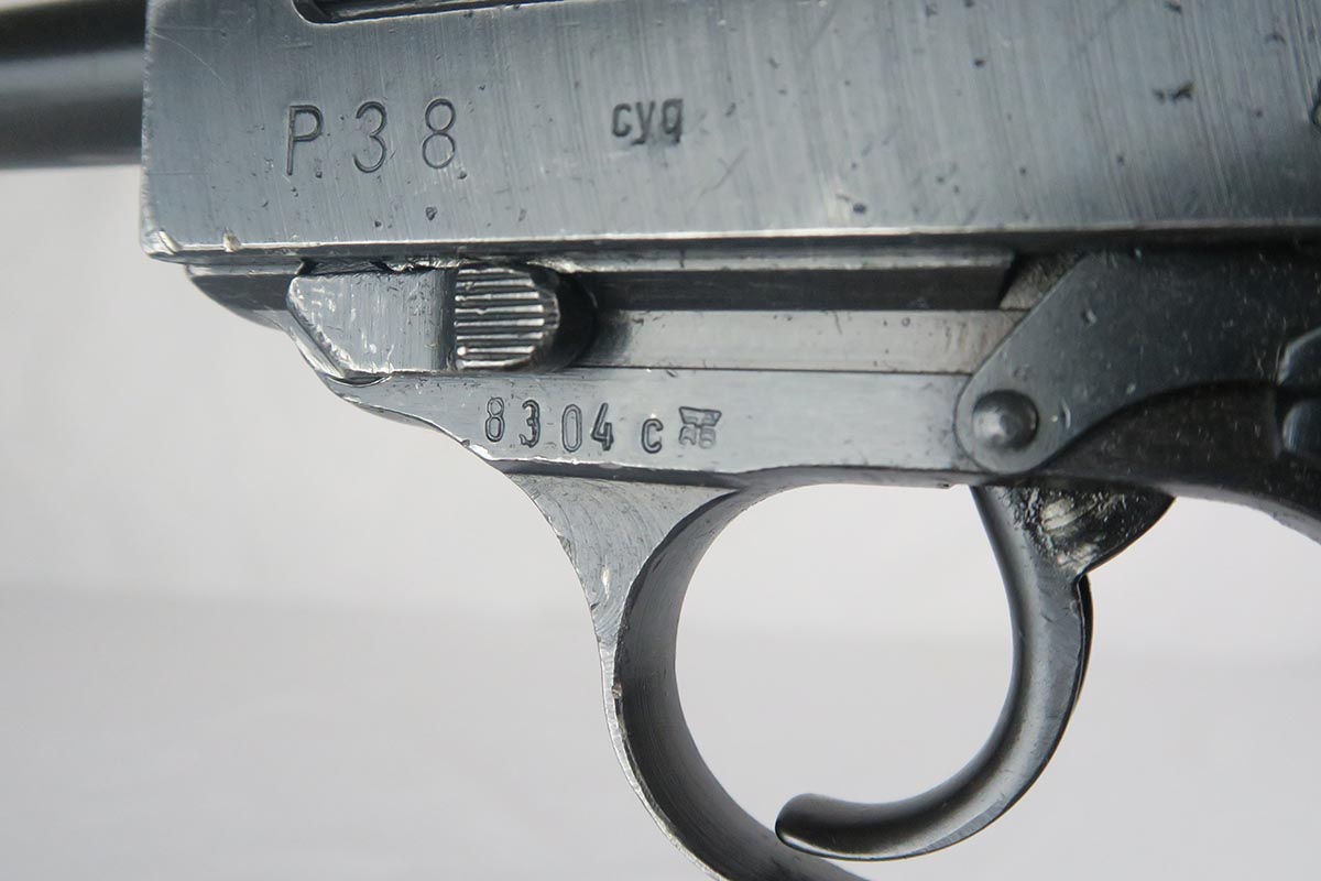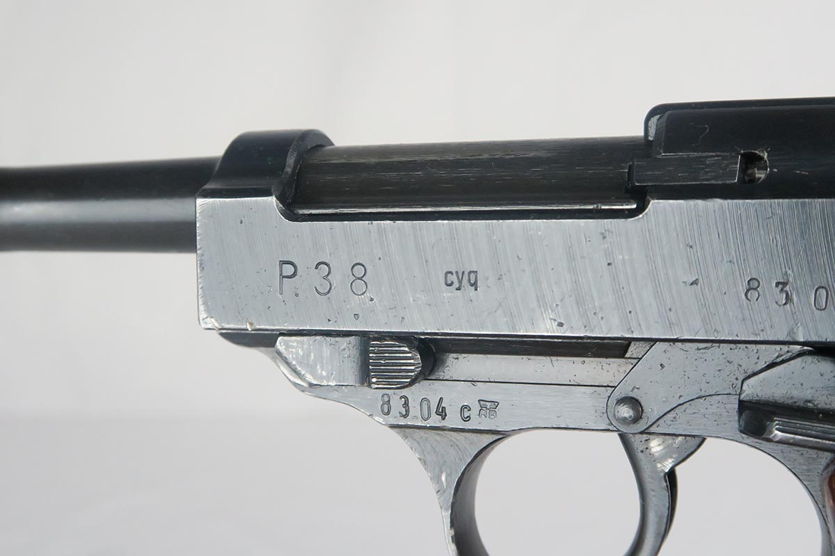 1/17/18 – This is a niche variation Spreewerke cyq P.38, with backwards ‘c’ in the slide serial.  It is a scarce but known variation, made in May/June of 1943.  The pistol is all original and matching with maybe 94-95% blue remaining.  There is some high edge wear, as well as a small area of finish loss on the underside of the barrel.  E/88 marked magazine.  Minty reddish grips.  Bore is shiny and shows only minor use.