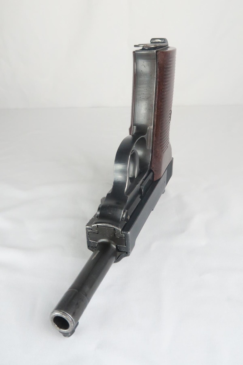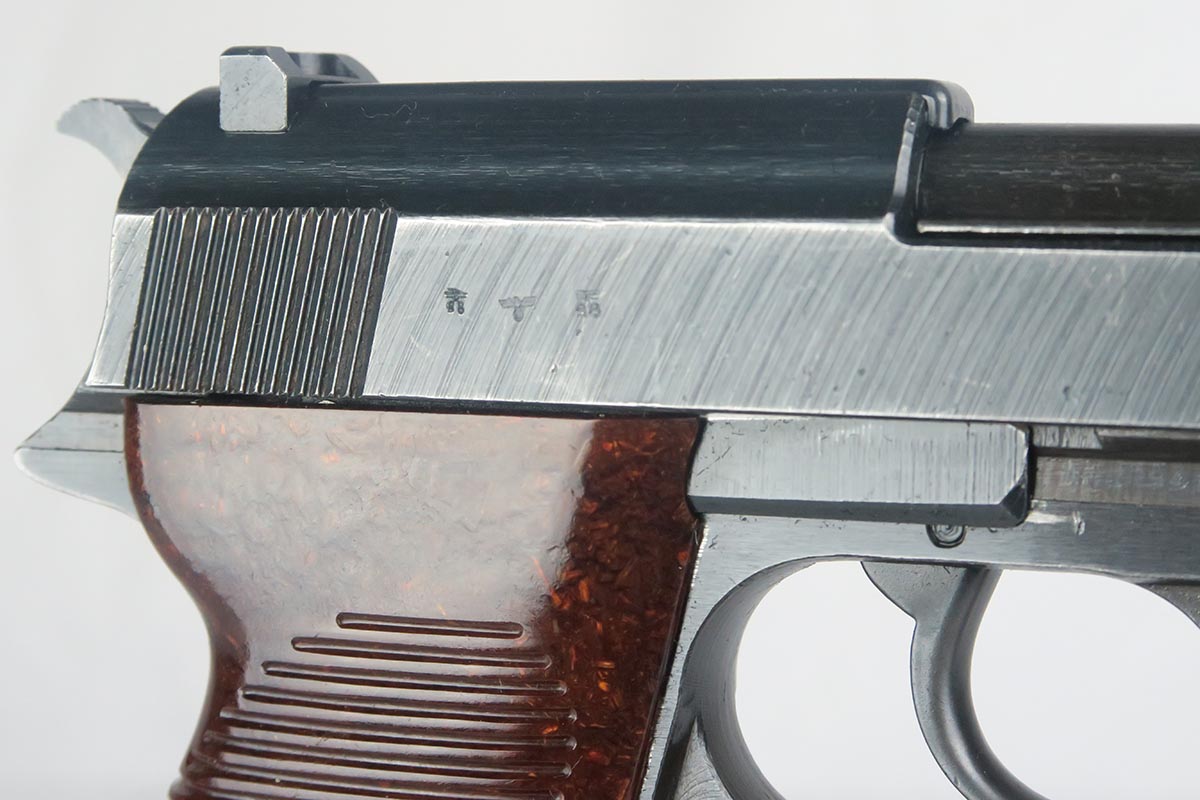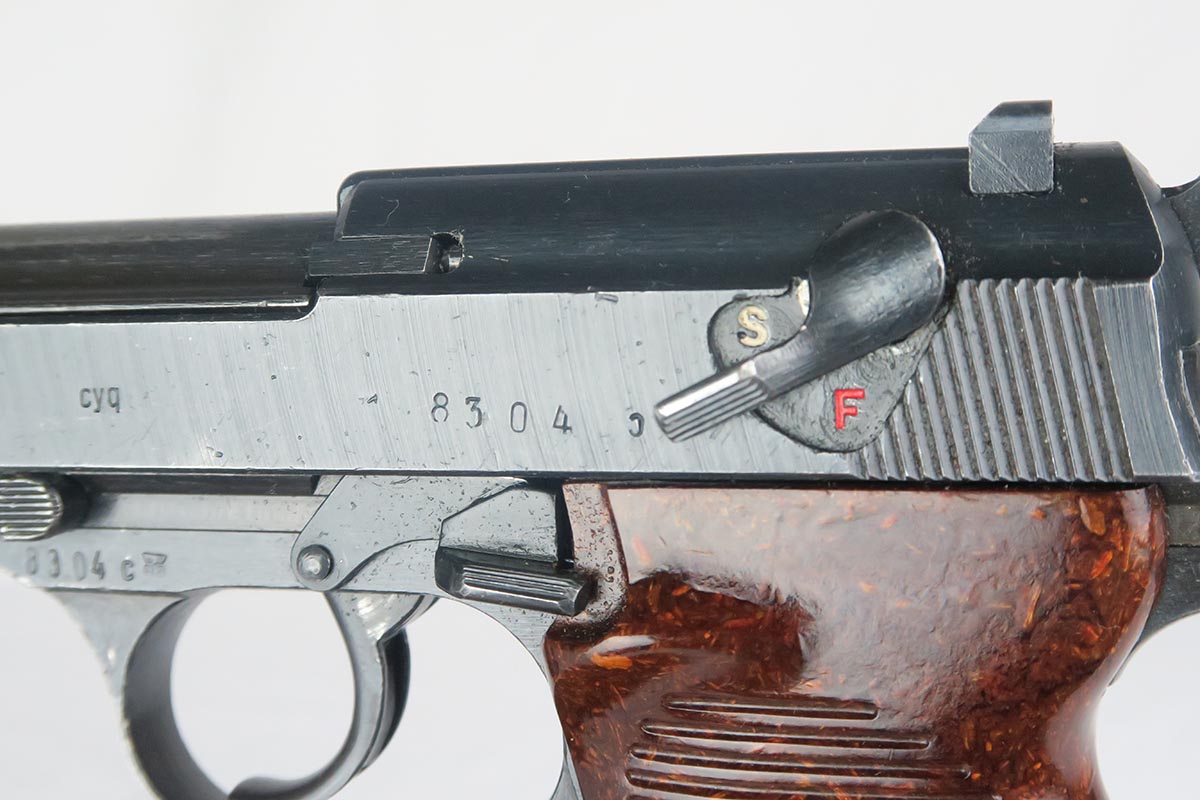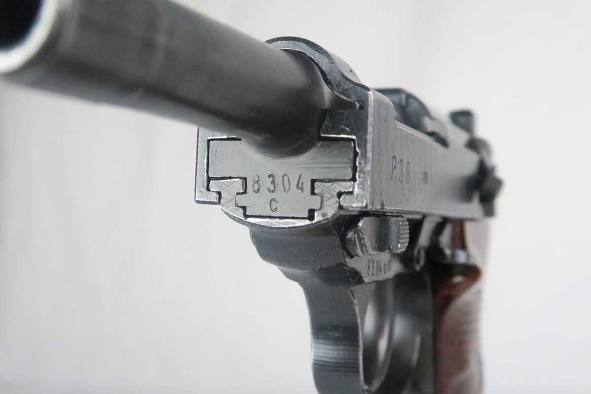 1/17/18 – This is a niche variation Spreewerke cyq P.38, with backwards ‘c’ in the slide serial.  It is a scarce but known variation, made in May/June of 1943.  The pistol is all original and matching with maybe 94-95% blue remaining.  There is some high edge wear, as well as a small area of finish loss on the underside of the barrel.  E/88 marked magazine.  Minty reddish grips.  Bore is shiny and shows only minor use.