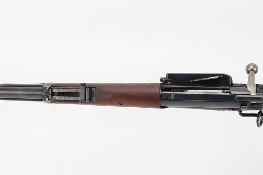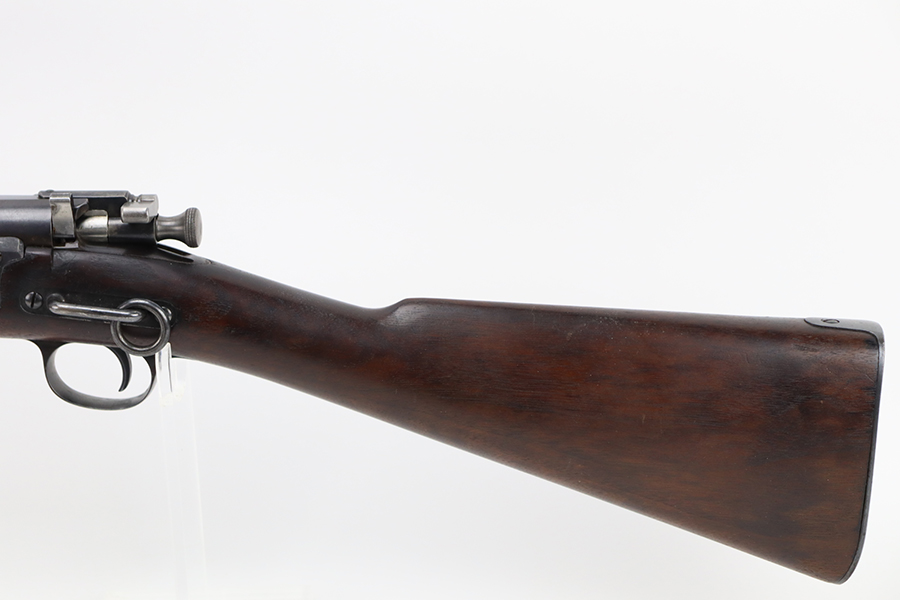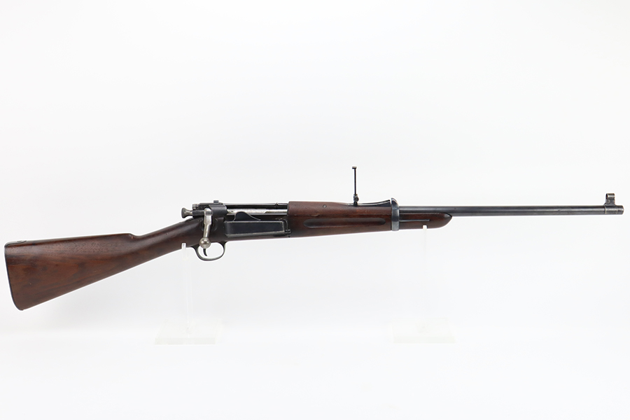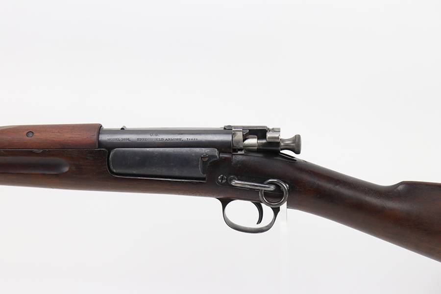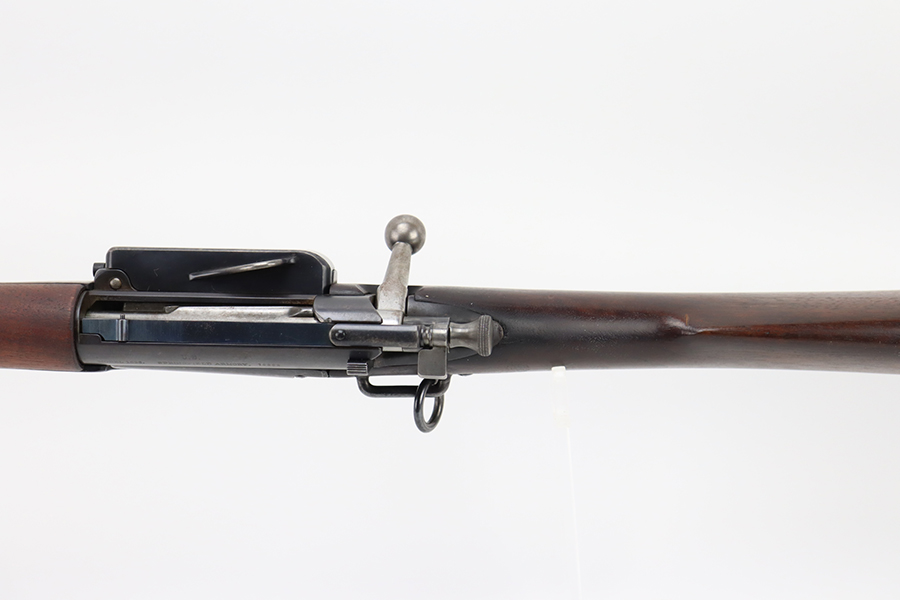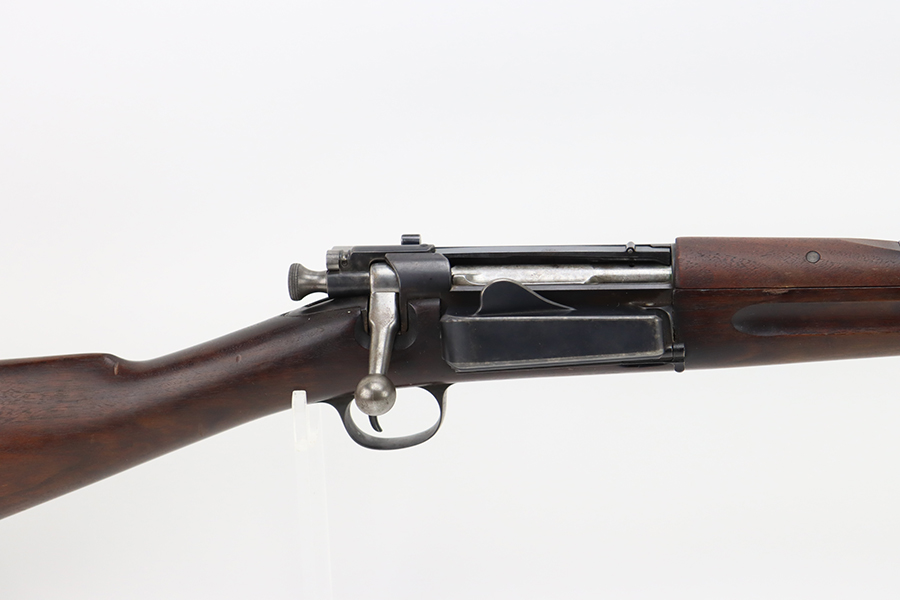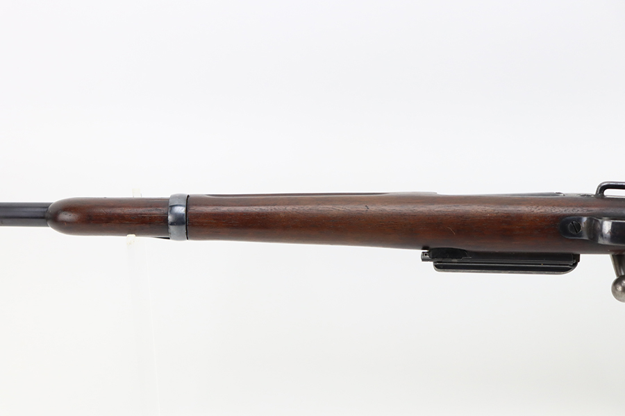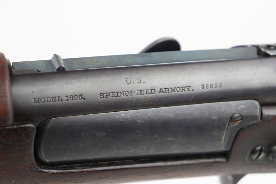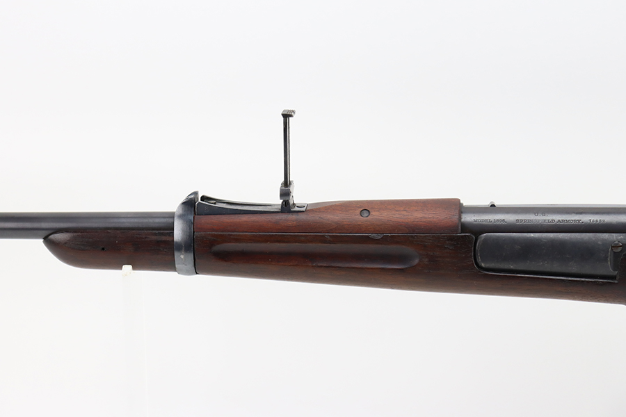 4/4/24 – This is an excellent example of a Springfield Model 1896 Krag Carbine from 1897. The receiver is “US” property marked. The stock has a “P” and a faint military cartouche on the left side. The finish on the metal parts is excellent with just minor high edge wear. Minty wood stock. The bore has good rifling, but there is minor pin-pricking throughout.