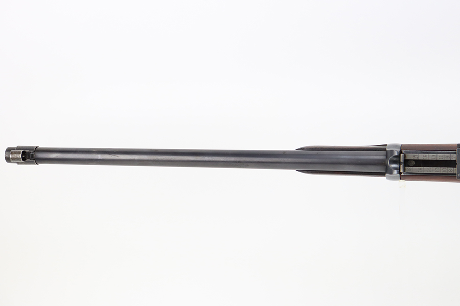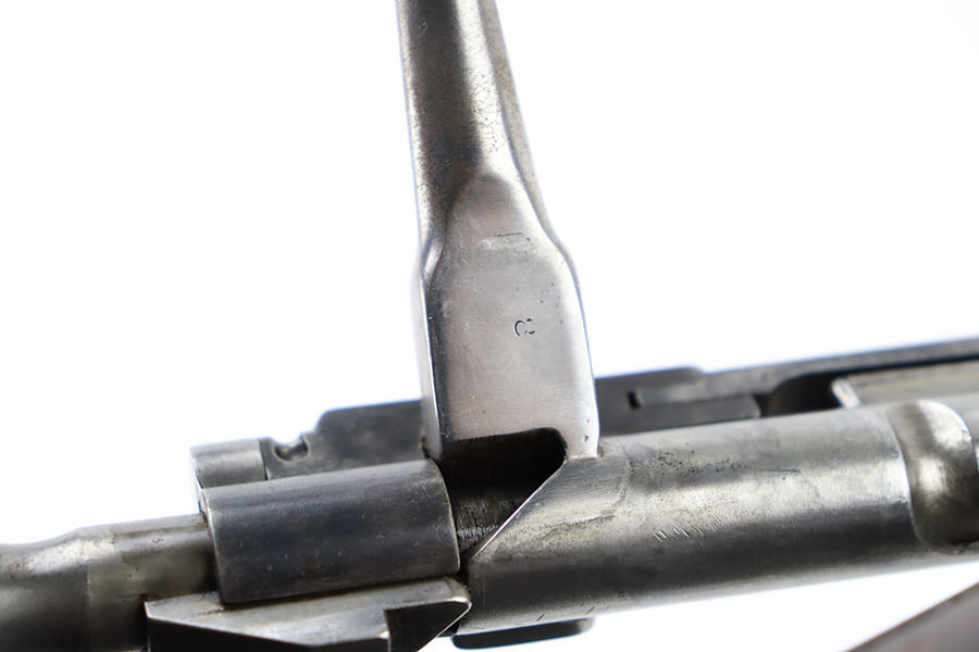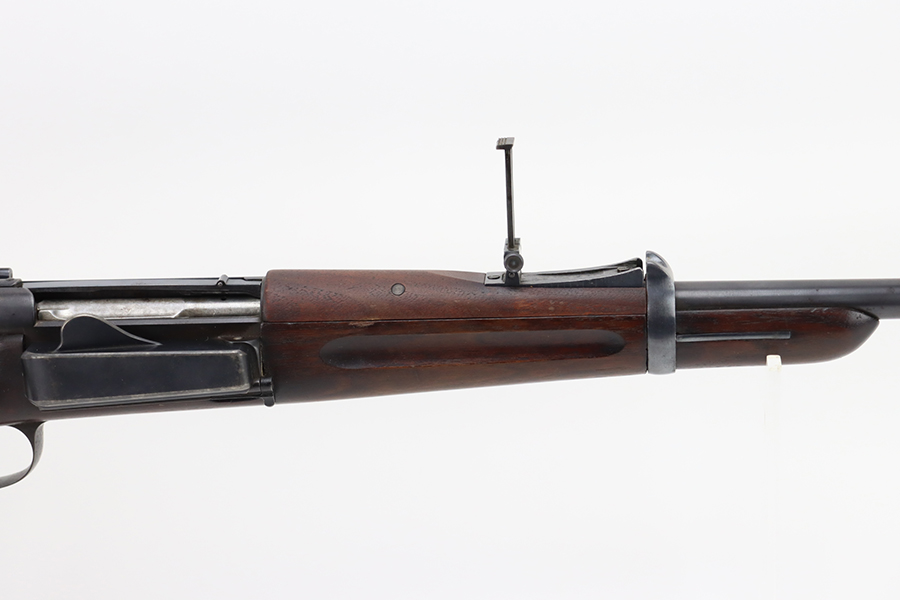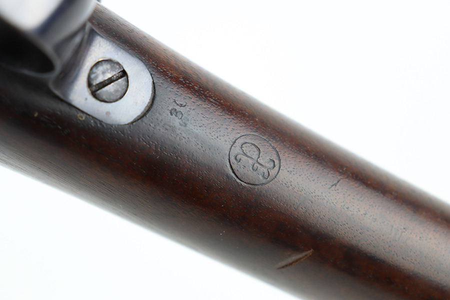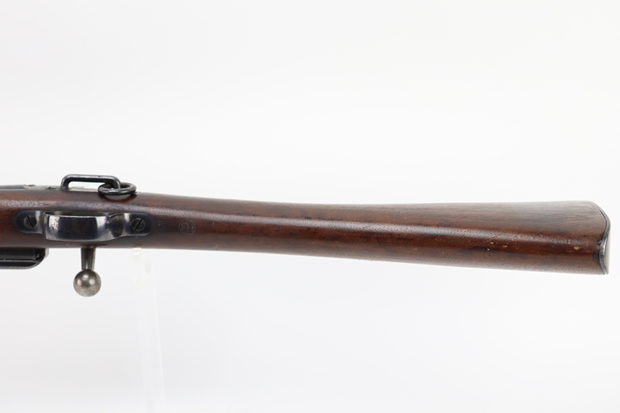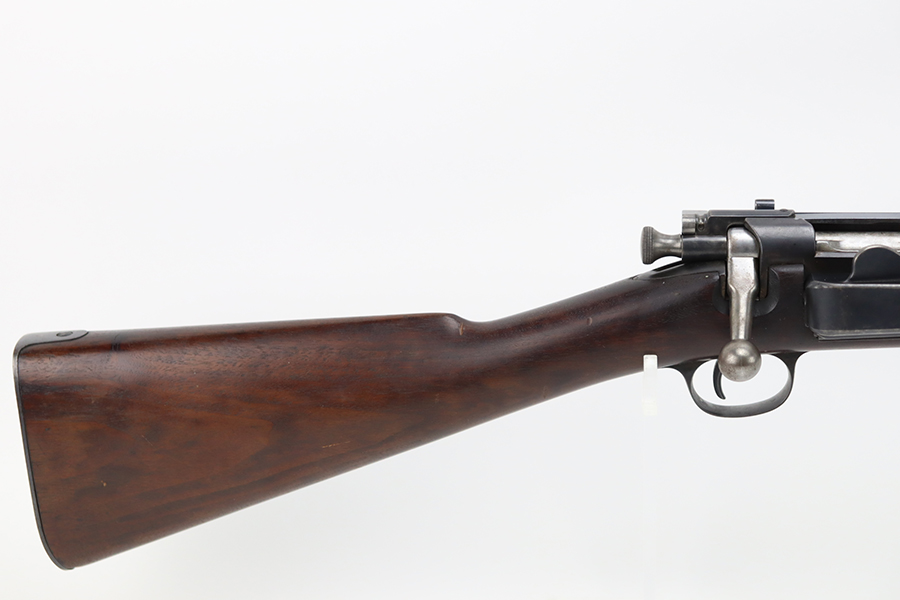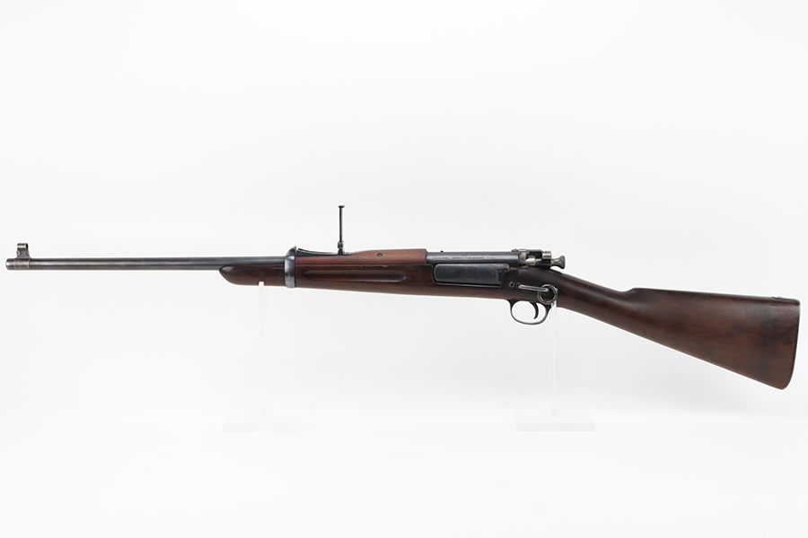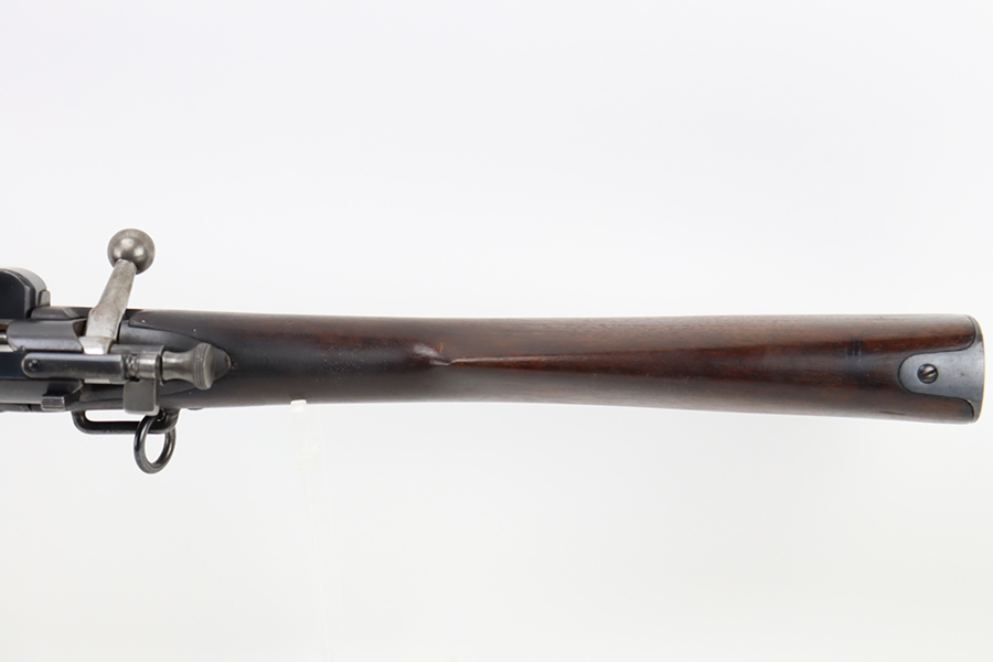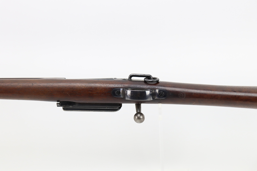 4/4/24 – This is an excellent example of a Springfield Model 1896 Krag Carbine from 1897. The receiver is “US” property marked. The stock has a “P” and a faint military cartouche on the left side. The finish on the metal parts is excellent with just minor high edge wear. Minty wood stock. The bore has good rifling, but there is minor pin-pricking throughout.