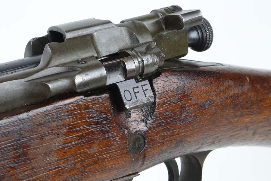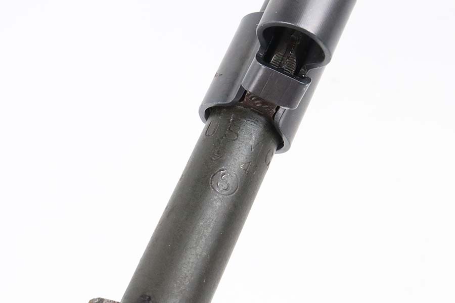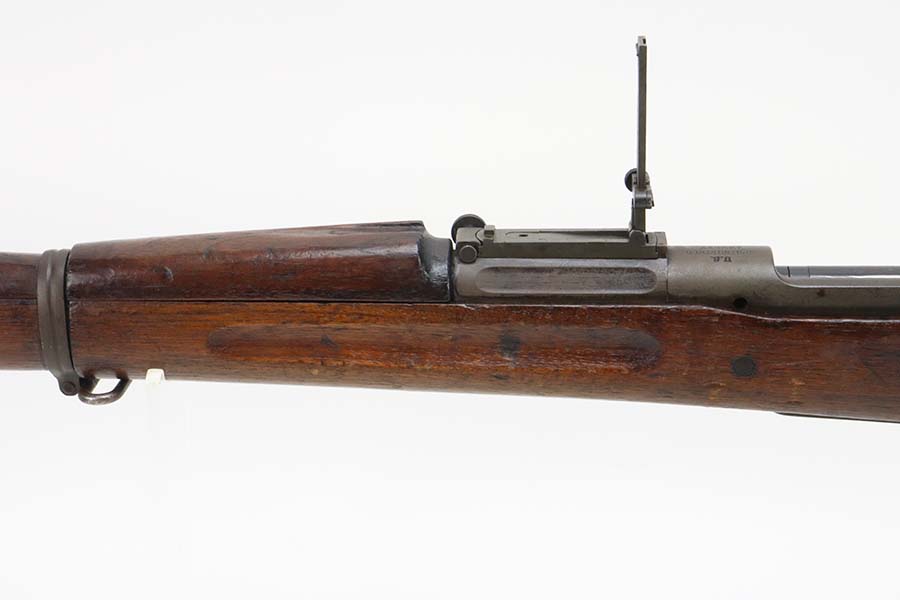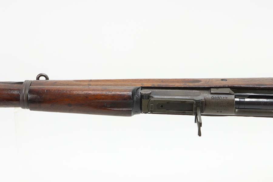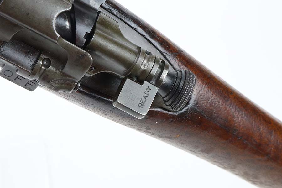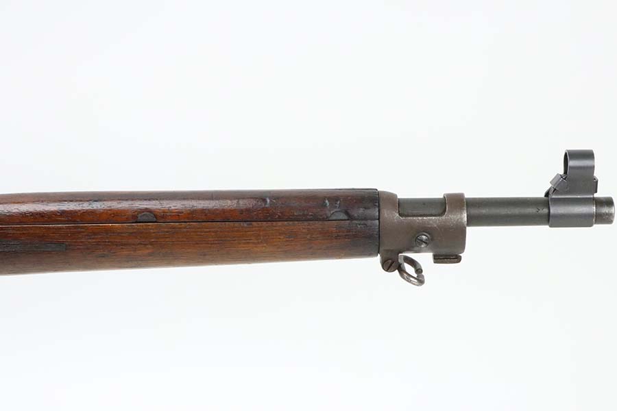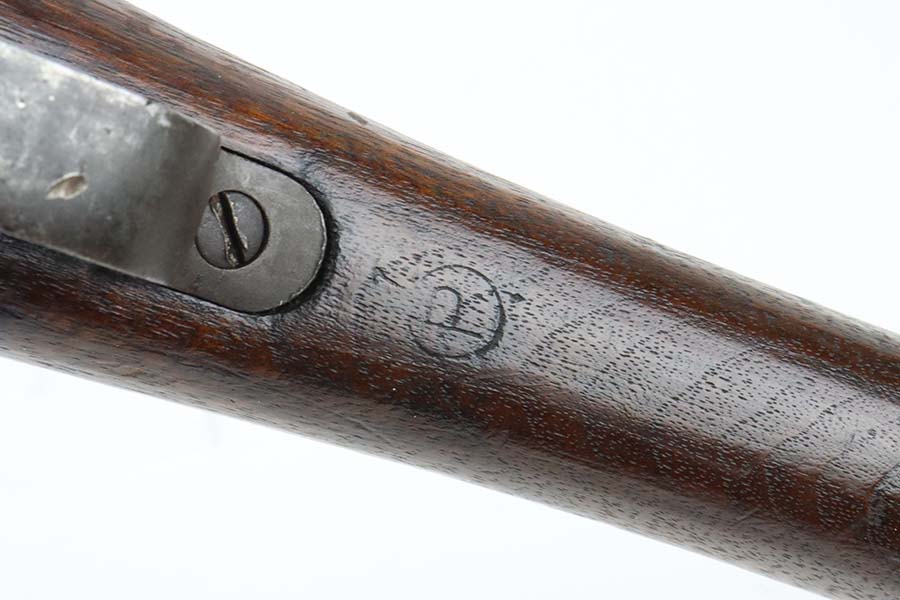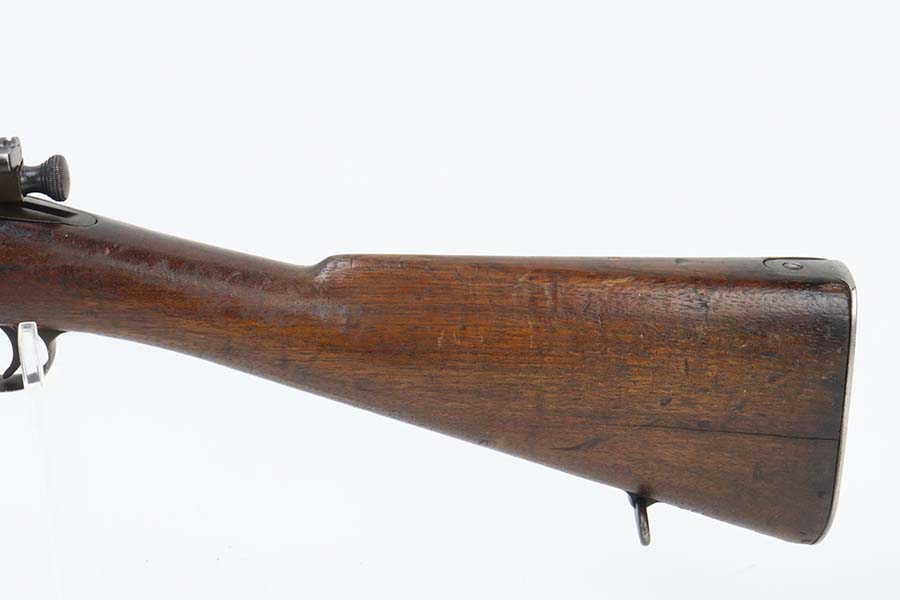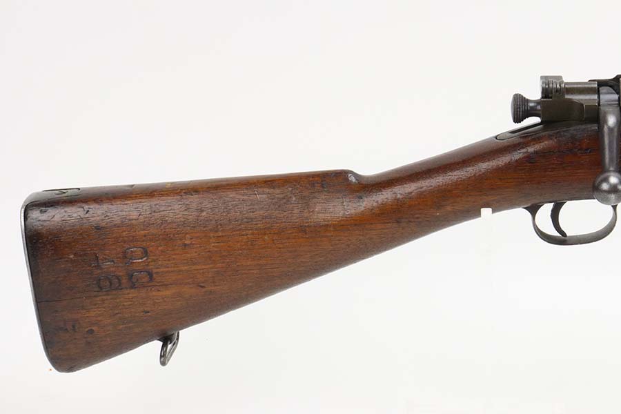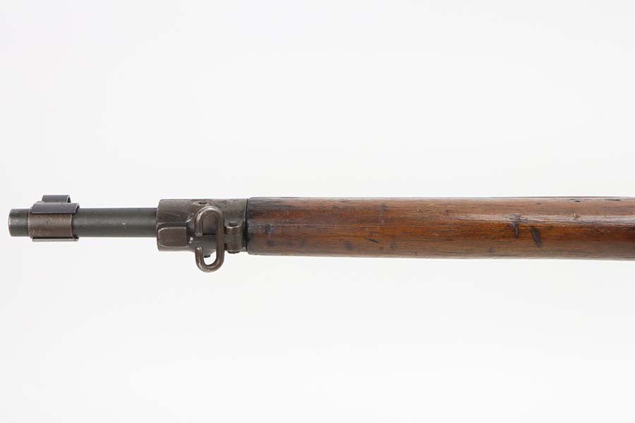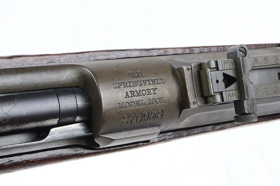 4/4/24 – This is a very nice example of a Springfield Model 1903 rifle that was reworked by the United States Marine Corp for WW2. The receiver is marked Springfield, numbered with an early serial from 1906, and features a “Hatcher Hole” on the left side. The barrel is marked “U.S.M.C.” and dated “9-41” with a “s” within a circle stamped below, indicating this barrel is a Sedgely barrel reworked into the rifle for WW2. Other USMC attributes include electro-pencil numbering on the bolt and the checkered butt plate. The right side of the butt stock has a “QQ 46” marking. The finish on the metal parts rates roughly 90%. While there isn’t a ton of actual finish loss, there are areas of light brown patina throughout and some noticeable spotty oxidation on the front barrel band. The stock shows obvious sings of wear. A couple of very light hairline cracks in the butt stock and upper handguard. The bore has great rifling with very light frosting throughout.