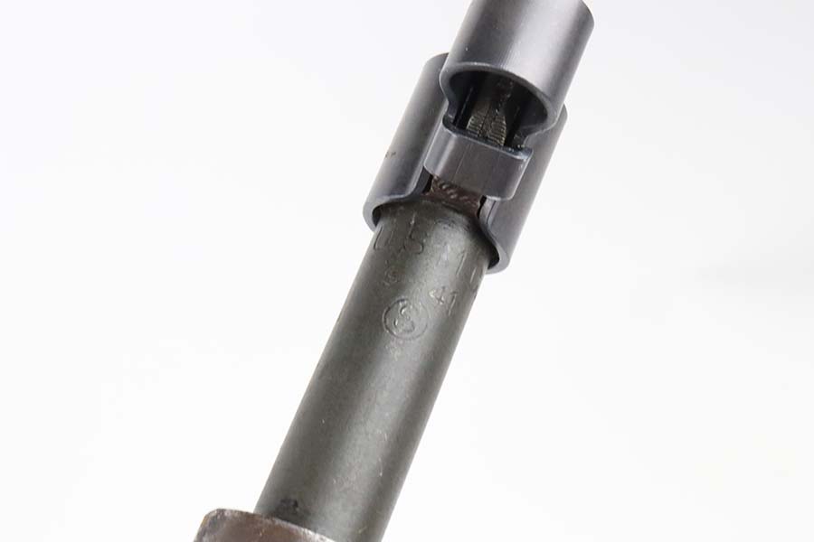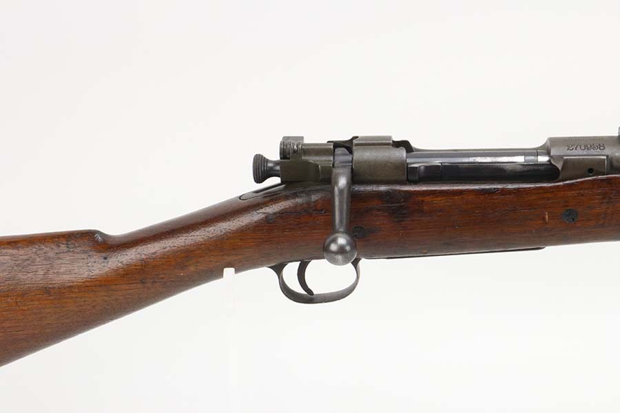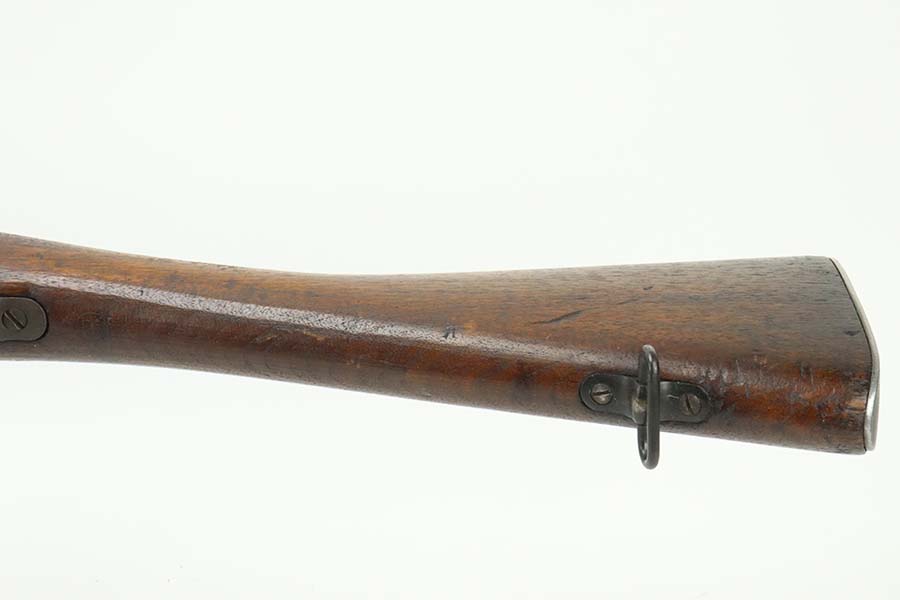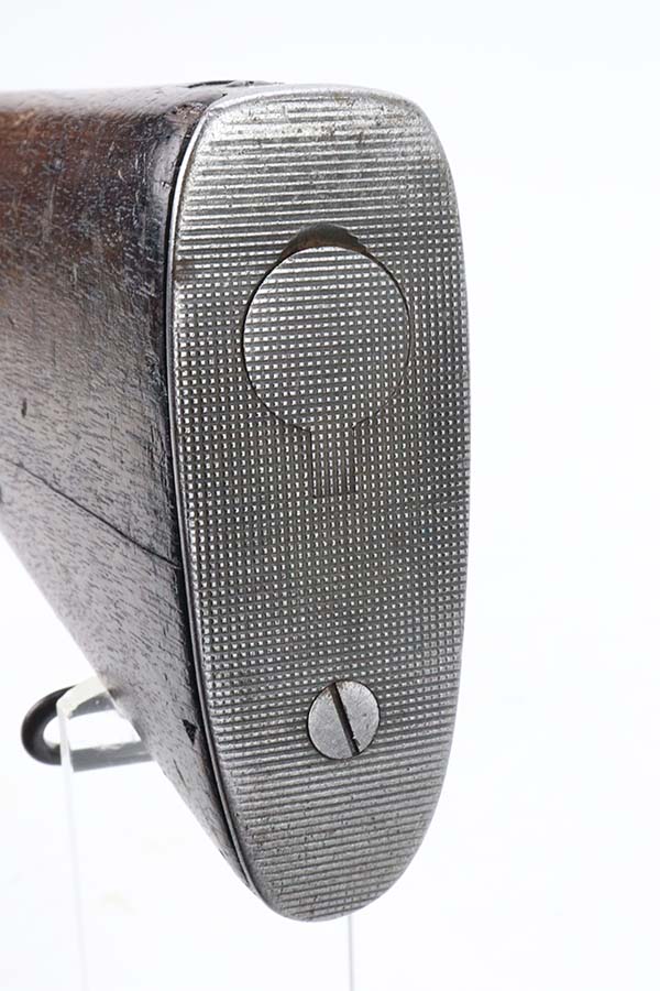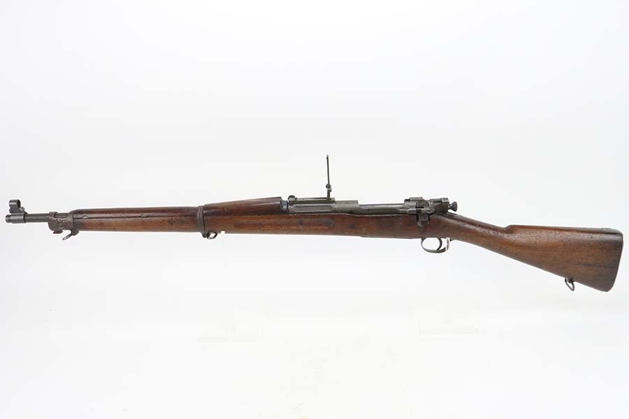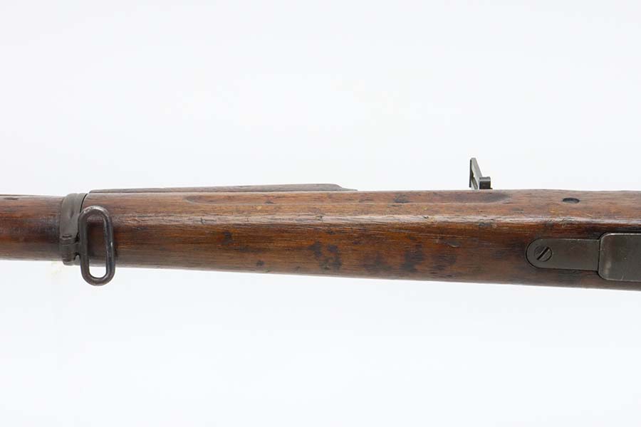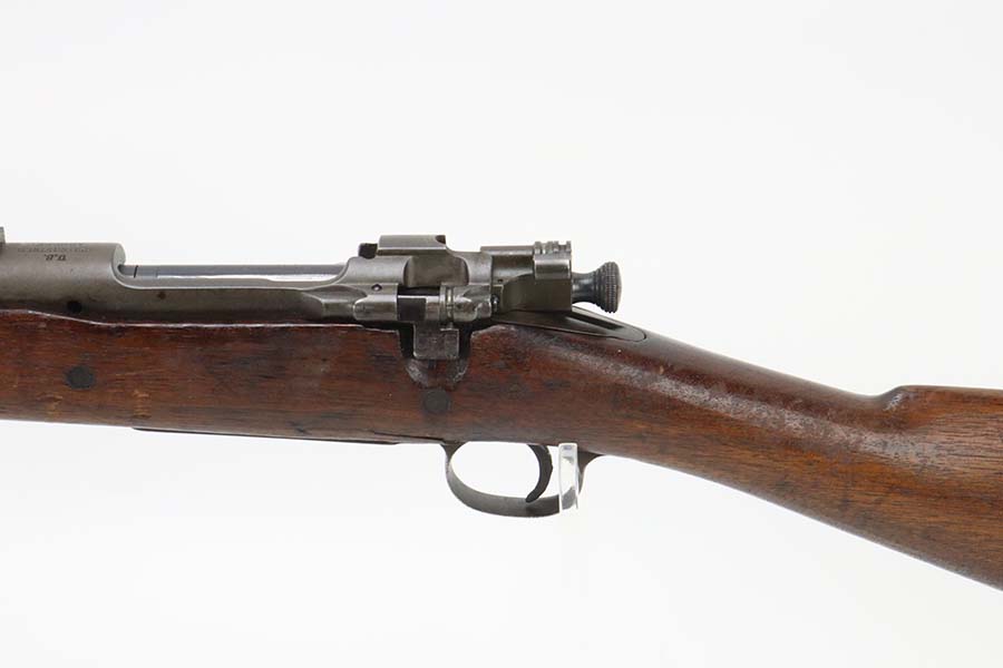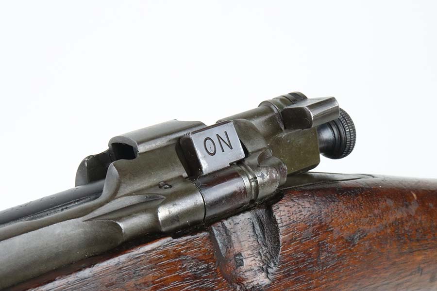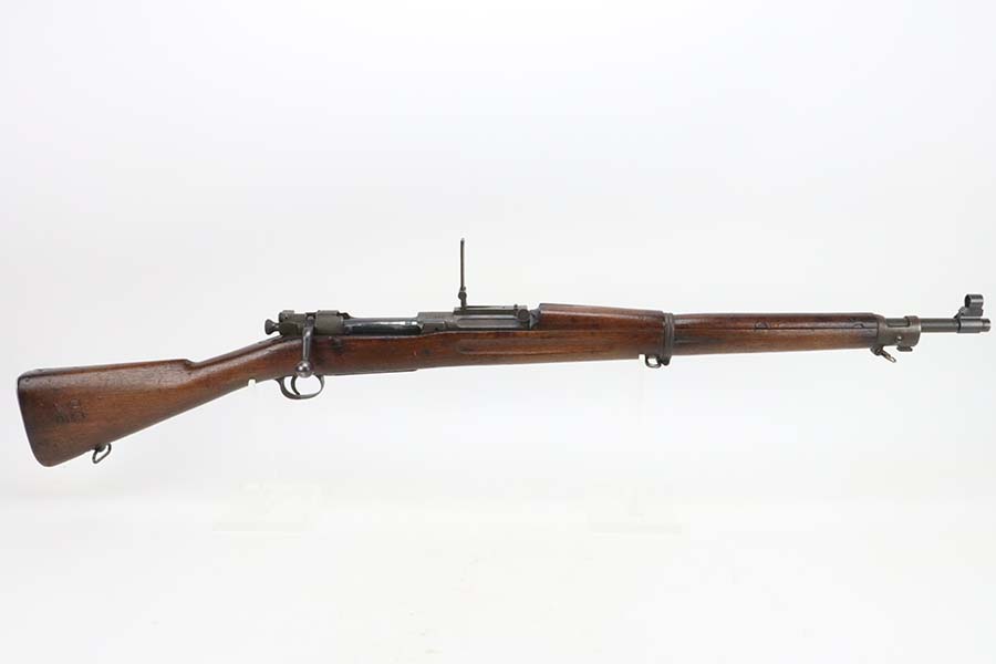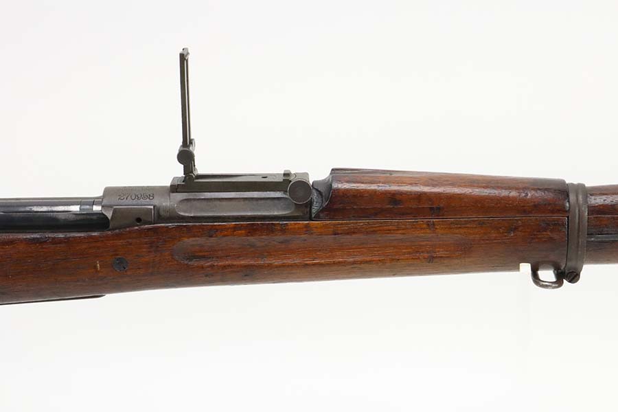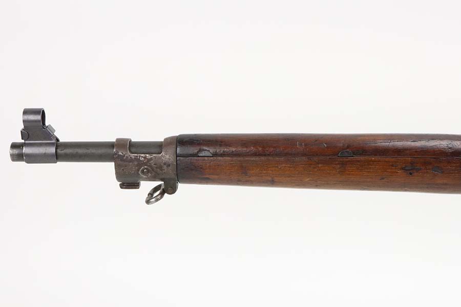 4/4/24 – This is a very nice example of a Springfield Model 1903 rifle that was reworked by the United States Marine Corp for WW2. The receiver is marked Springfield, numbered with an early serial from 1906, and features a “Hatcher Hole” on the left side. The barrel is marked “U.S.M.C.” and dated “9-41” with a “s” within a circle stamped below, indicating this barrel is a Sedgely barrel reworked into the rifle for WW2. Other USMC attributes include electro-pencil numbering on the bolt and the checkered butt plate. The right side of the butt stock has a “QQ 46” marking. The finish on the metal parts rates roughly 90%. While there isn’t a ton of actual finish loss, there are areas of light brown patina throughout and some noticeable spotty oxidation on the front barrel band. The stock shows obvious sings of wear. A couple of very light hairline cracks in the butt stock and upper handguard. The bore has great rifling with very light frosting throughout.