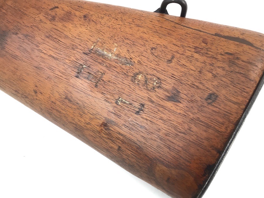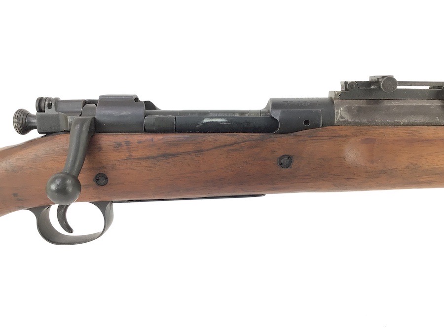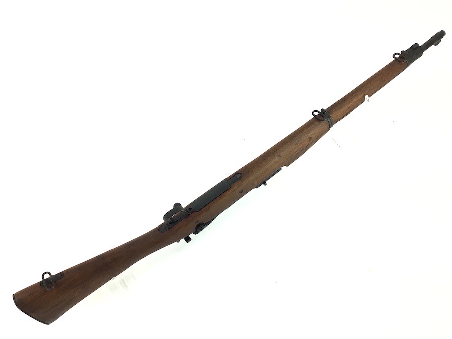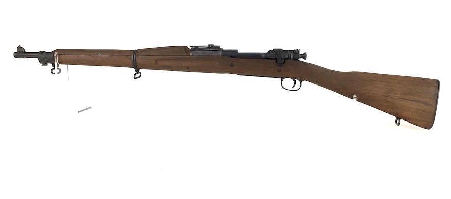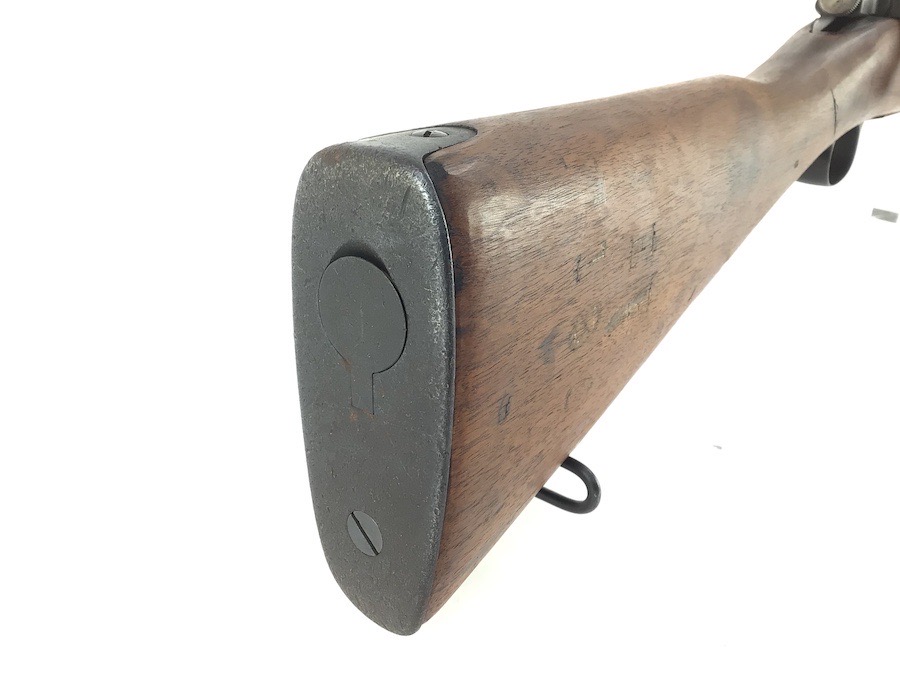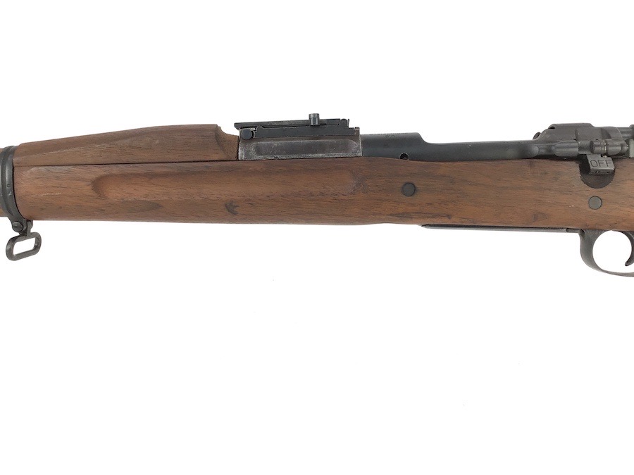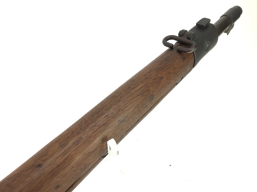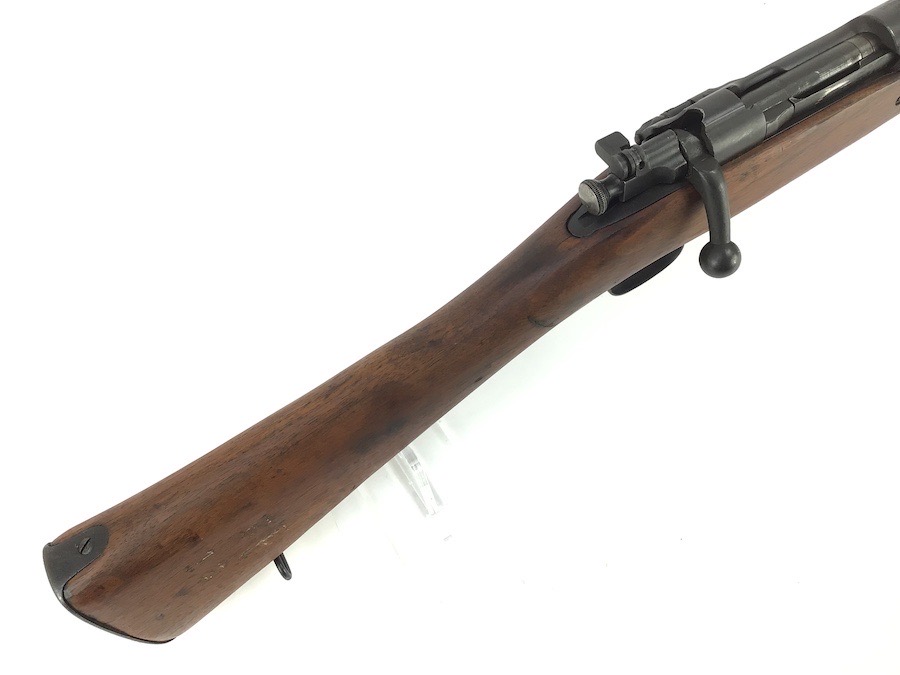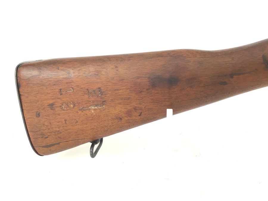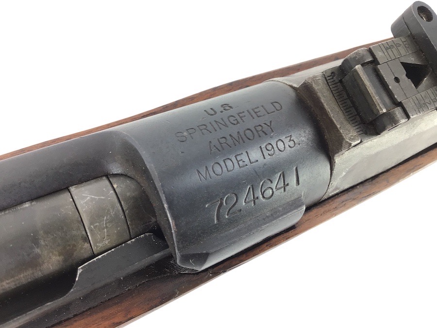 11/9/23 – This is a great example of a Springfield Model 1903 bolt action rifle. The serial number on the receiver dates to 1917. The barrel is date stamped at the muzzle November of 1917, along with the flaming bomb. The wood stock is un-marked except for some faint numbering on the right side of the butt stock and shows a few minor dings and wear. The upper fore guard appears to be a replacement. The receiver may have been refurbished some time in the past, but the chamber area appears original with worn bluing. The bolt is stamped with “36” just behind the handle. The barrel bands appear replaced as well. The bore is shiny with very strong rifling and rates a strong 8 of 10. Fully functional piece with smooth action.