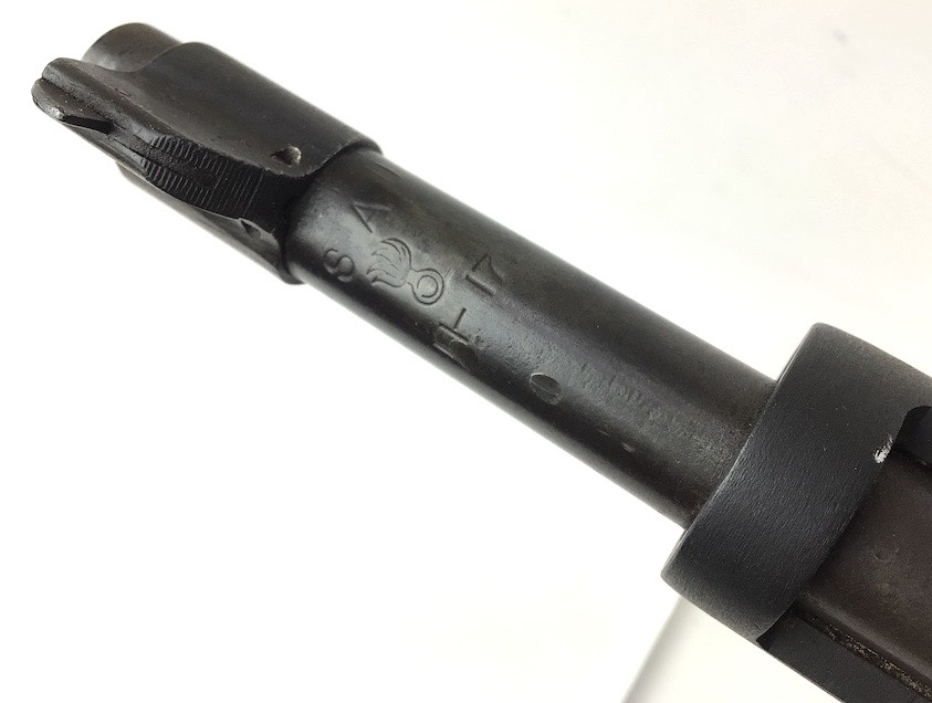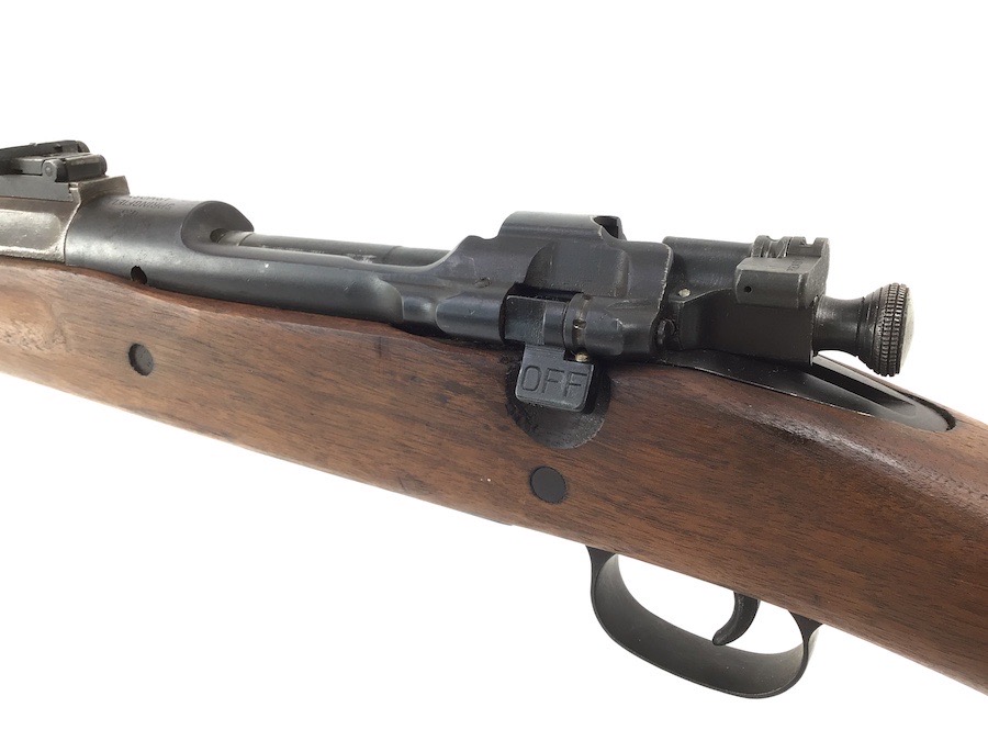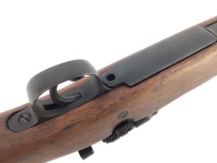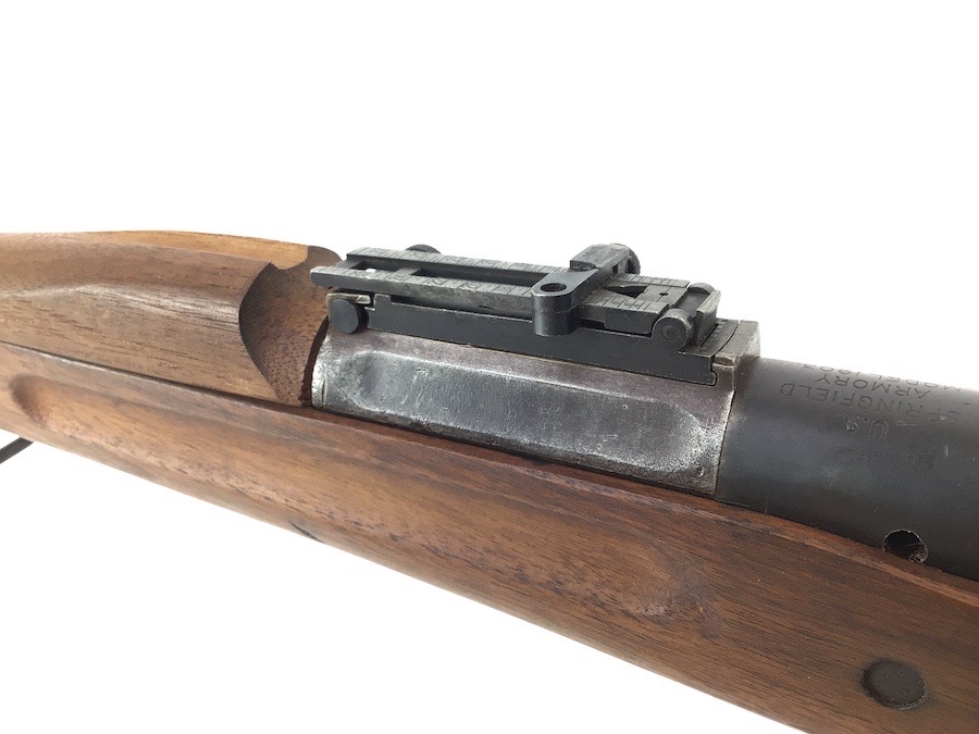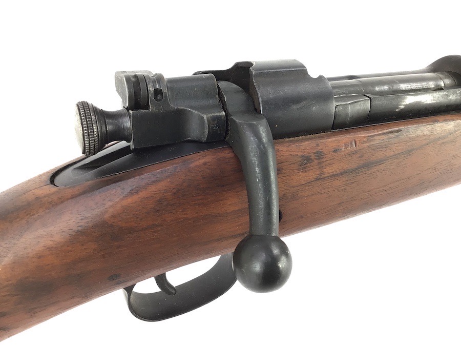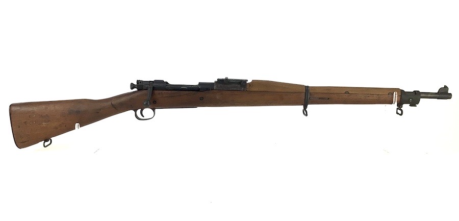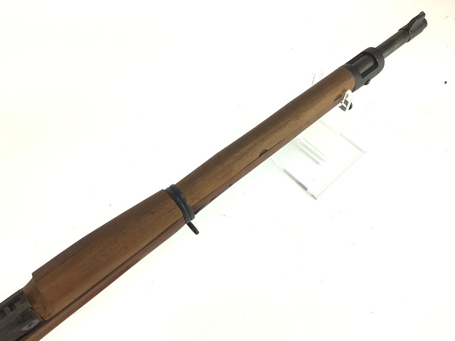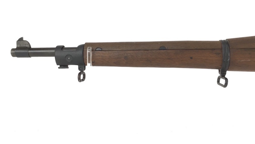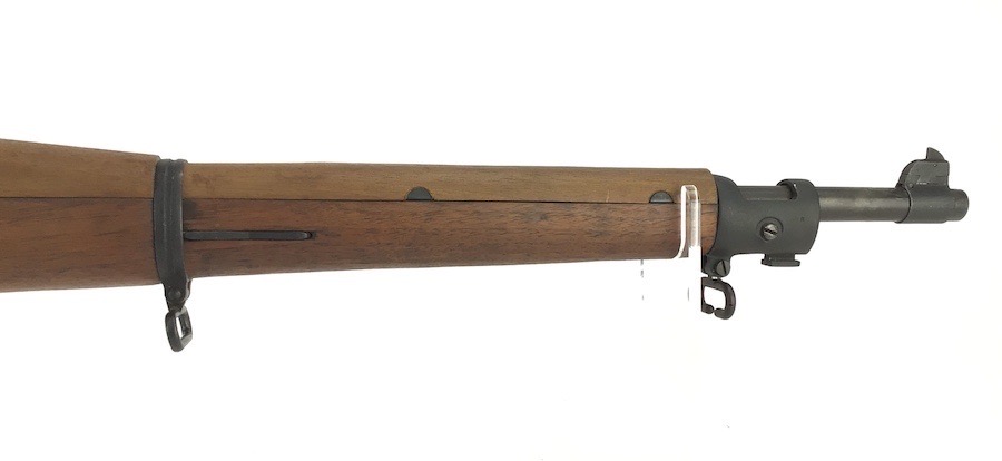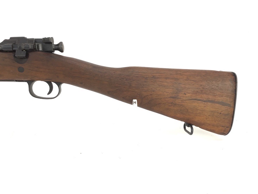 11/9/23 – This is a great example of a Springfield Model 1903 bolt action rifle. The serial number on the receiver dates to 1917. The barrel is date stamped at the muzzle November of 1917, along with the flaming bomb. The wood stock is un-marked except for some faint numbering on the right side of the butt stock and shows a few minor dings and wear. The upper fore guard appears to be a replacement. The receiver may have been refurbished some time in the past, but the chamber area appears original with worn bluing. The bolt is stamped with “36” just behind the handle. The barrel bands appear replaced as well. The bore is shiny with very strong rifling and rates a strong 8 of 10. Fully functional piece with smooth action.