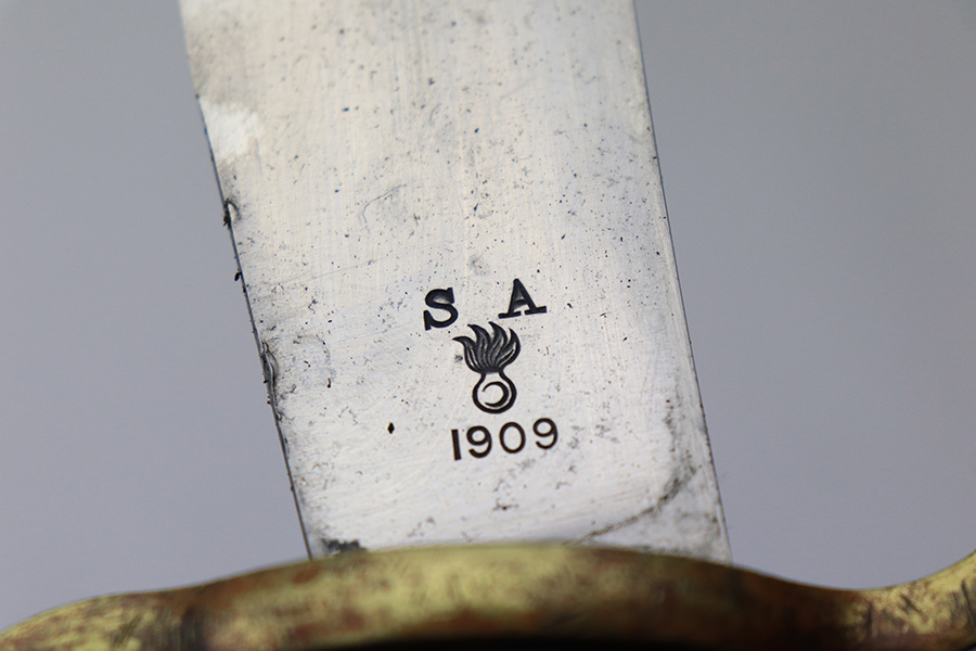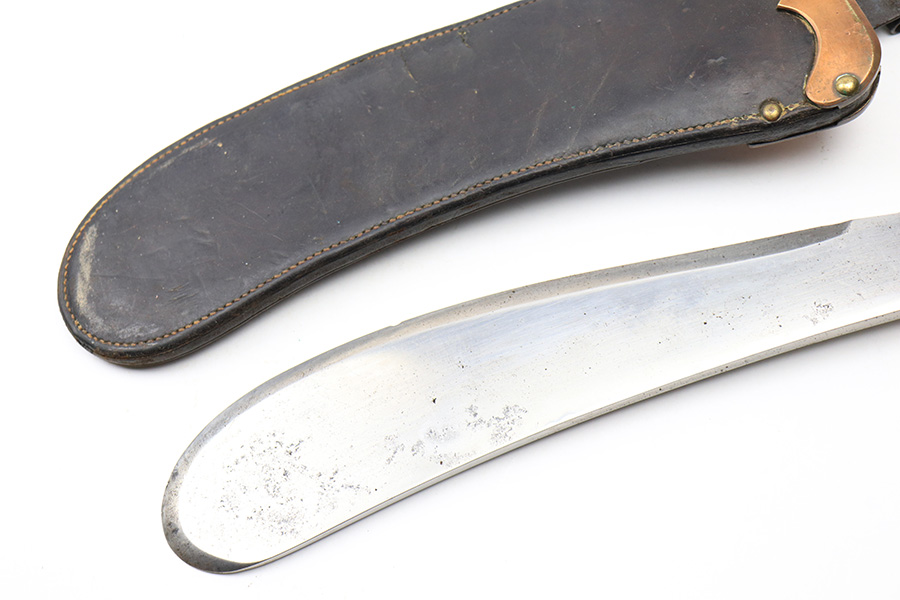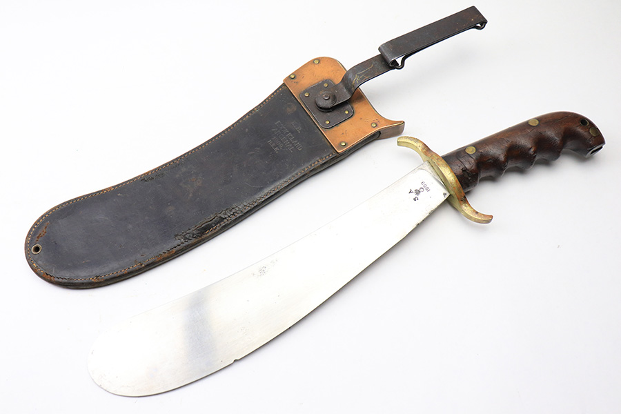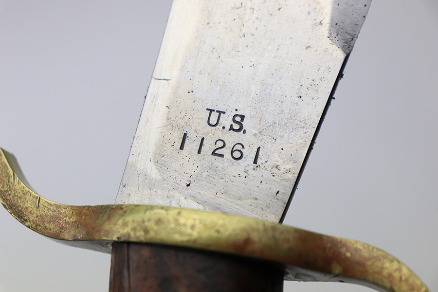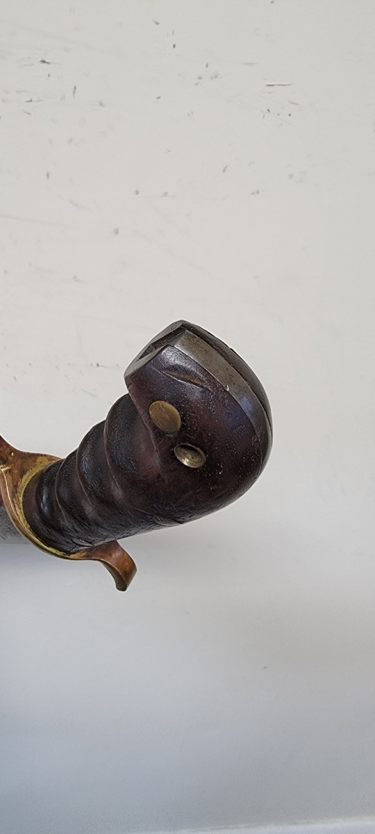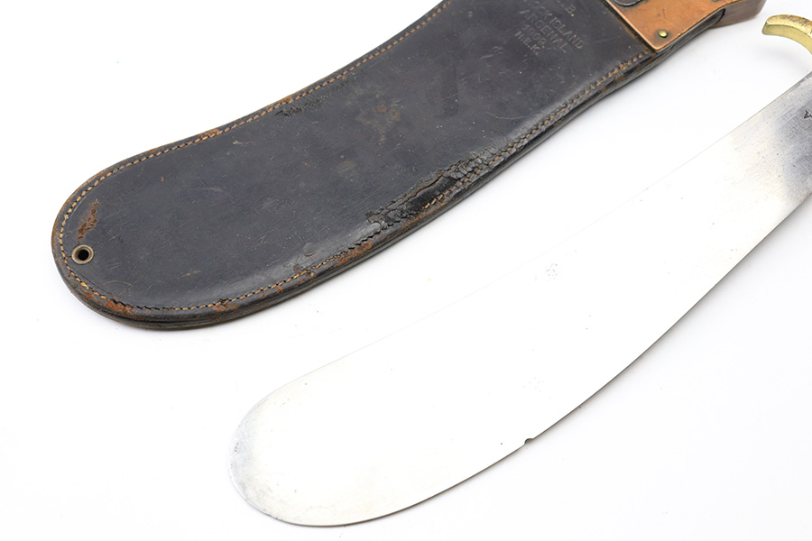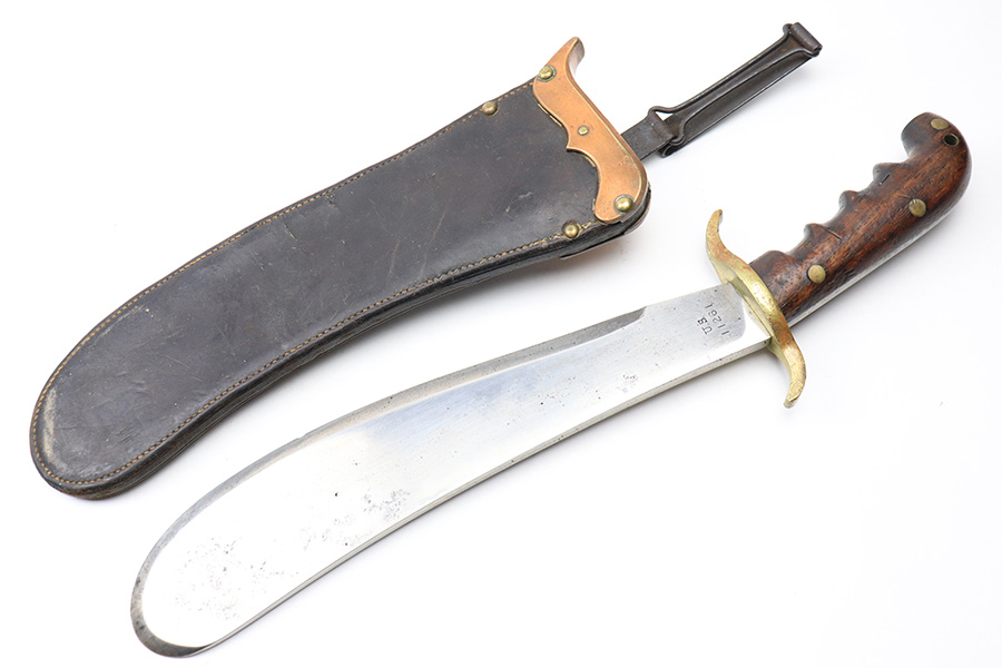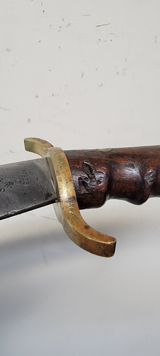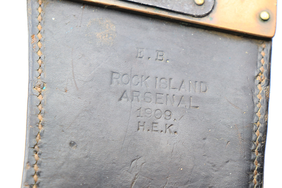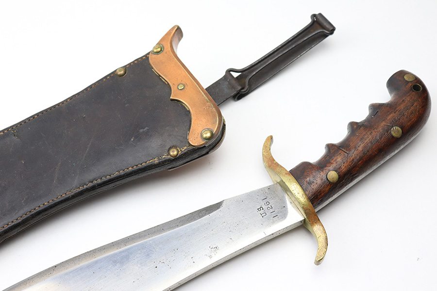 6/2/22 – This is an early / pre WW1 production US Military M1909 bolo knife. The knife comes with an original and complete 1909 dated scabbard with metal belt hanger. The blade is in great condition with an ordnance stamp, maker stamp, and date stamp on one side of the base. The reverse is US stamped and serial numbered. There’s some spotty discoloration on the blade and a small chip along the edge. The wood handles have a few small chips in them but no major issues and all three rivets in tact. The scabbard is excellent and has a maker stamp and date on the back.