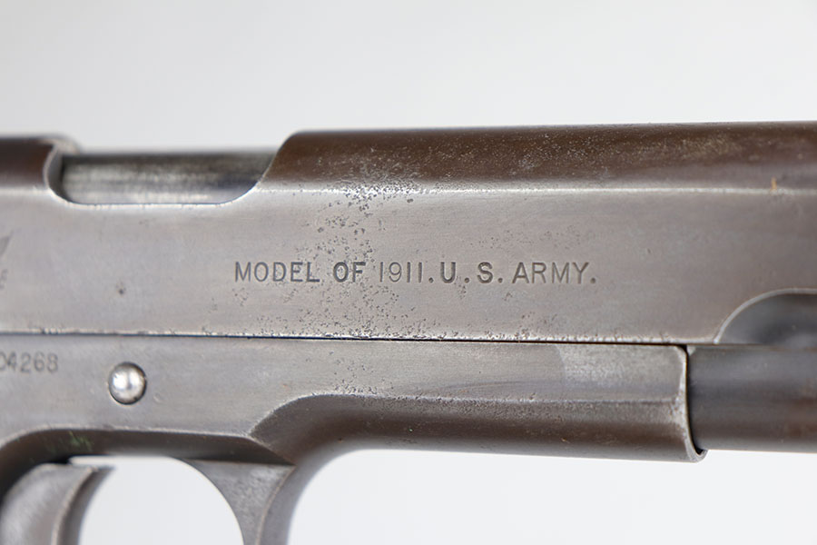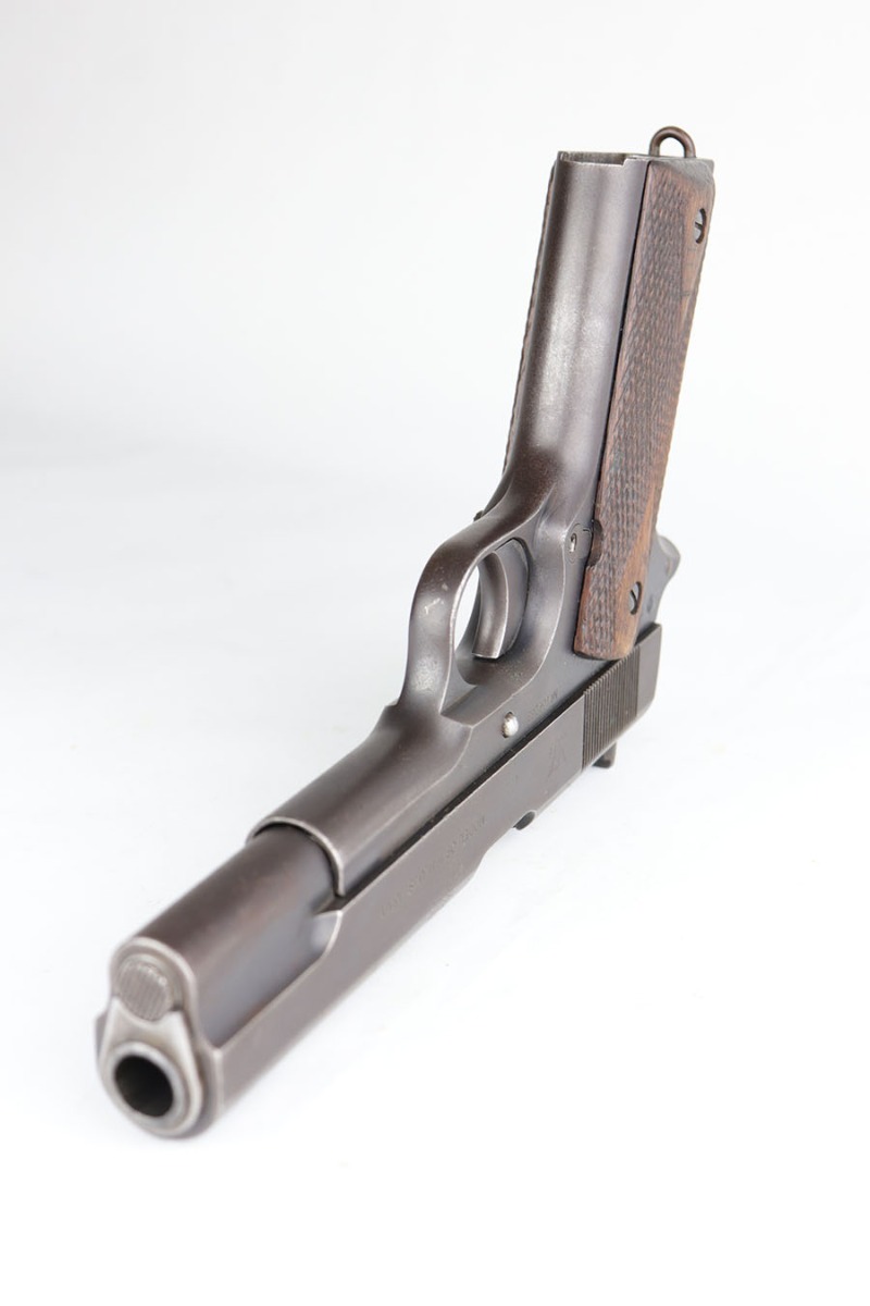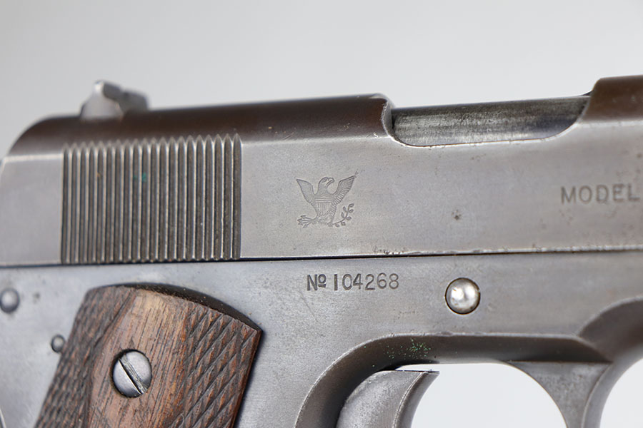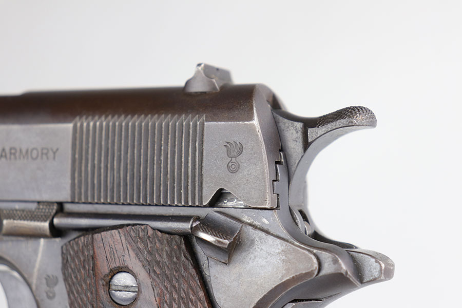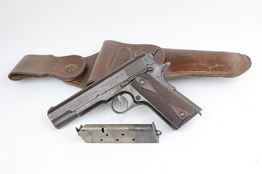 5/6/20 – This is an original example of the hard-to-find Springfield Armory M1911. Made in either late 1914 or early 1915, this pistol features 70-80% original blue with notable patina throughout. There are also several minor areas of surface freckling. Flaming bomb on slide and frame. There were only ~30,000 of these produced from 1914-16. It has a Springfield barrel (S and P marked) with a minty bore. Correct Two-tone magazine with lanyard loop. Rare original Springfield grips. All small parts are original and correct Springfield, many marked with an S. Bore shows some use and rifling is a bit smoothed out. Pistol comes with a very nice US marked holster.