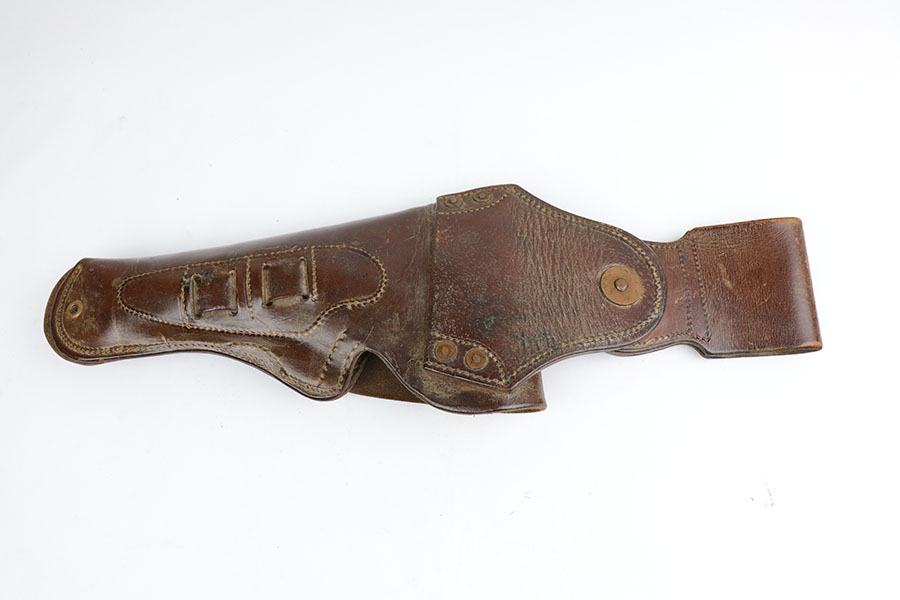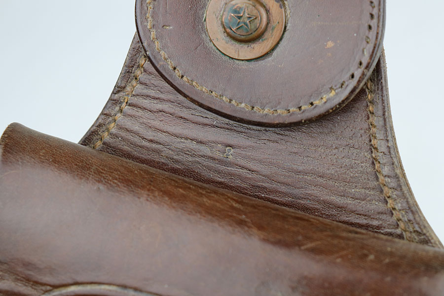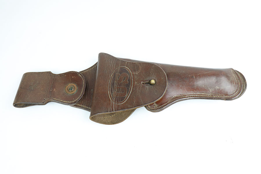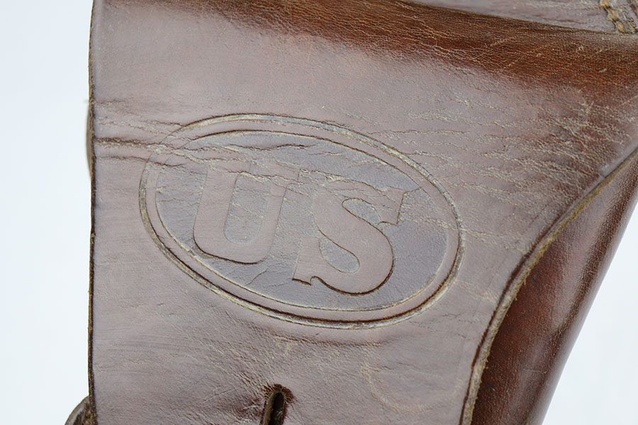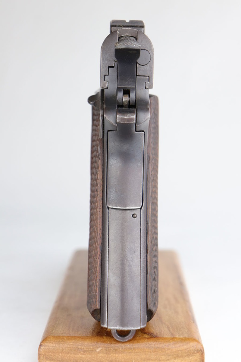 5/6/20 – This is an original example of the hard-to-find Springfield Armory M1911. Made in either late 1914 or early 1915, this pistol features 70-80% original blue with notable patina throughout. There are also several minor areas of surface freckling. Flaming bomb on slide and frame. There were only ~30,000 of these produced from 1914-16. It has a Springfield barrel (S and P marked) with a minty bore. Correct Two-tone magazine with lanyard loop. Rare original Springfield grips. All small parts are original and correct Springfield, many marked with an S. Bore shows some use and rifling is a bit smoothed out. Pistol comes with a very nice US marked holster.
