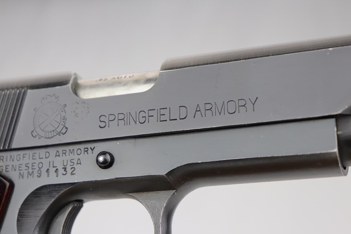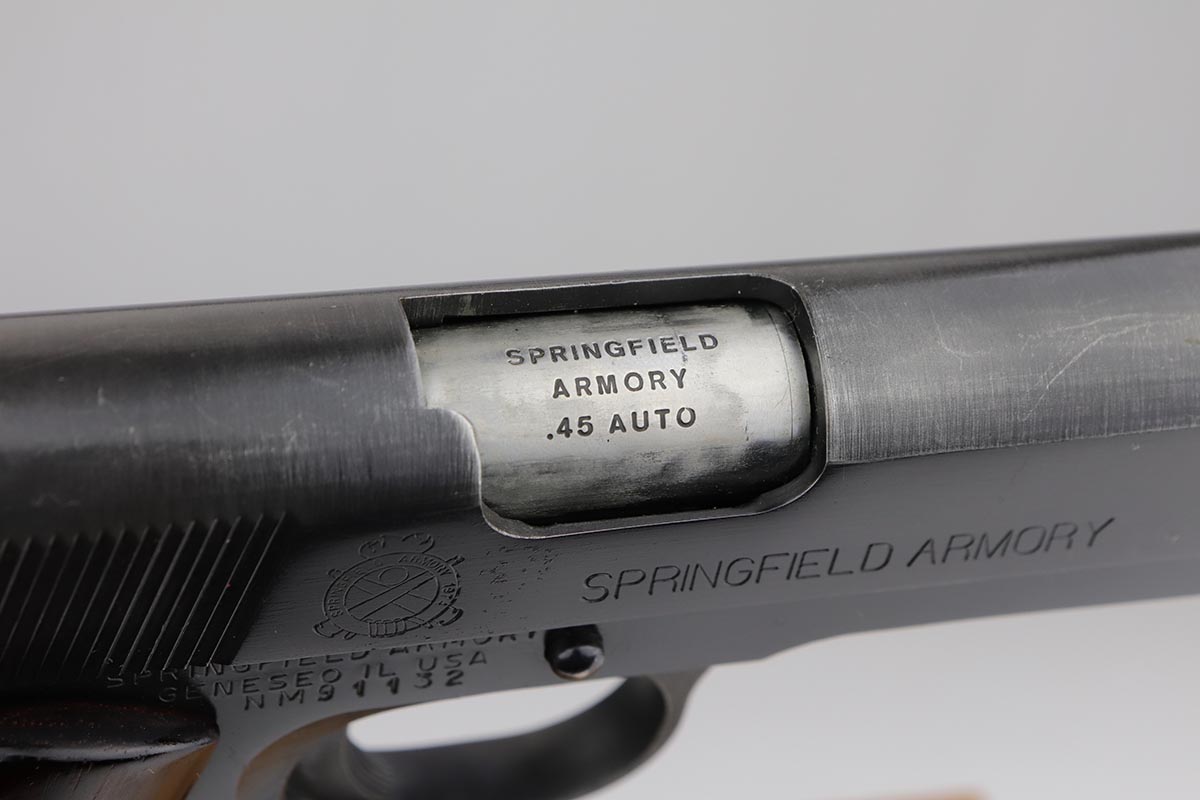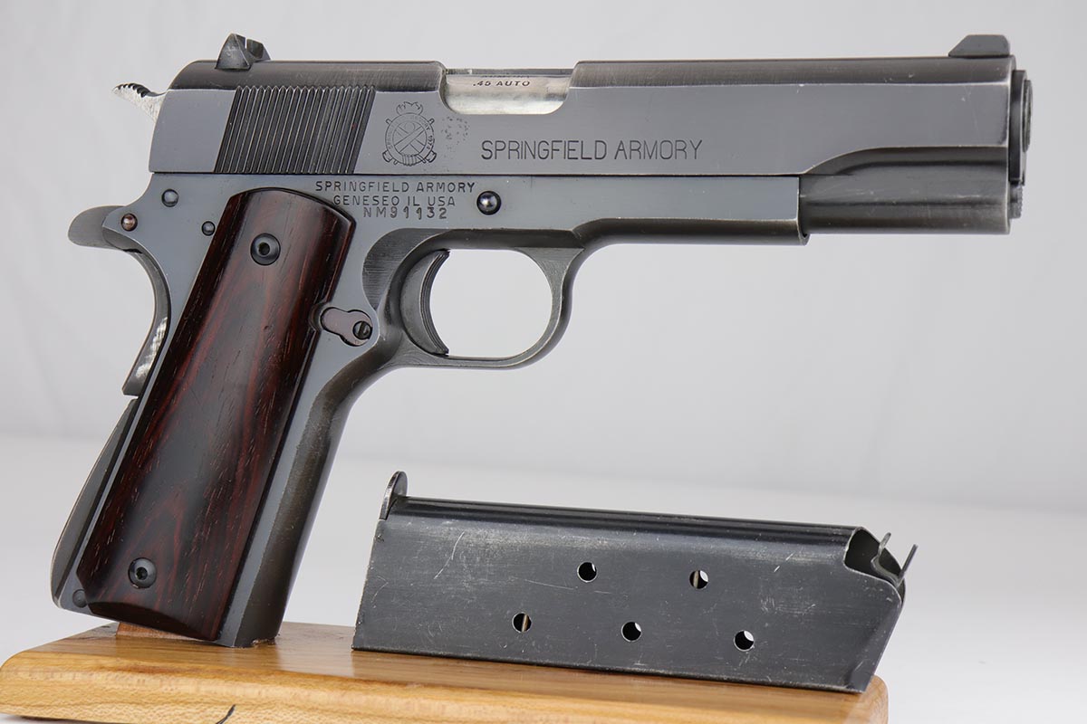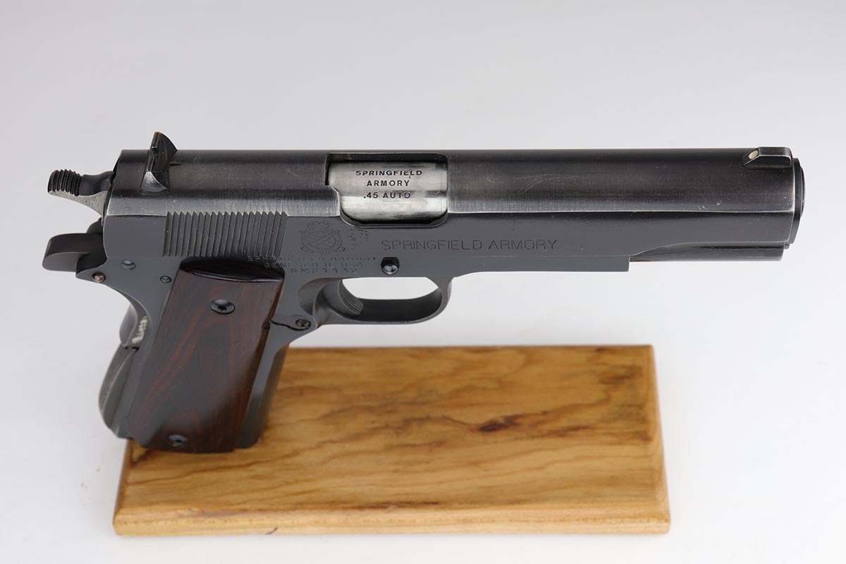 1/9/23 – This is an excellent Springfield Armory 1911-A1 that was made in May of 1990. The blued finish rates at 97-98% with minor high edge wear, and some thinning of the grip safety. Minty bore. Excellent grips.