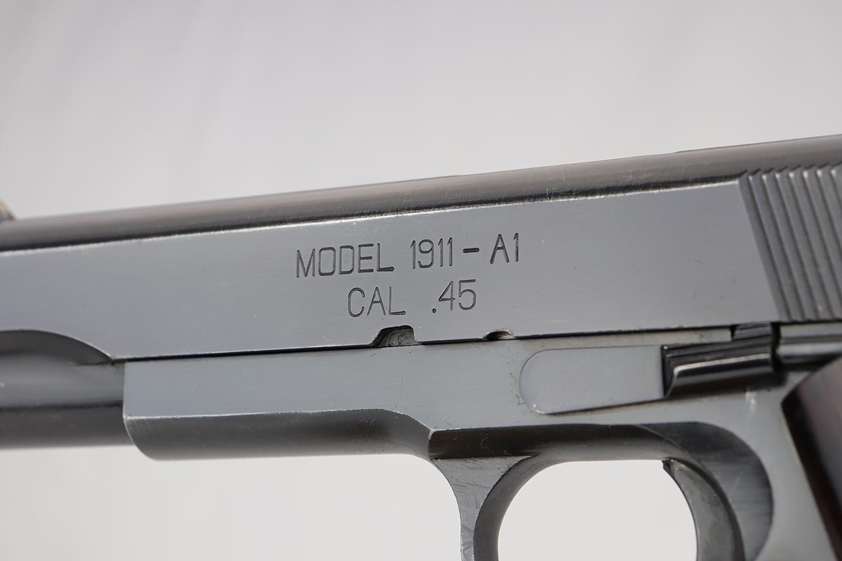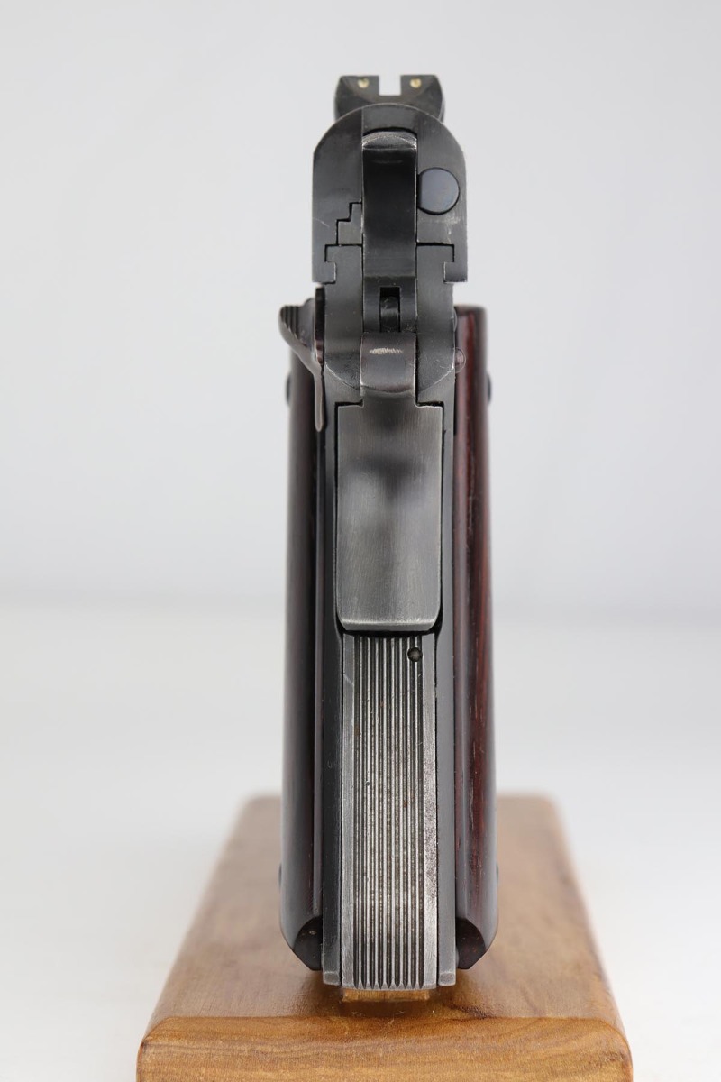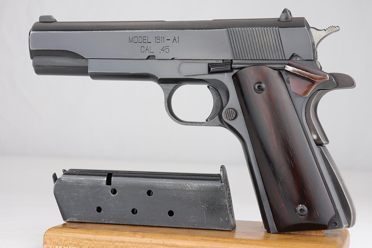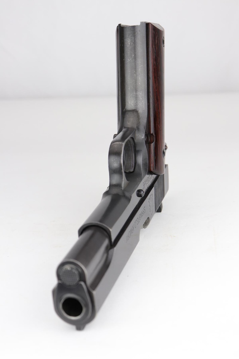 1/9/23 – This is an excellent Springfield Armory 1911-A1 that was made in May of 1990. The blued finish rates at 97-98% with minor high edge wear, and some thinning of the grip safety. Minty bore. Excellent grips.