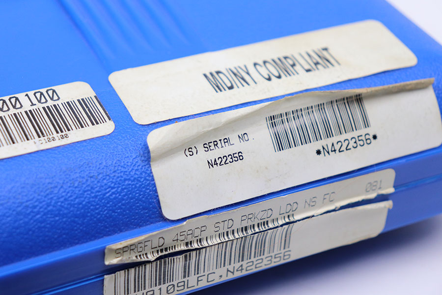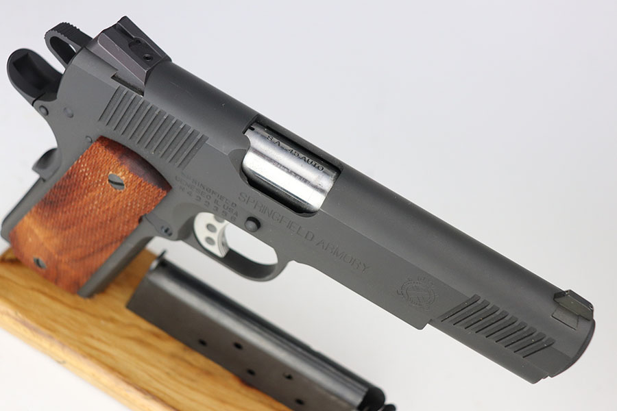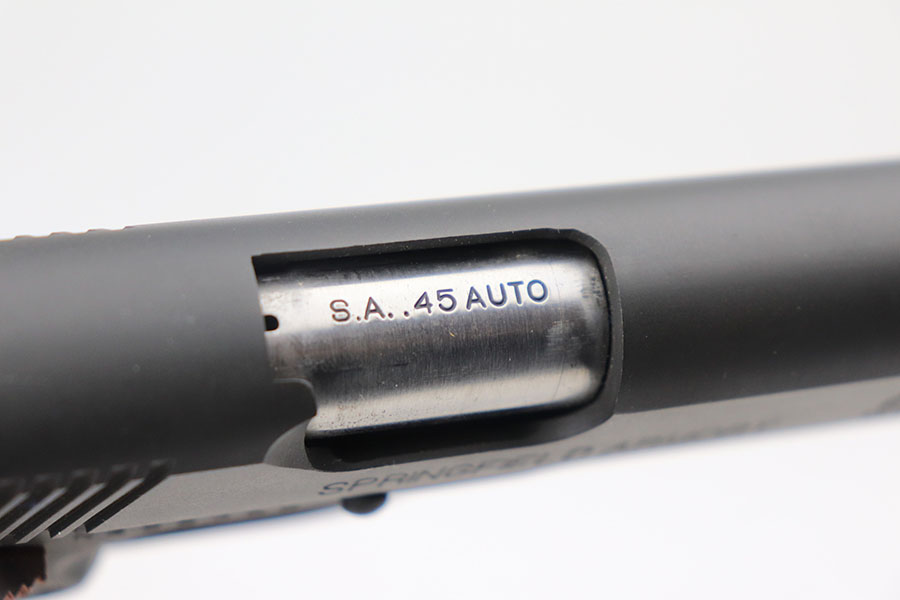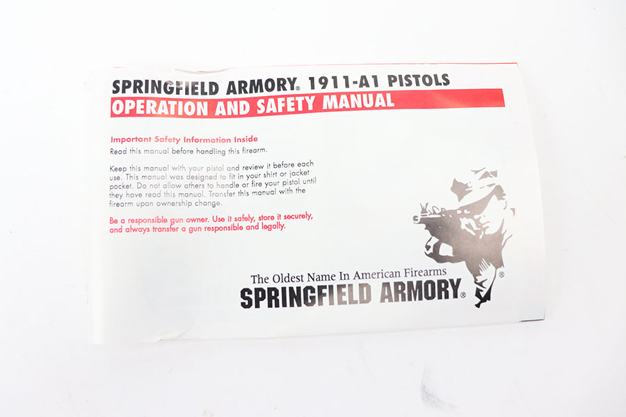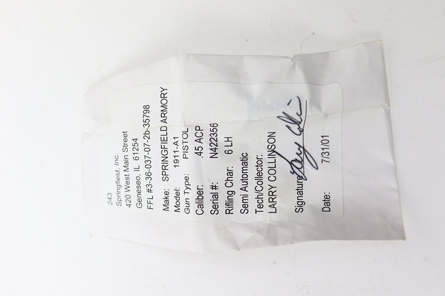 2/16/21 – This is an as-new, mint condition Springfield Armory model 1911A1. Comes with the original box, Springfield cloth, spare magazine, and the original test fire shell. The shell comes in an envelope dated 7/31/2001. We assume that means this was made sometime during 2001. The pistol appears to have not been fired since the test firing. Mechanically sound with sharp wood grips and a mint bore.