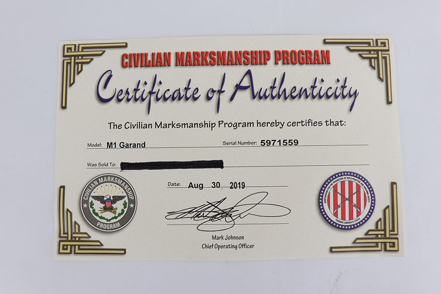 7/8/20 – This is a very nice Springfield Armory M1 Garand that was made in 1957. Barrel is HRA made and dated to June of 1952. Mint stock with P on wrist. This is a CMP gun and has the original serialized copy of the certificate from 2019. Little bit of wear on the bottom of the gas tube but minimal finish loss overall. There is some patina on the receiver and trigger group there. Terrific bore. Muzzle is a 1, throat is less than 1. Reproduction sling is present.
