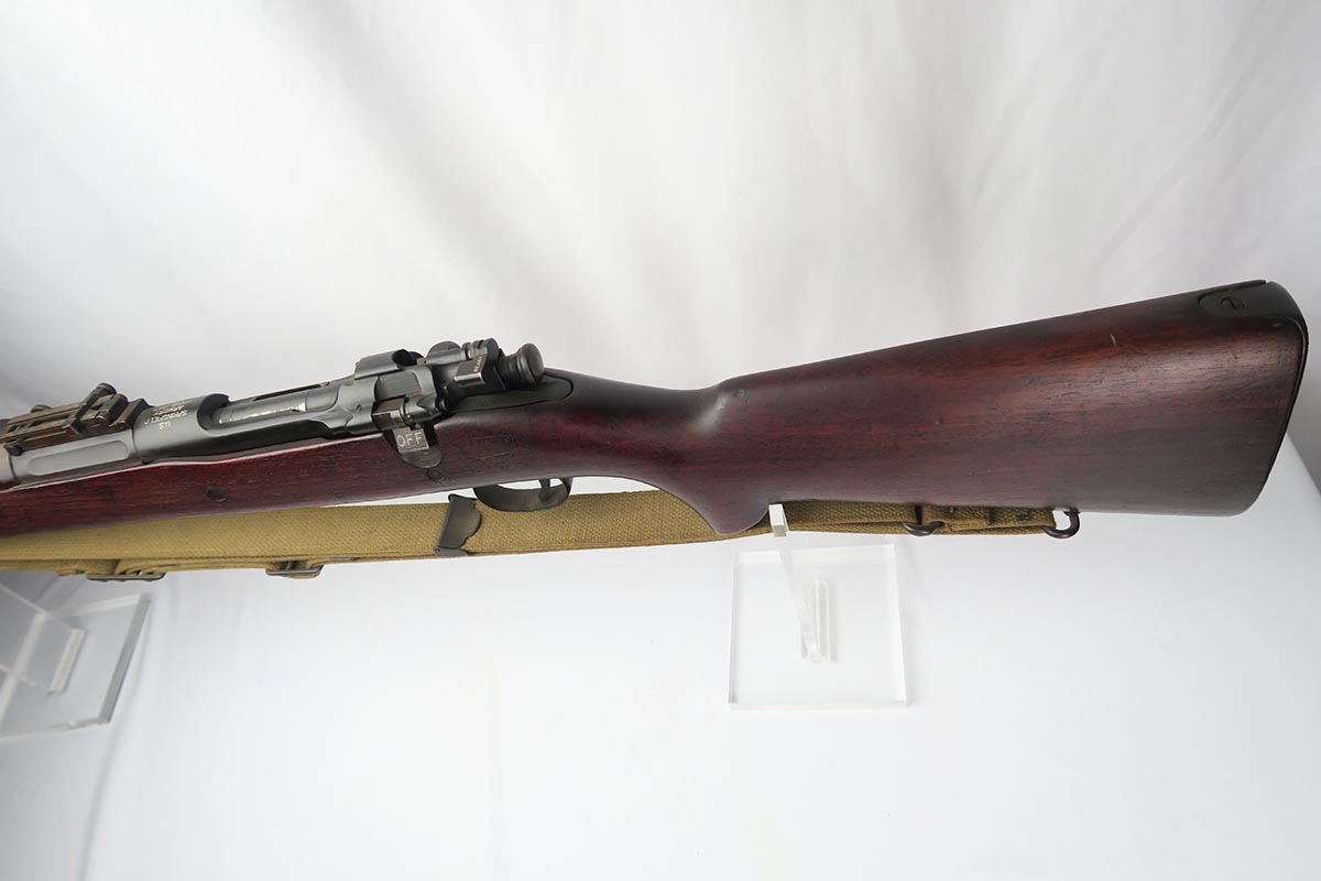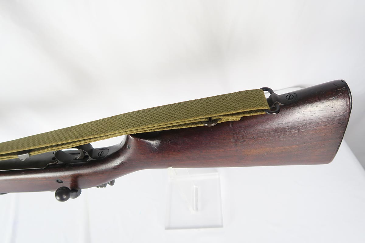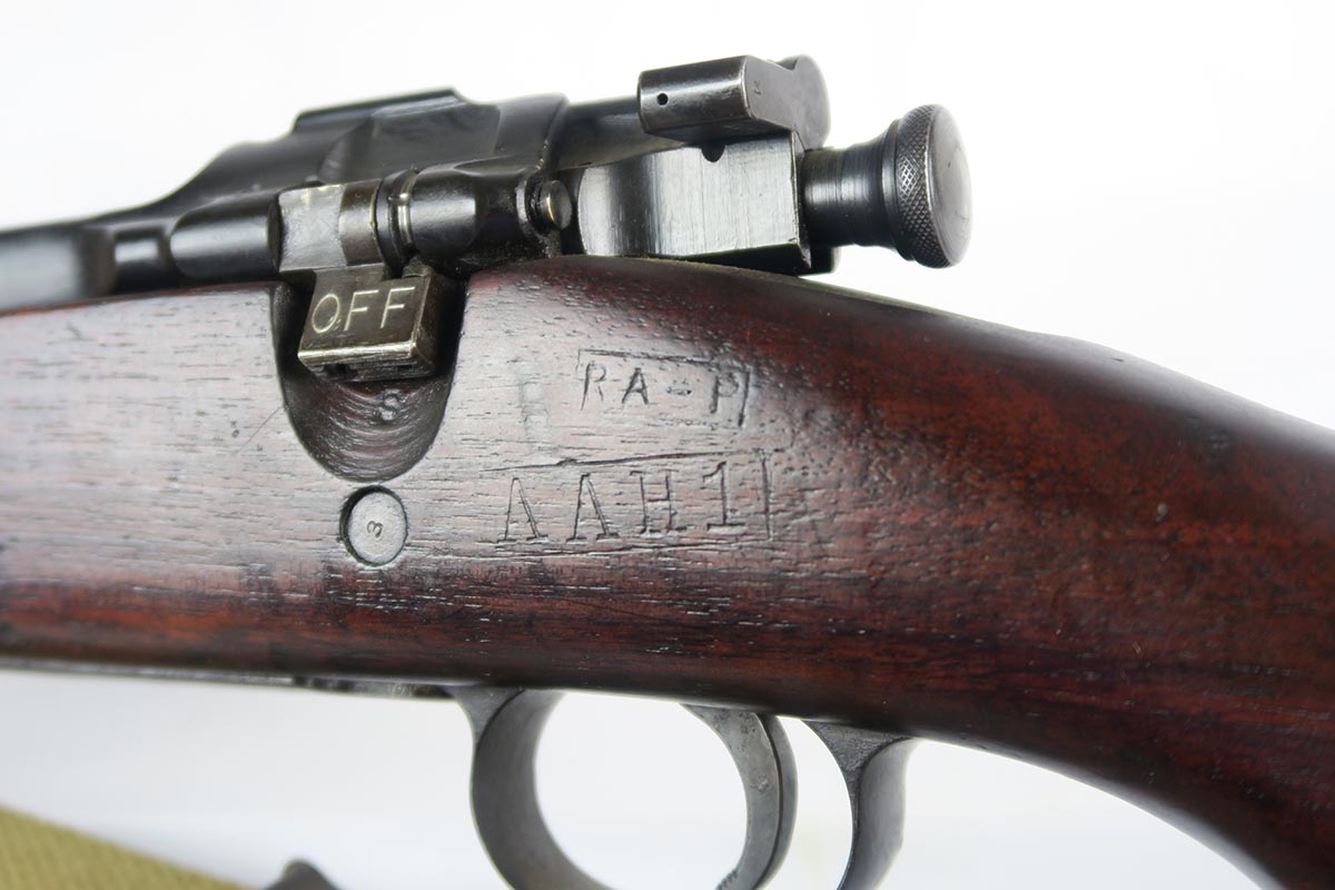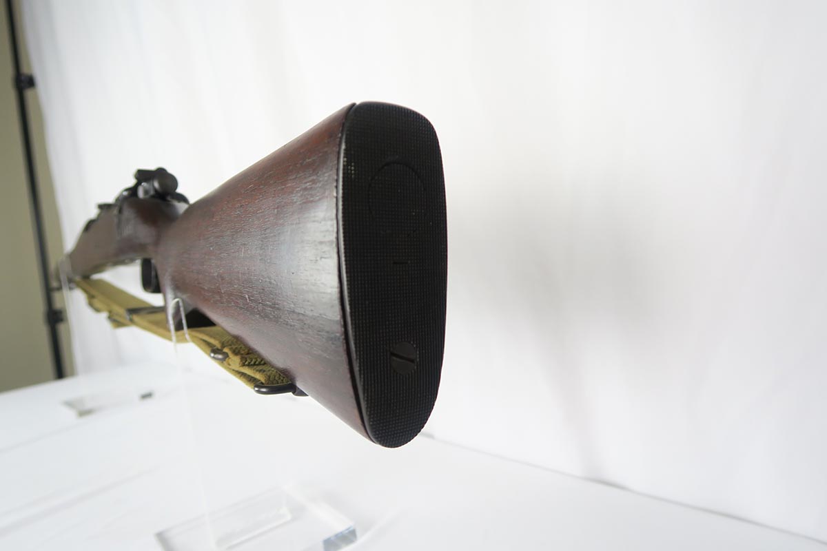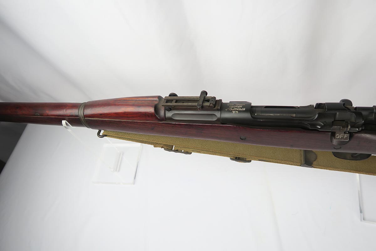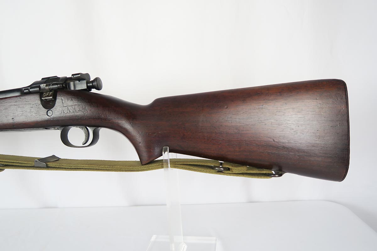 2/15/18 – This is a very nice example of a Springfield Armory M1903, manufactured in March of 1929. The M1903 Springfield, caliber .30-06, is an American five-round magazine fed, bolt-action service repeating rifle, used primarily during the first half of the 20th century. It was officially adopted as a United States military bolt-action rifle on June 19, 1903, and saw service in World War I. It was officially replaced as the standard infantry rifle by the faster-firing semi-automatic eight-round M1 Garand starting in 1936. However, the M1903 Springfield remained in service as a standard issue infantry rifle during World War II, since the U.S. entered the war without sufficient M1 rifles to arm all troops. This particular rifle was manufactured between the wars, and has an excellent stock with no notable cracks or chips. The metal finish is very good as well, with patina coming through but only the front sight showing much finish loss. The sling appears original but is unmarked. The bore has strong rifling with minor residue but looks like it would clean out and still fire/function correctly. Some of the residue might be minor corrosion. The left side stock is marked RA-P, denoting Raritan Arsenal rebuild. It also has an Augusta Arsenal cartouche (AAH1).