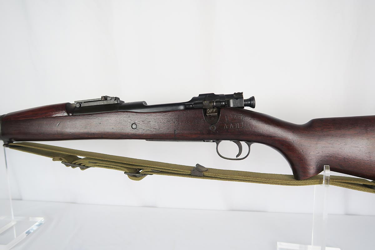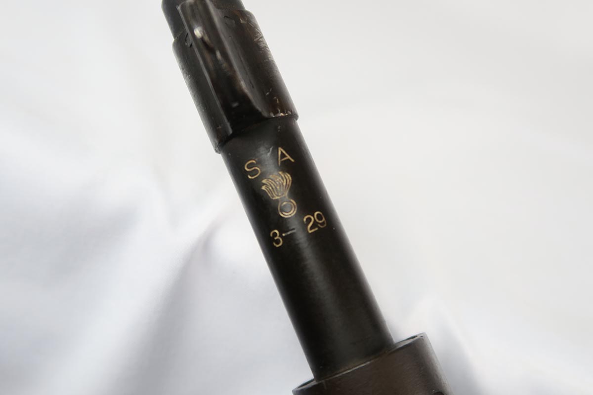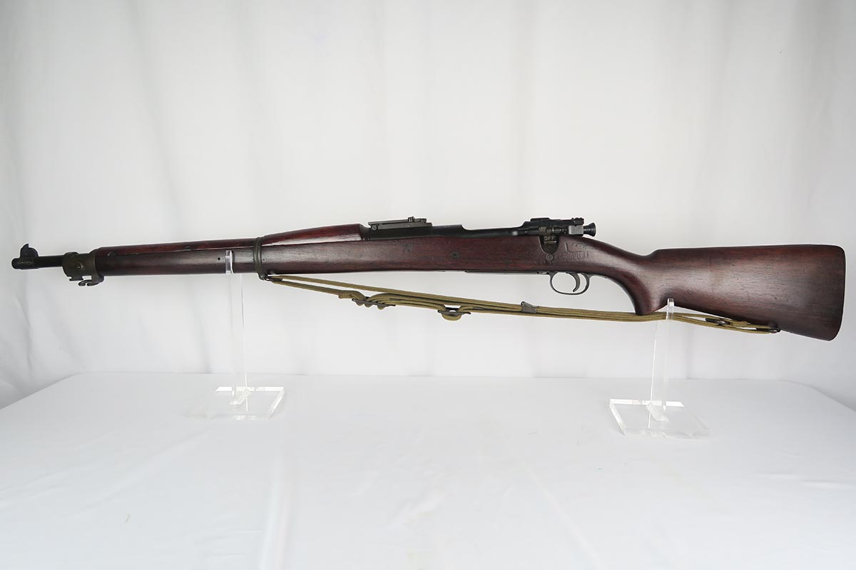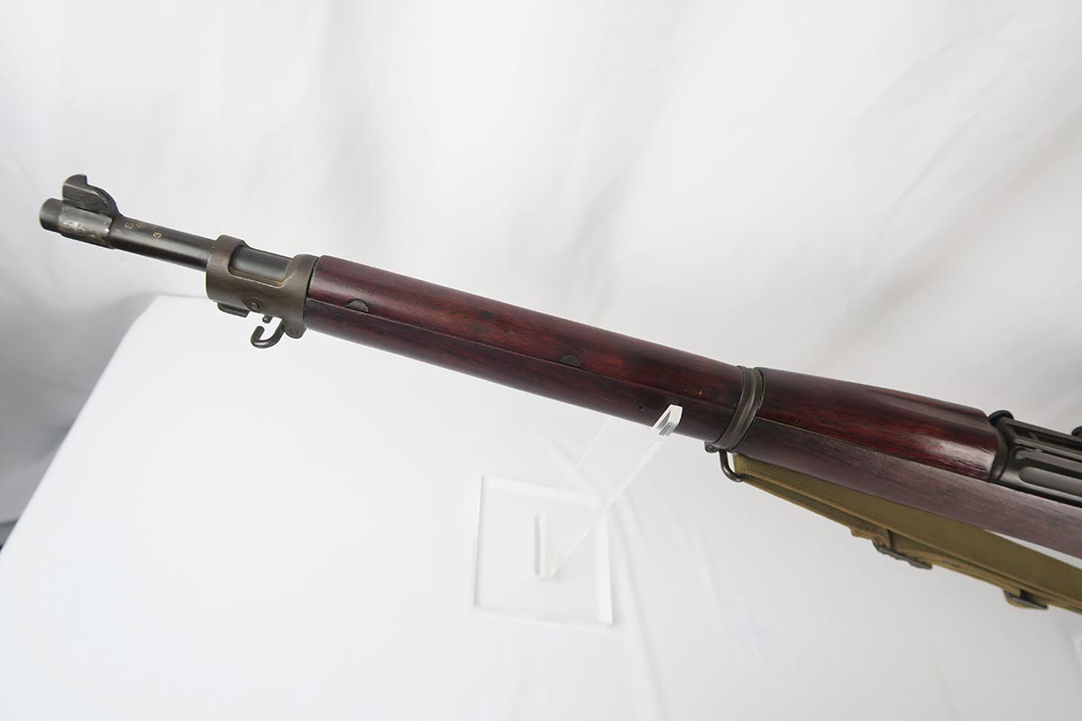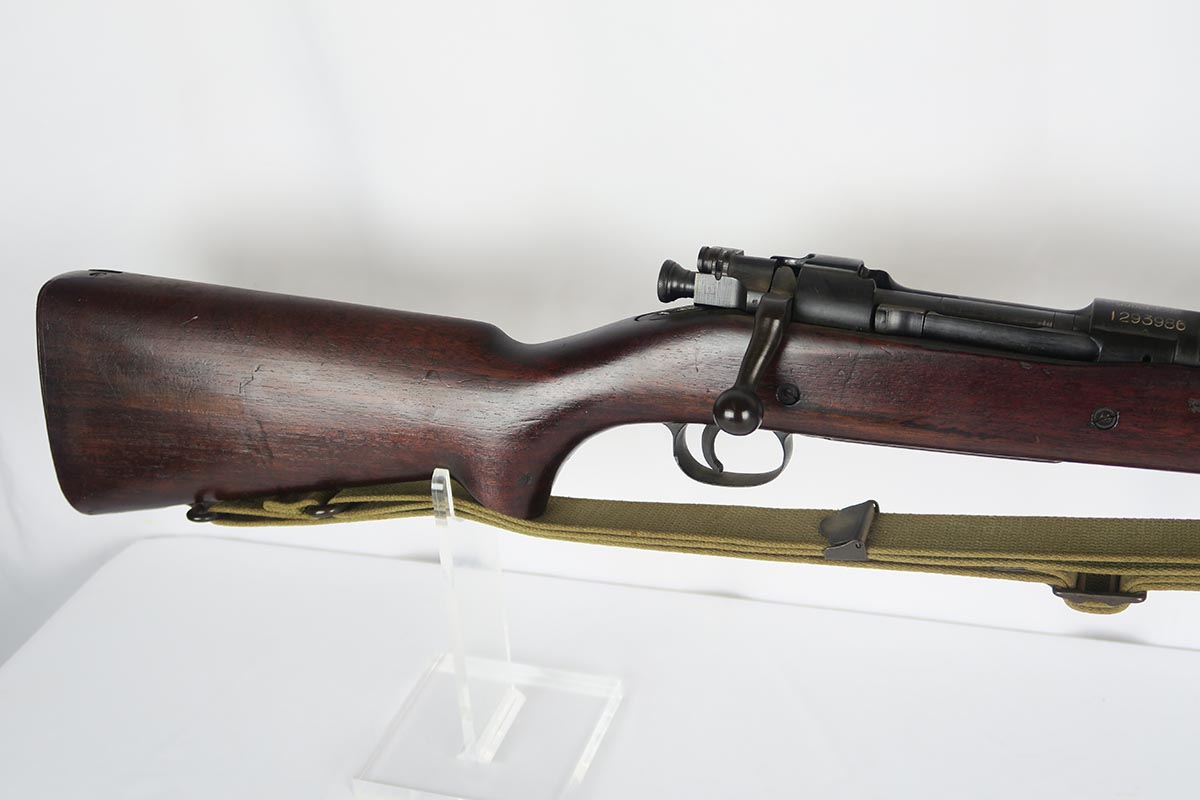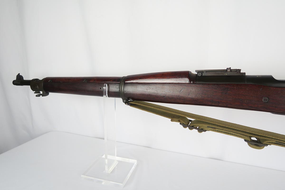 2/15/18 – This is a very nice example of a Springfield Armory M1903, manufactured in March of 1929. The M1903 Springfield, caliber .30-06, is an American five-round magazine fed, bolt-action service repeating rifle, used primarily during the first half of the 20th century. It was officially adopted as a United States military bolt-action rifle on June 19, 1903, and saw service in World War I. It was officially replaced as the standard infantry rifle by the faster-firing semi-automatic eight-round M1 Garand starting in 1936. However, the M1903 Springfield remained in service as a standard issue infantry rifle during World War II, since the U.S. entered the war without sufficient M1 rifles to arm all troops. This particular rifle was manufactured between the wars, and has an excellent stock with no notable cracks or chips. The metal finish is very good as well, with patina coming through but only the front sight showing much finish loss. The sling appears original but is unmarked. The bore has strong rifling with minor residue but looks like it would clean out and still fire/function correctly. Some of the residue might be minor corrosion. The left side stock is marked RA-P, denoting Raritan Arsenal rebuild. It also has an Augusta Arsenal cartouche (AAH1).