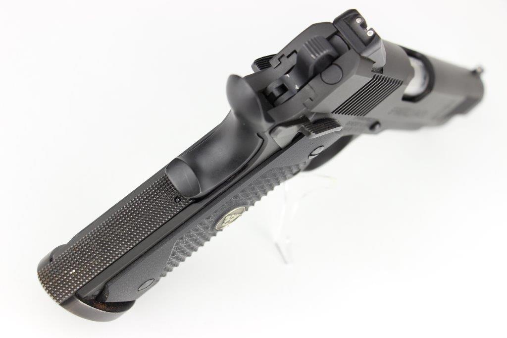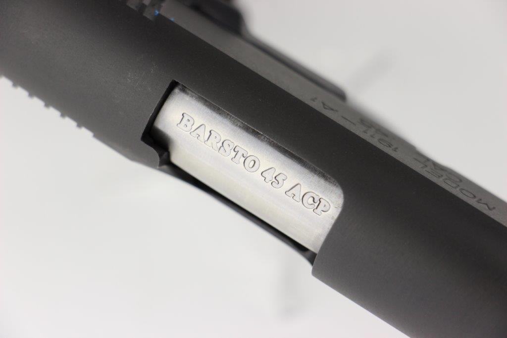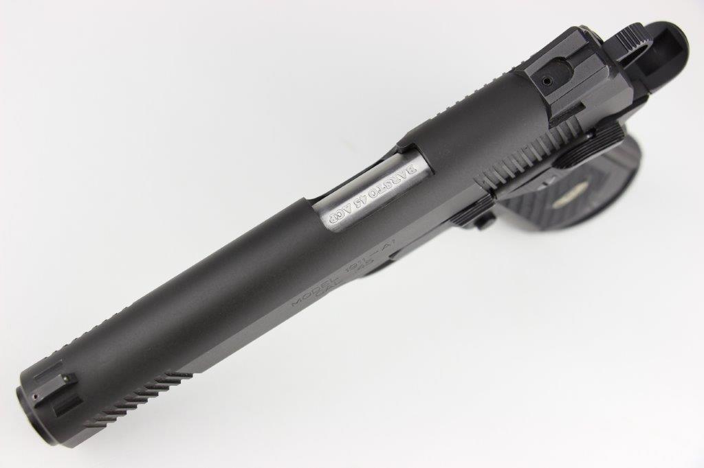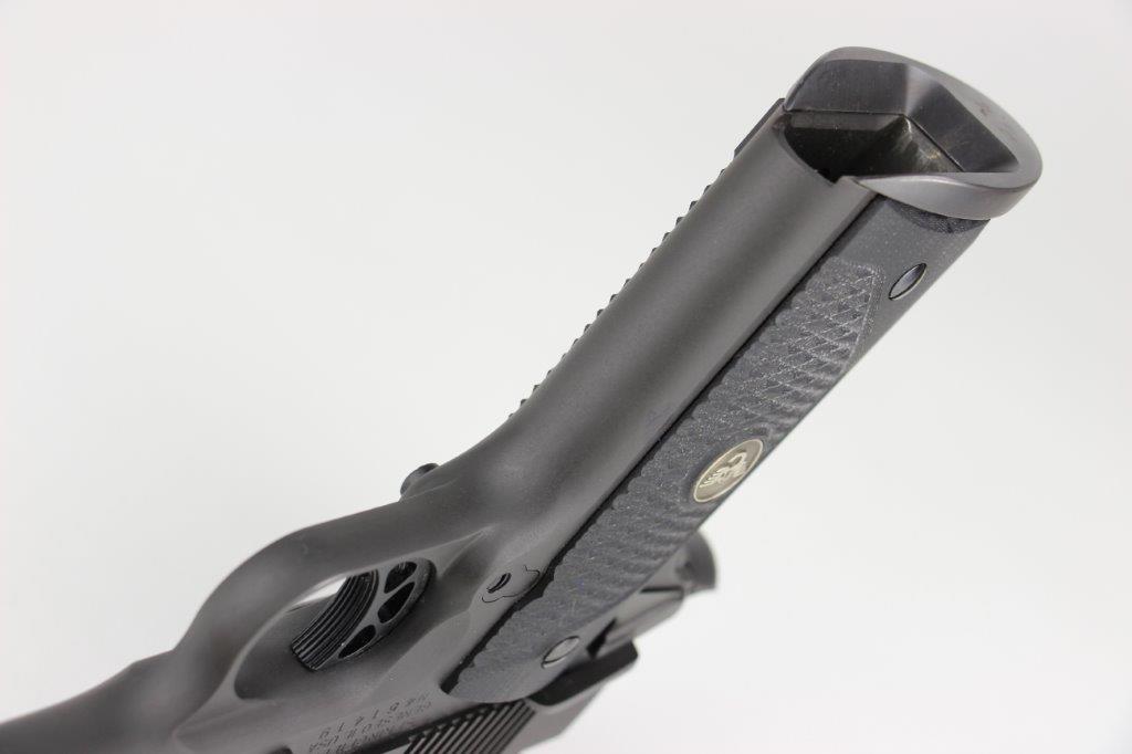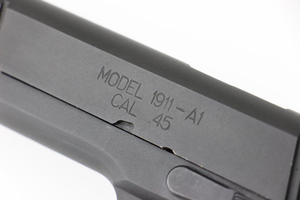 6/20/24 – This is a Springfield Armory M1911A1 pistol with extras, including: 4 total magazines, leather low-profile belt holster, ALLEN carrying case, 1911 Micro Tool, and a spare pair of wooden grips. The current grips on the pistol are custom black carbon grips. The barrel is a custom BARSTO barrel with a clean stainless steel finish. The bore rates around 9/10 with some light patina in the grooves but strong rifling and clean throughout. The pistol is mechanically sound and in excellent condition, which we rate around 99% overall. Light handling wear but no major issues. FFL required (not C&R eligible).