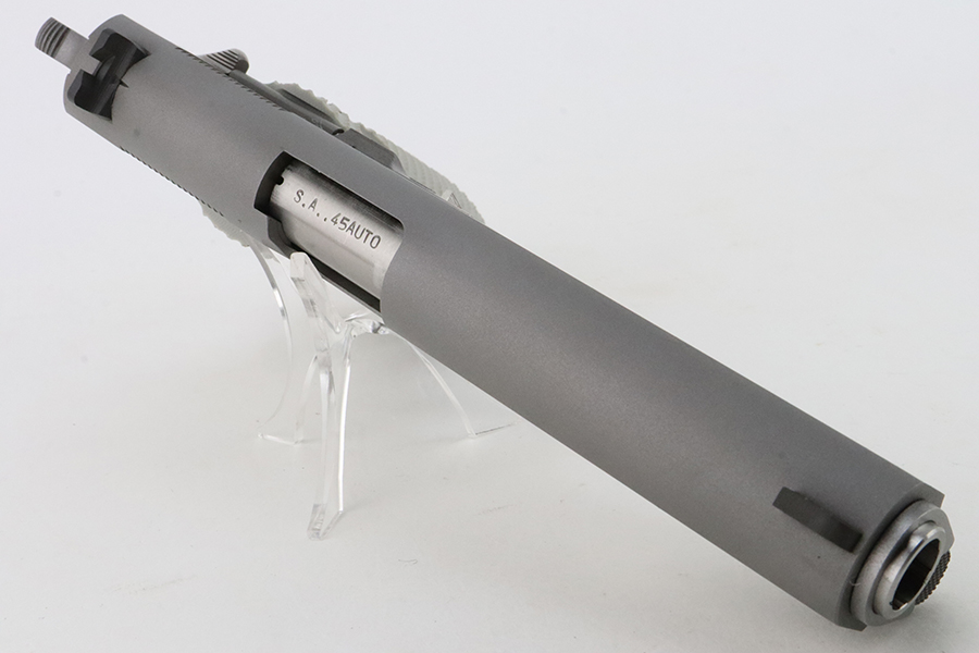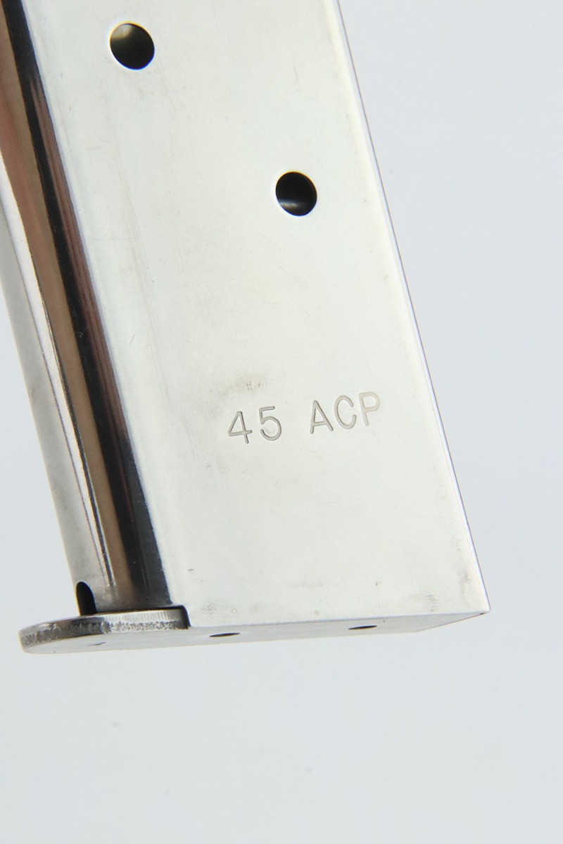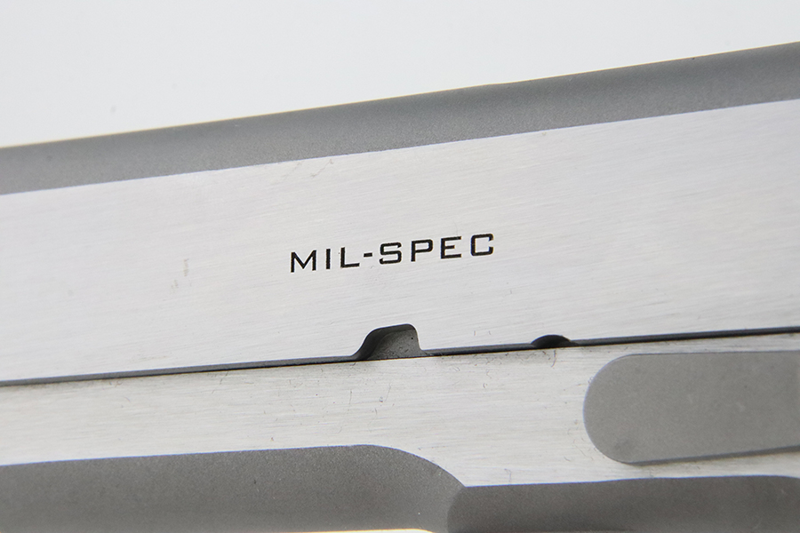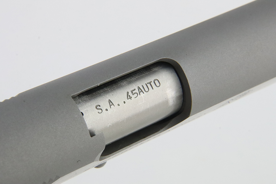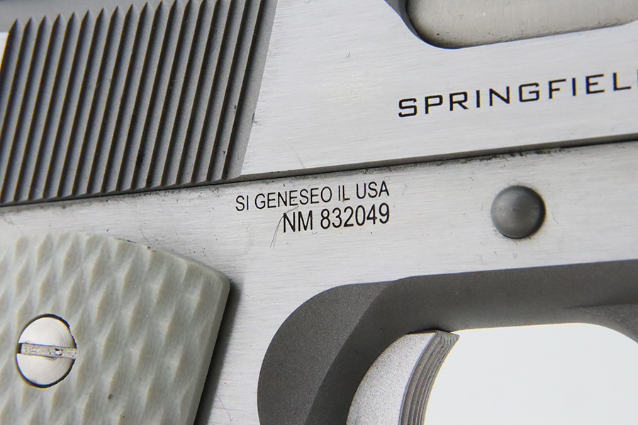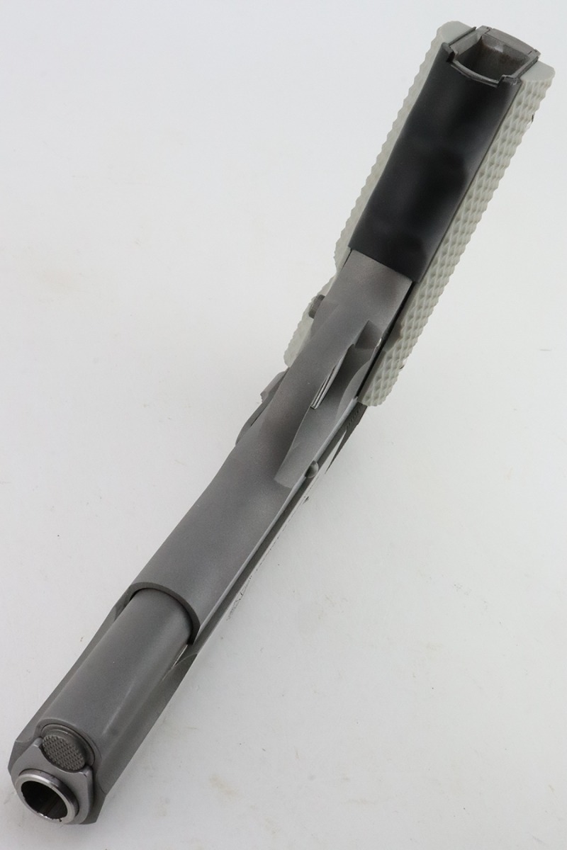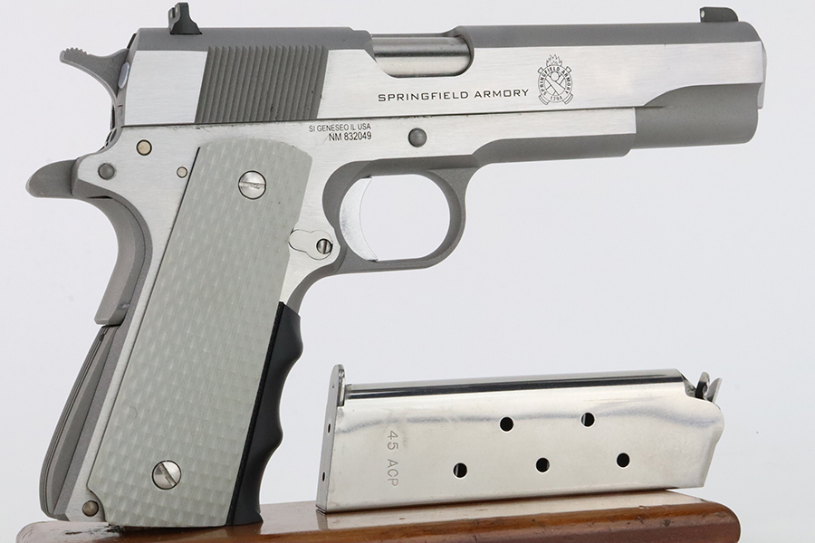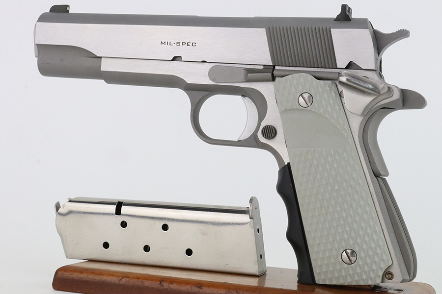 2/2/24 – This is a minty example of a Springfield Armory Mil-Spec 1911, chambered in .45 ACP. It has a really nice stainless finish with very little signs of wear or use. Fitted with an excellent set of grayish composite grips and a really nice black rubber front grip – makes for a very comfortable grip. Mint bore. Comes with one magazine.
