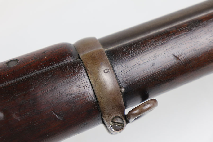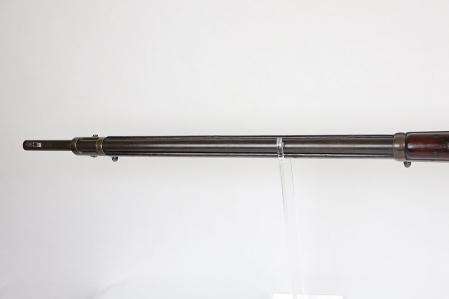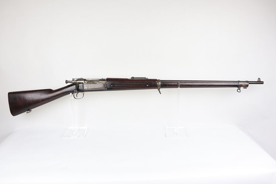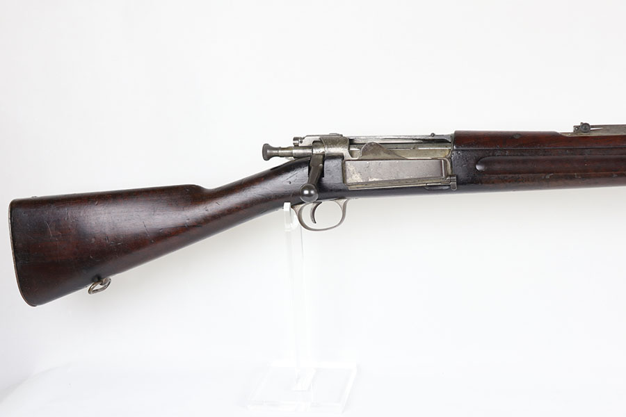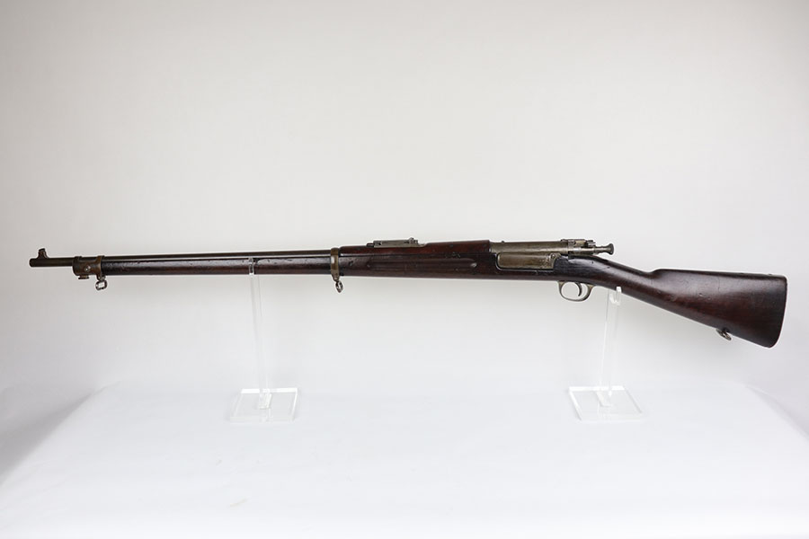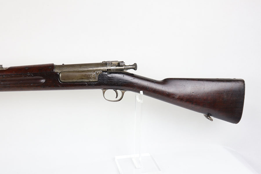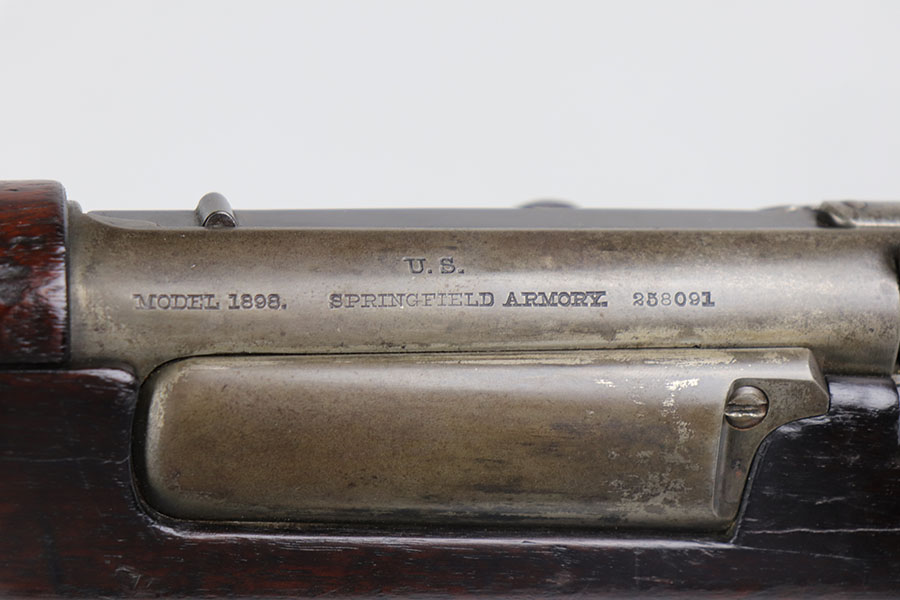 4/1/20 – This is an original Springfield Armory M1898 Krag rifle that was manufactured in 1900. The finish is original but a notable and even patina has set in on most of the metal surfaces. The barrel retains more original bluing that the rest of the metal parts, but still dulled and browning. Very nice stock with no major cracks or chips. P proof in circle on wrist, and faint inspectors mark and 1900 date on the left side. Bore is fairly shiny with strong rifling but some frost and minor freckling throughout.