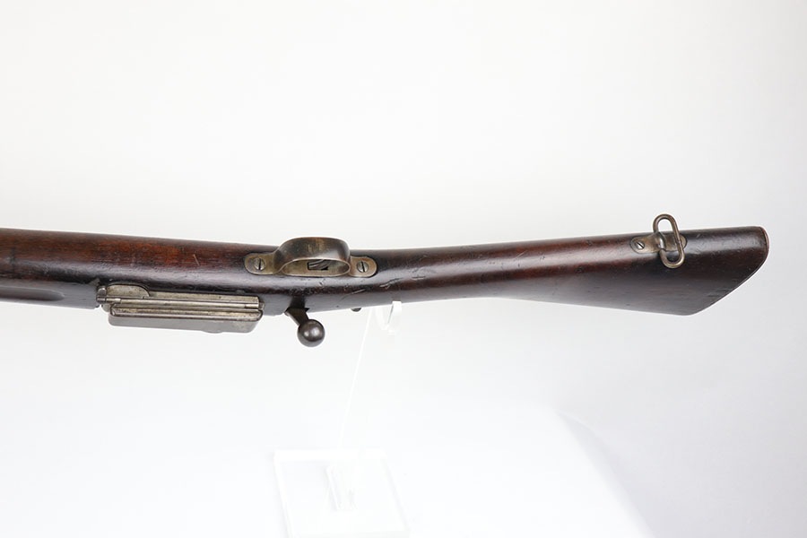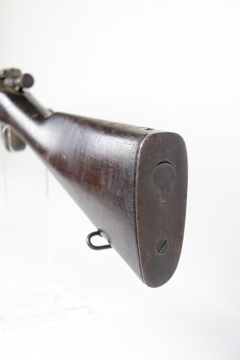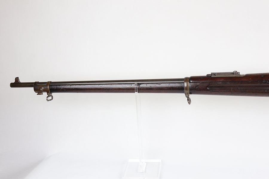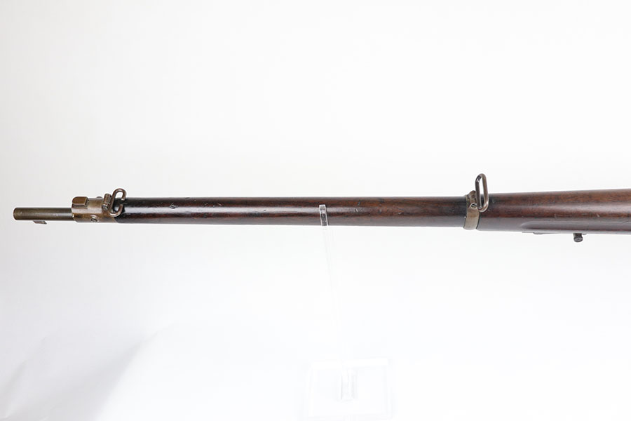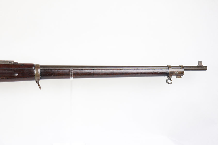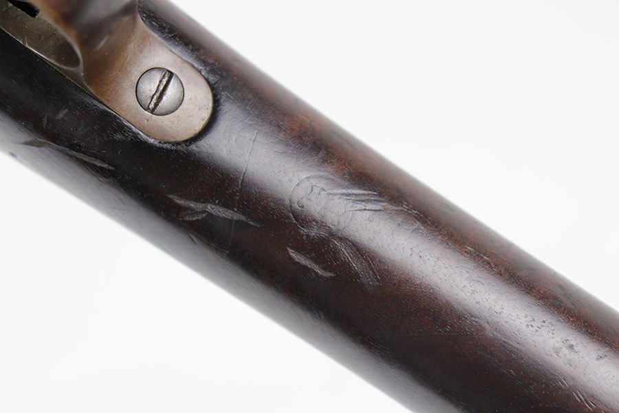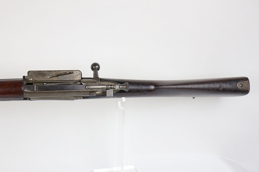 4/1/20 – This is an original Springfield Armory M1898 Krag rifle that was manufactured in 1900. The finish is original but a notable and even patina has set in on most of the metal surfaces. The barrel retains more original bluing that the rest of the metal parts, but still dulled and browning. Very nice stock with no major cracks or chips. P proof in circle on wrist, and faint inspectors mark and 1900 date on the left side. Bore is fairly shiny with strong rifling but some frost and minor freckling throughout.