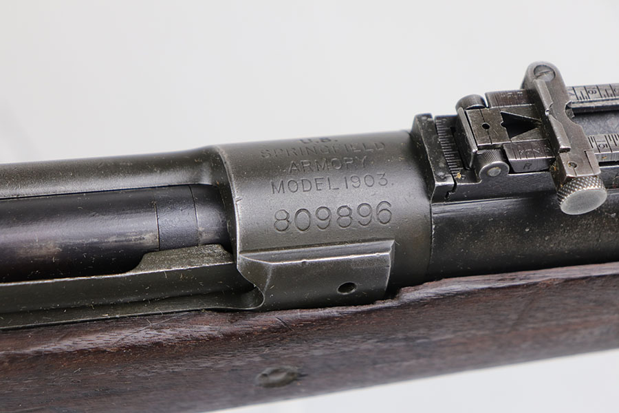 3/27/20 – This is a Springfield M1903 that comes out of the Civilian Marksmanship Program. Serial dates to 1918 for receiver, and barrel is dated to November of 1942. Receiver serial is right at the tail end of the range for those receivers that received double heat treatment. Original finish is in very good condition, with majority of thinning on the bands and muzzle. Stock has a faint P in circle on wrist, and what may be a rack number on right side of stock. Bolt has etched serial that doesn’t match receiver number. Stock in excellent shape aside from some basic dings/nicks. Minty bore.