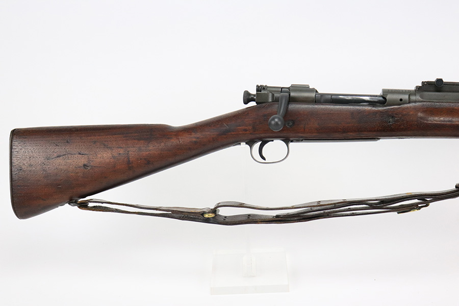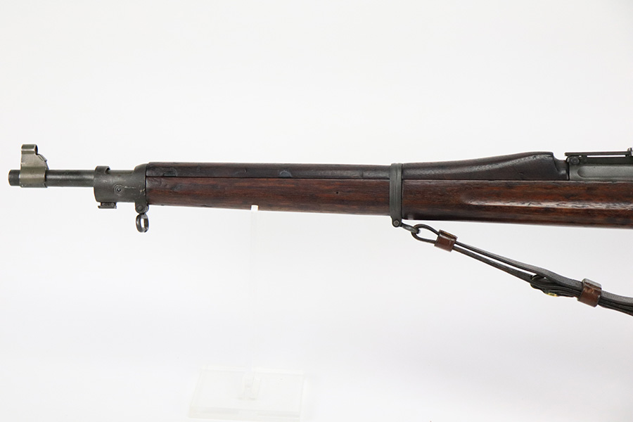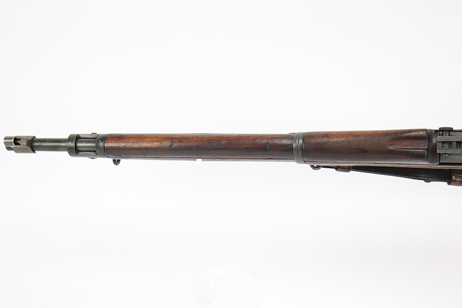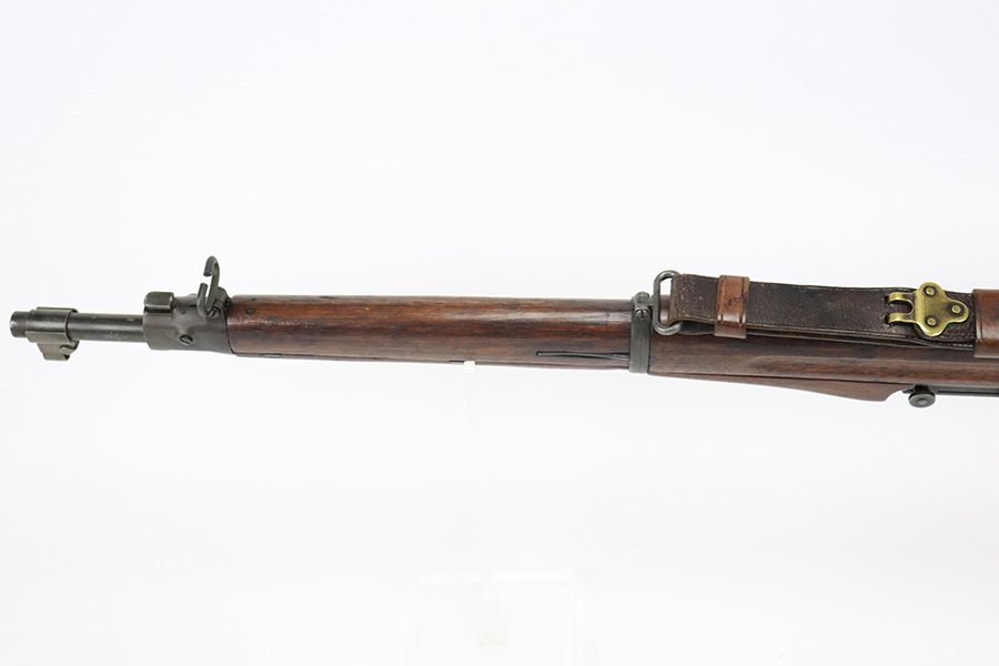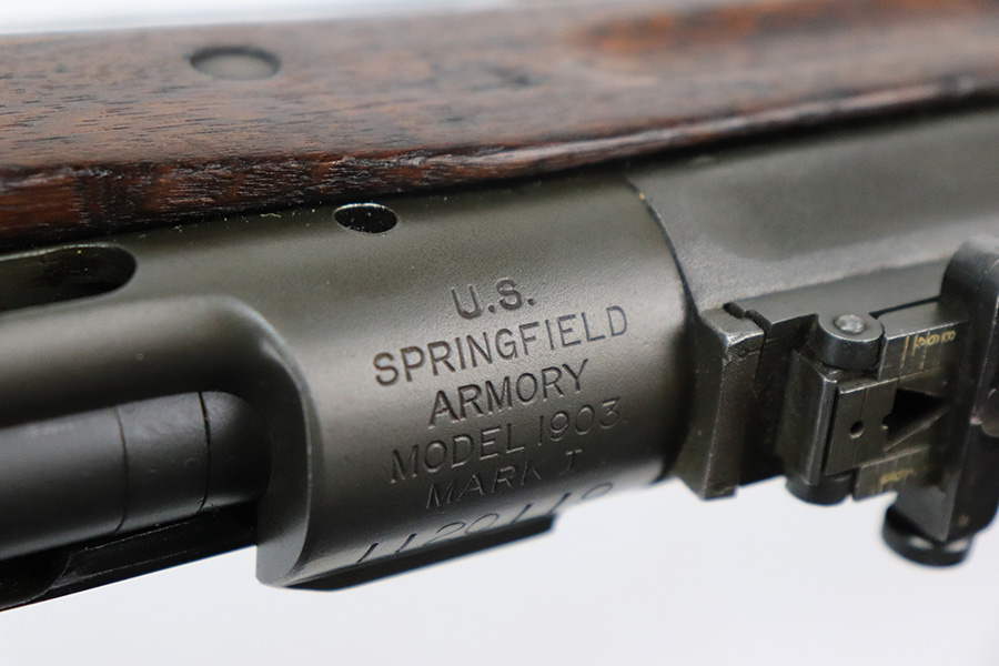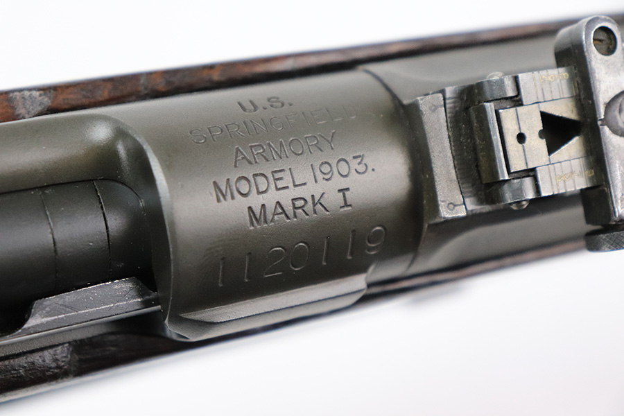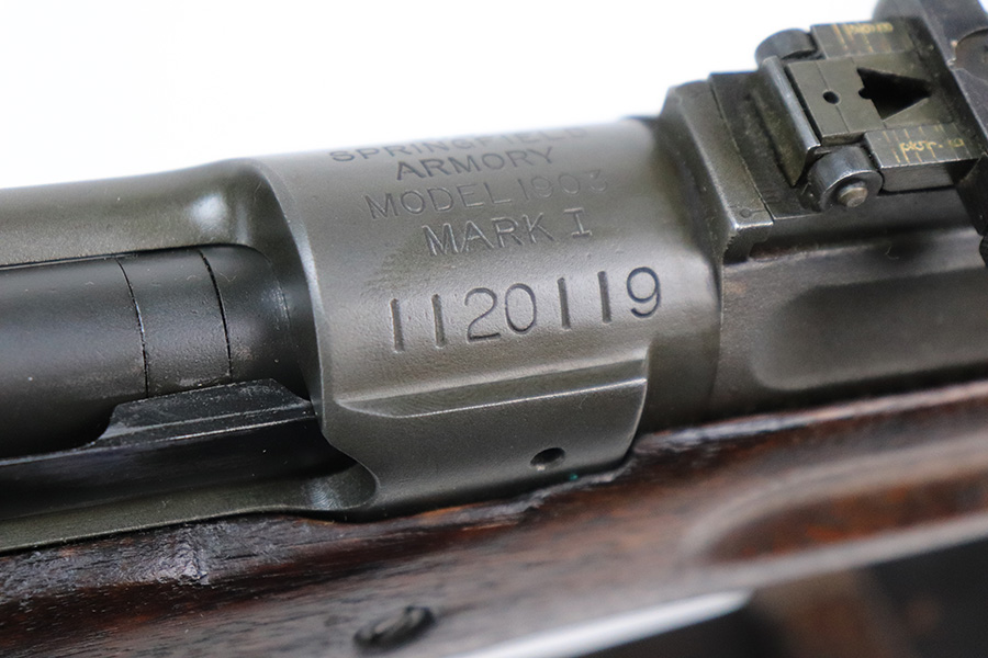 7/6/22 – This is an excellent example of a Springfield Model 1903 Mark I bolt action rifle. The receiver dates to 1919 and the barrel is dated to October of 1919. The barrel is marked “SA” and has a flaming bomb proof. The receiver has a cutout to receive a Pedersen device. The stock is “P” proofed, has a faint cartouche that appears to be a “C-SAA” proof. This would indicate the gun was reworked at the San Antonio Arsenal. The gun is excellent condition, retaining most of its finish with minor scuffs around the muzzle, and some thinning on the trigger group. Nice stock but it does have a surface crack through the handguard. Comes with a period-correct sling. Strong, shiny bore.
