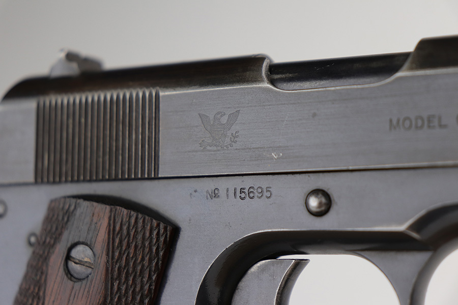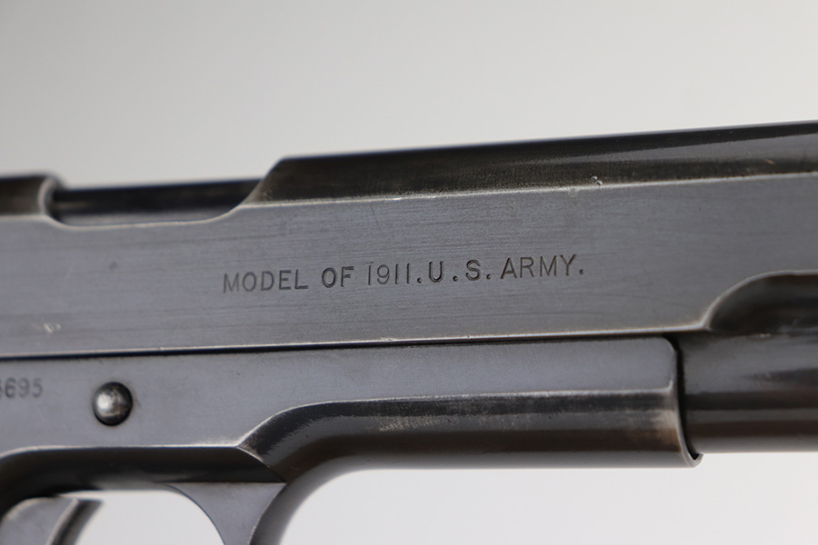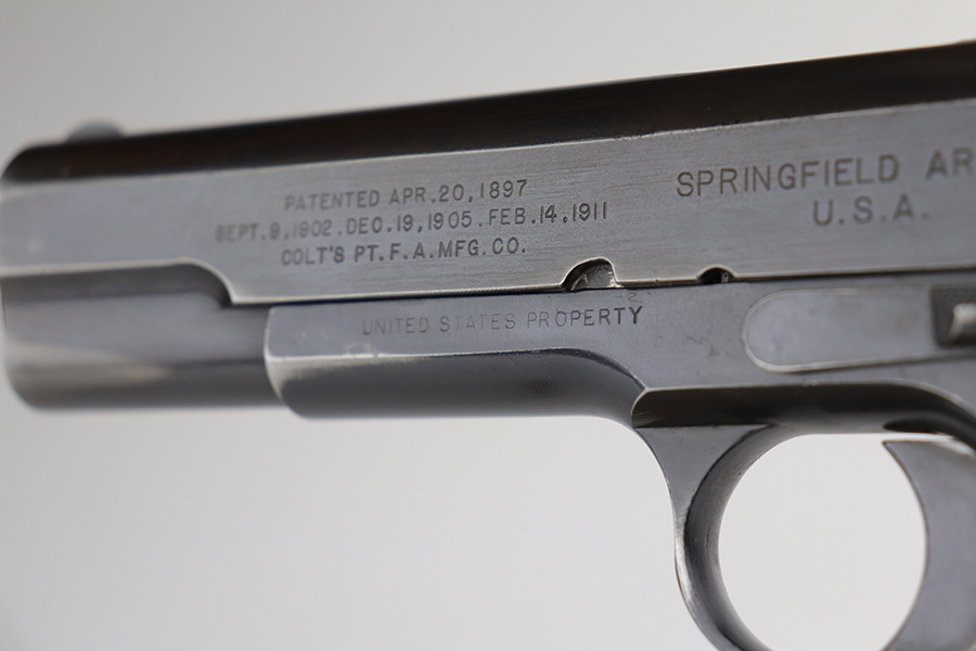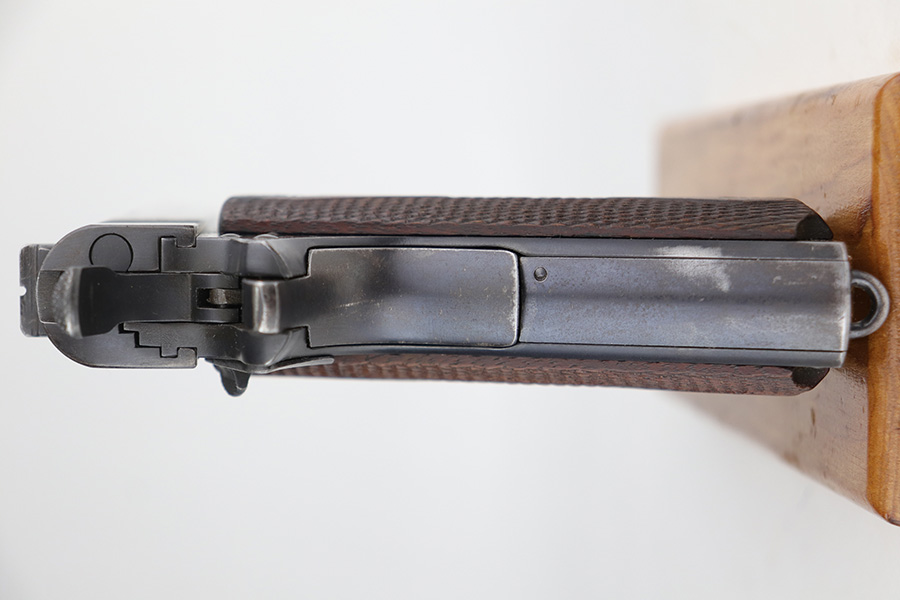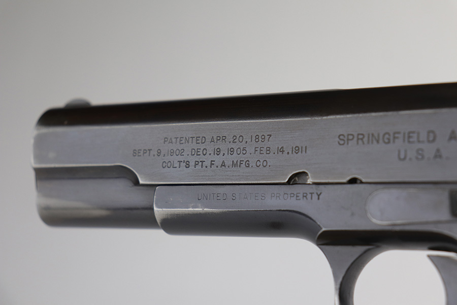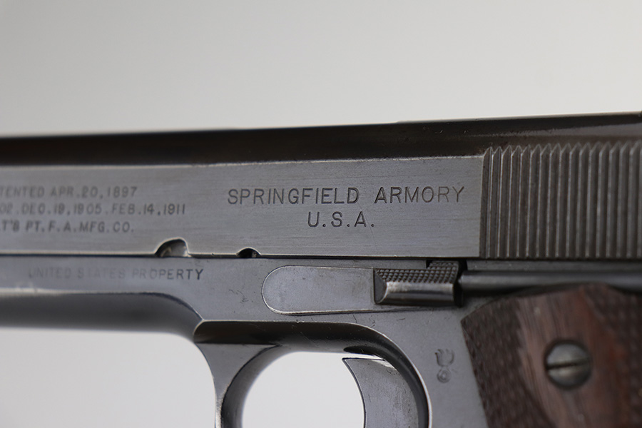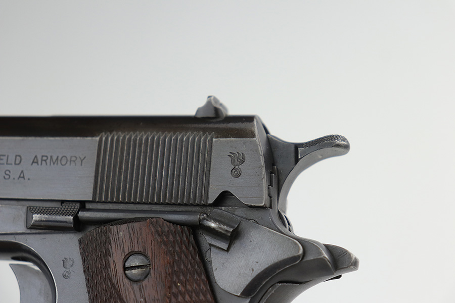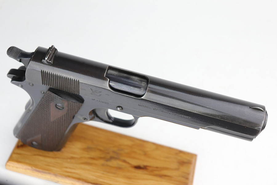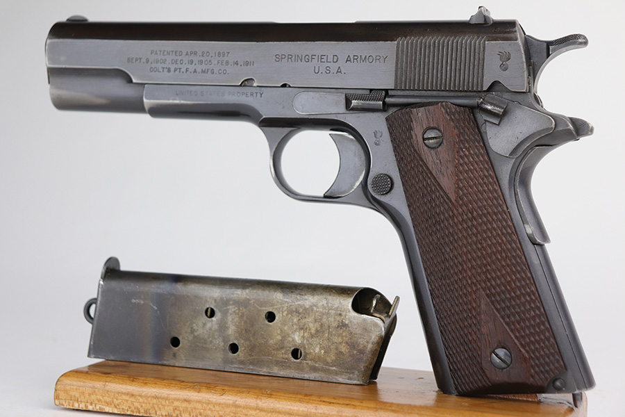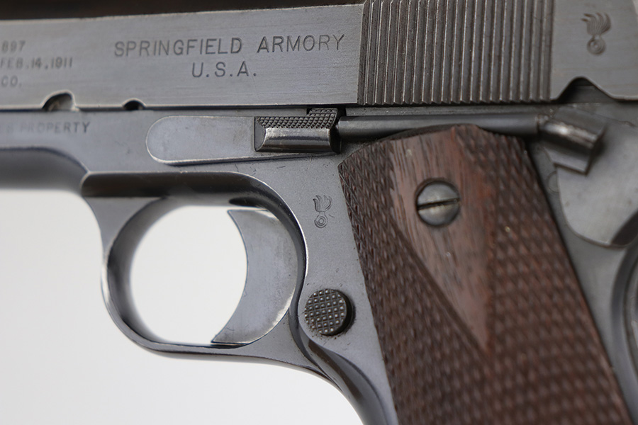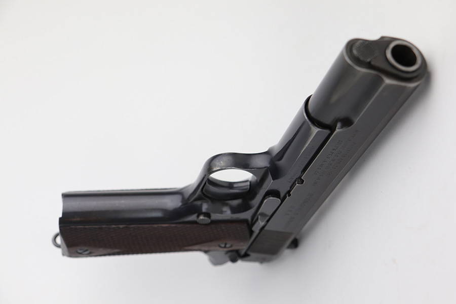 10/8/21 – This is one of the nicest Springfield 1911s that we have ever offered for sale. It retains about 92-93% of the original blue finish with no rust or pitting. The pistol is all matching and correct as every part has the proper “S” proof, including the original barrel. The grips are original Springfield with the 11 row large diamond pattern. The condition of the grips matches the condition of the gun with just a few dings or wear spots on them. Incredibly, the bore is near mint condition. It has the correct P on the left lug and the S mark on the right lug, with an additional S on the rear chamber hood. The correct and original magazine has the folded lip and loop on the bottom, with nice case colors on the dual toned tube of the magazine. Correct copper at the top spine of the magazine. This is one you have been waiting for if you are an advanced 1911 collector. These are very rare to find in such a nice condition with all correct, original parts.