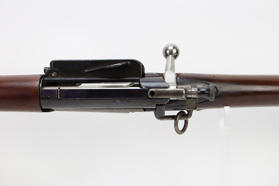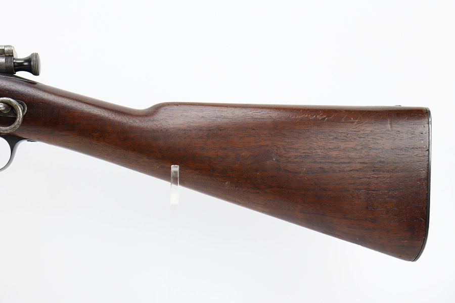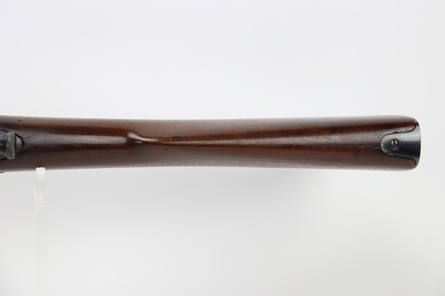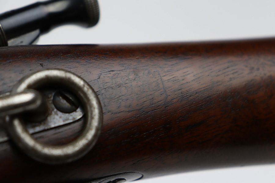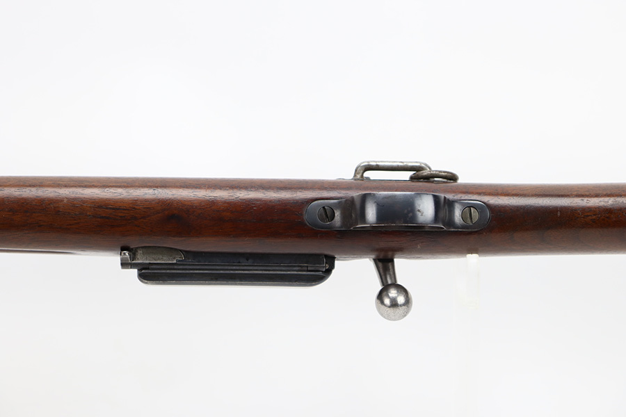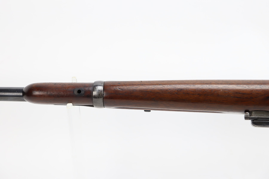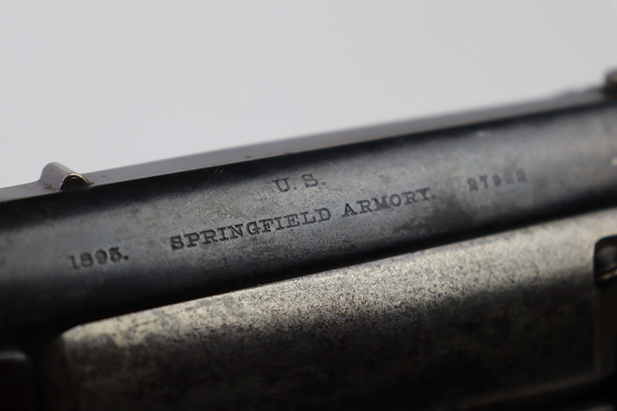 12/4/23 – This is an excellent example of a Model 1896 Krag Jorgenson Carbine made at the Springfield Arsenal in 1895. This carbine retains the majority of its finish and still has a deep bluing on the receiver and barrel. The magazine wall was originally in the white but has a layer of patina to it. The wood stock is mostly in great shape with two issues. One is that aftermarket sling swivels were applied in the past and there are drill holes and marks from that. Second, there is a crack going below the bolt between the back of the tang and the right side of the magazine. This carbine has a saddle ring to be used by cavalry. We believe this carbine falls within the serial number range that was used by Teddy Roosevelt’s Rough Riders but there is no definitive list of which rifles were issued to the 1st Cavalry. This carbine has a C Stamped on the model 1896 style rear sight and has a 22″ Barrel.