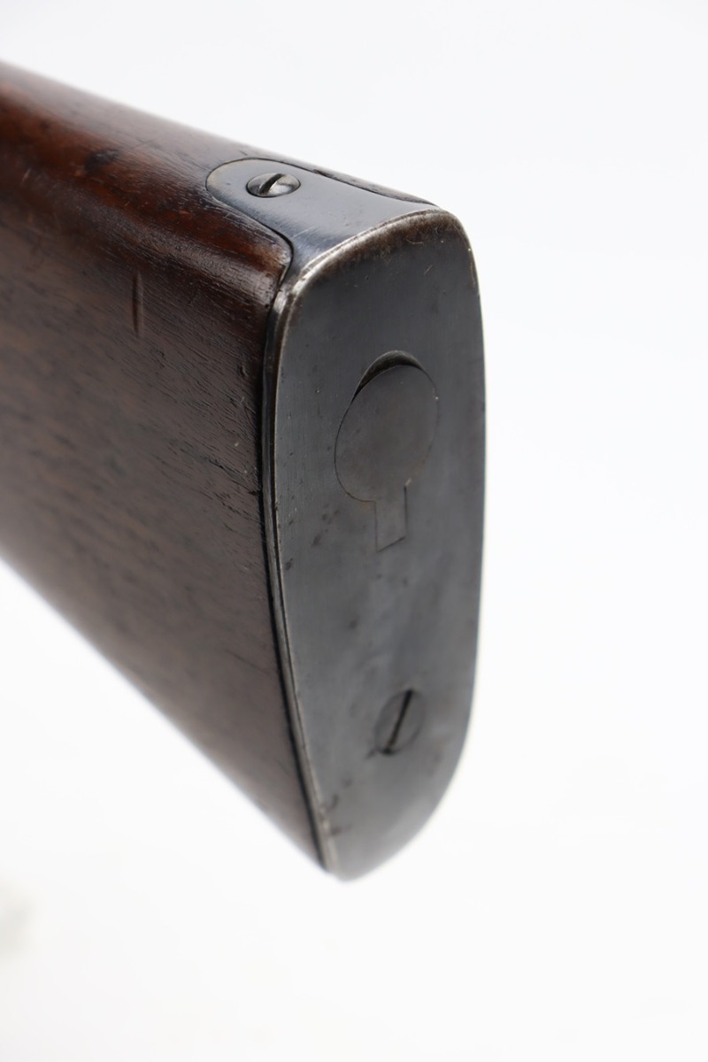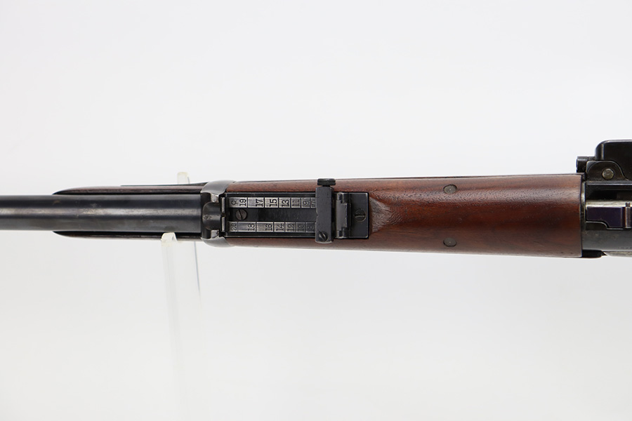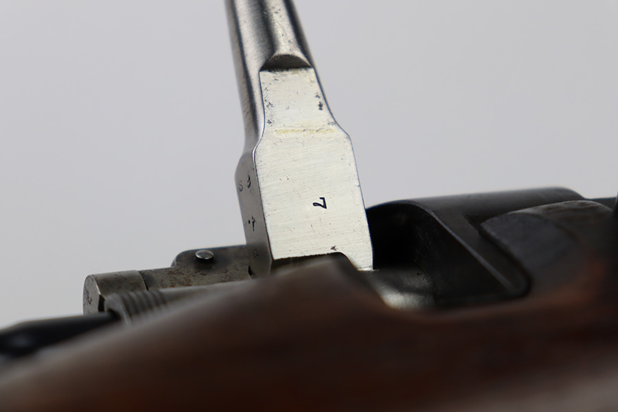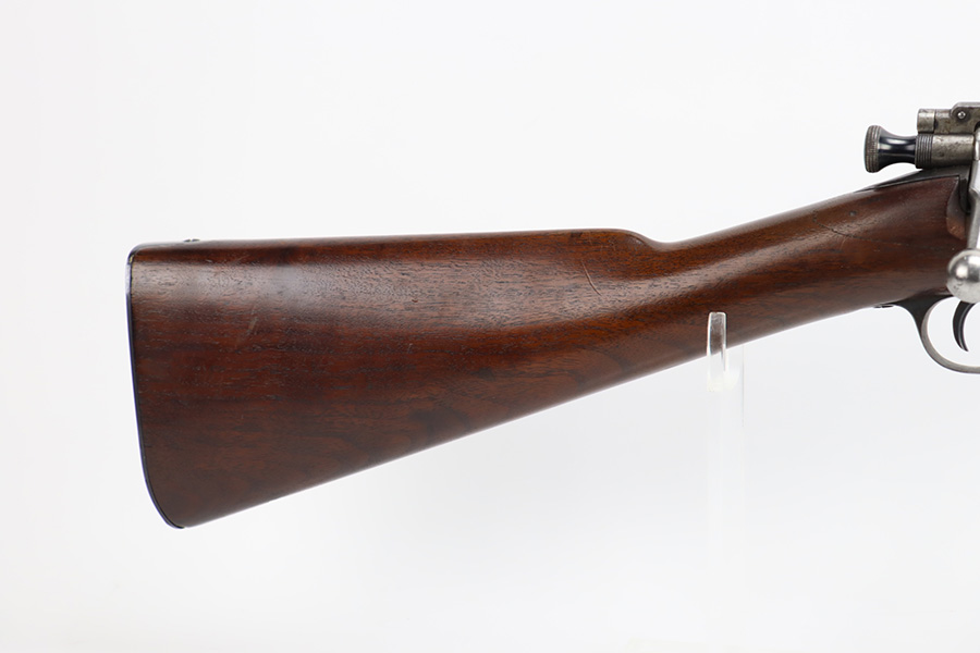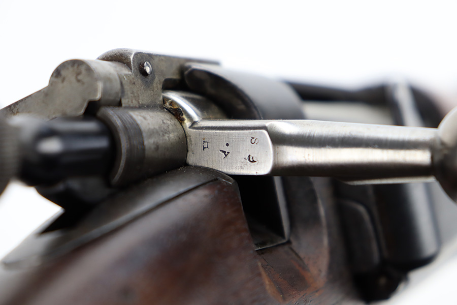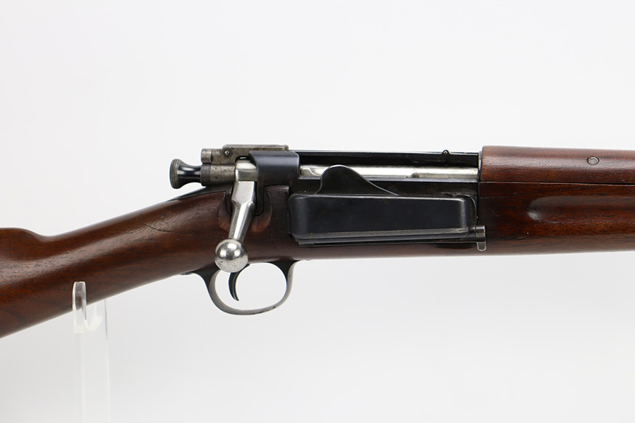12/4/23 – This is an excellent example of a Model 1896 Krag Jorgenson Carbine made at the Springfield Arsenal in 1895. This carbine retains the majority of its finish and still has a deep bluing on the receiver and barrel. The magazine wall was originally in the white but has a layer of patina to it. The wood stock is mostly in great shape with two issues. One is that aftermarket sling swivels were applied in the past and there are drill holes and marks from that. Second, there is a crack going below the bolt between the back of the tang and the right side of the magazine. This carbine has a saddle ring to be used by cavalry. We believe this carbine falls within the serial number range that was used by Teddy Roosevelt’s Rough Riders but there is no definitive list of which rifles were issued to the 1st Cavalry. This carbine has a C Stamped on the model 1896 style rear sight and has a 22″ Barrel.