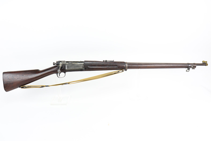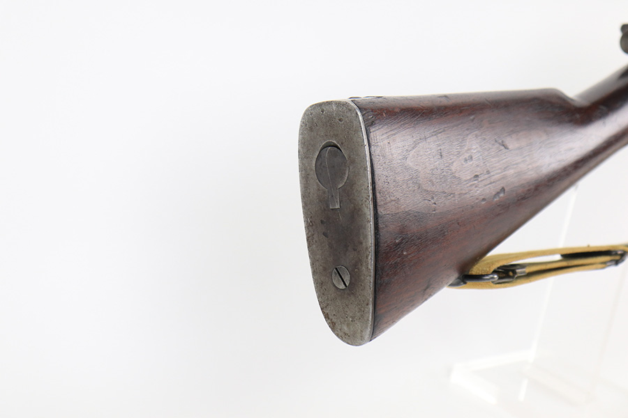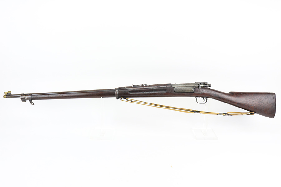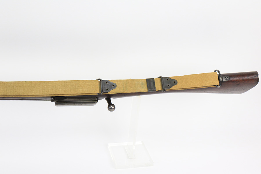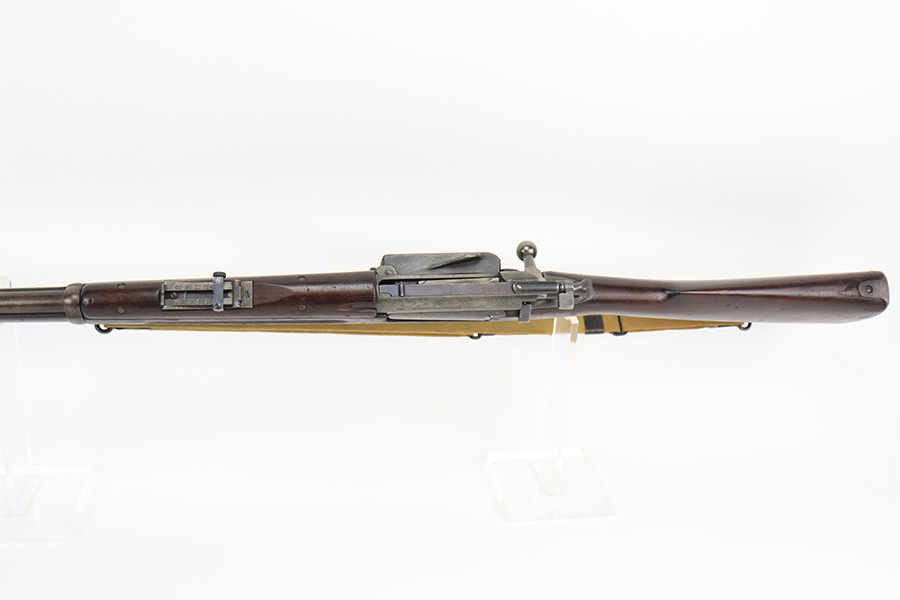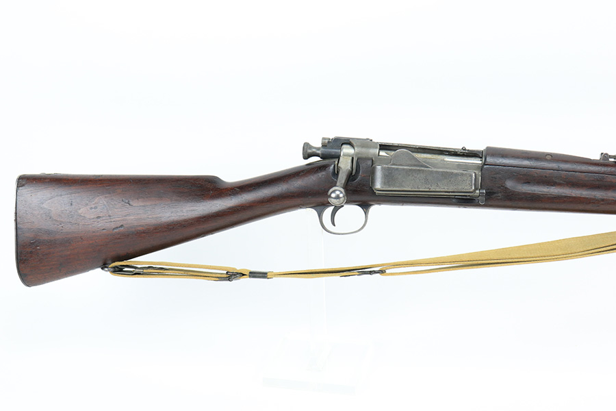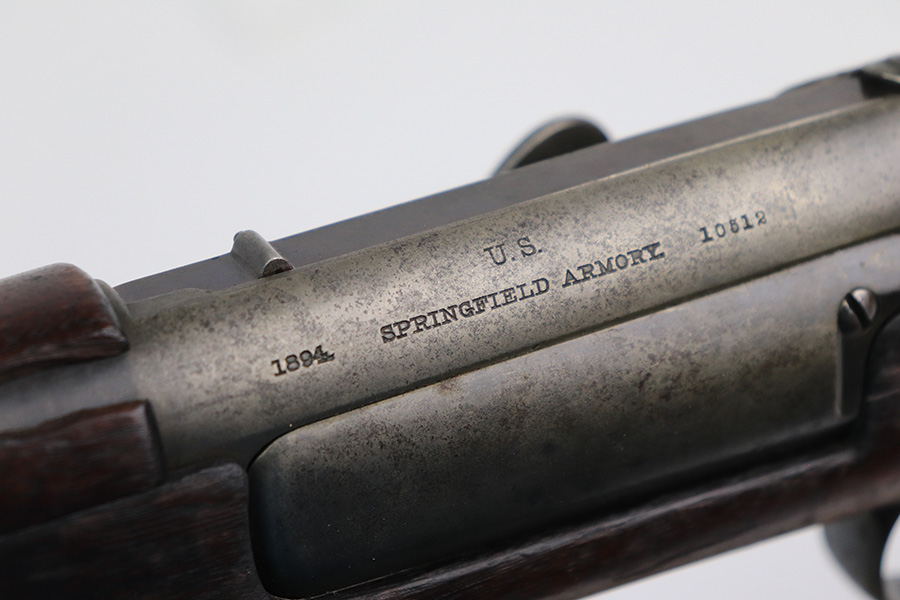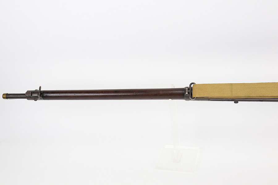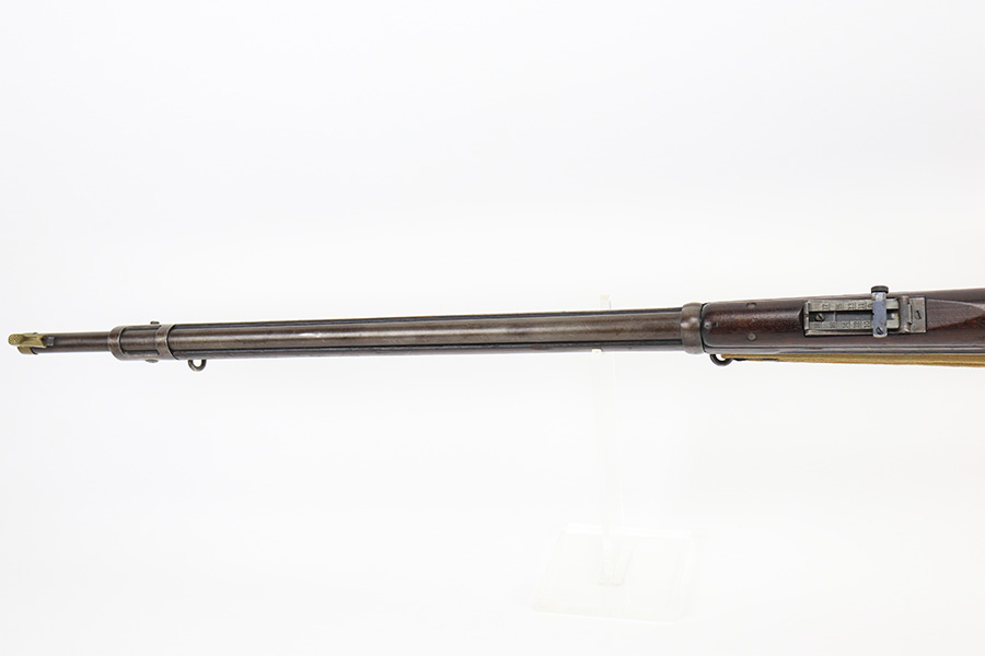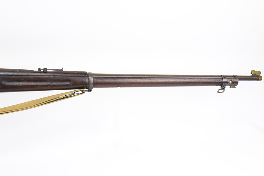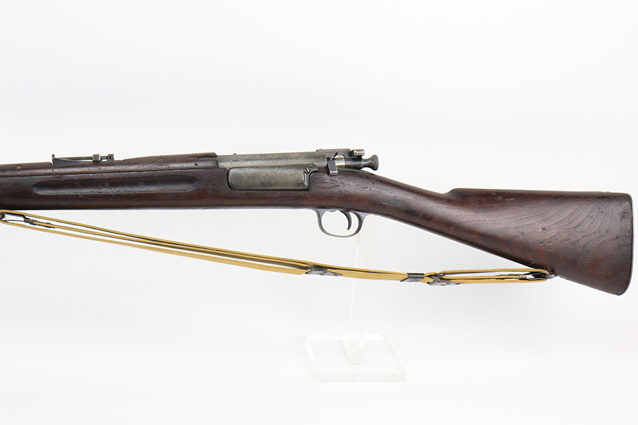 5/9/22 – This is a nice example of a Springfield Krag Model 1894 manufactured in 1895. Overall, the gun is in nice condition. The receiver has lost virtually all of its bluing with tiny dots of oxidation and pin-pricking throughout. There is light brown patina and spotty oxidation along the barrel. There is muzzle wear and scratchy wear on the front barrel band. The stock is nice with minor dings and bruises throughout. There is a small chip in the upper handguard, a small chip on the top edge of the butt stock against the butt plate, and a small crack around the rear sling swivel. The stock is “P” proofed but has no visible inspection stamp. Comes with a nice canvas sling and a brass muzzle cap. The bore has decent rifling but there is pin-pricking throughout.