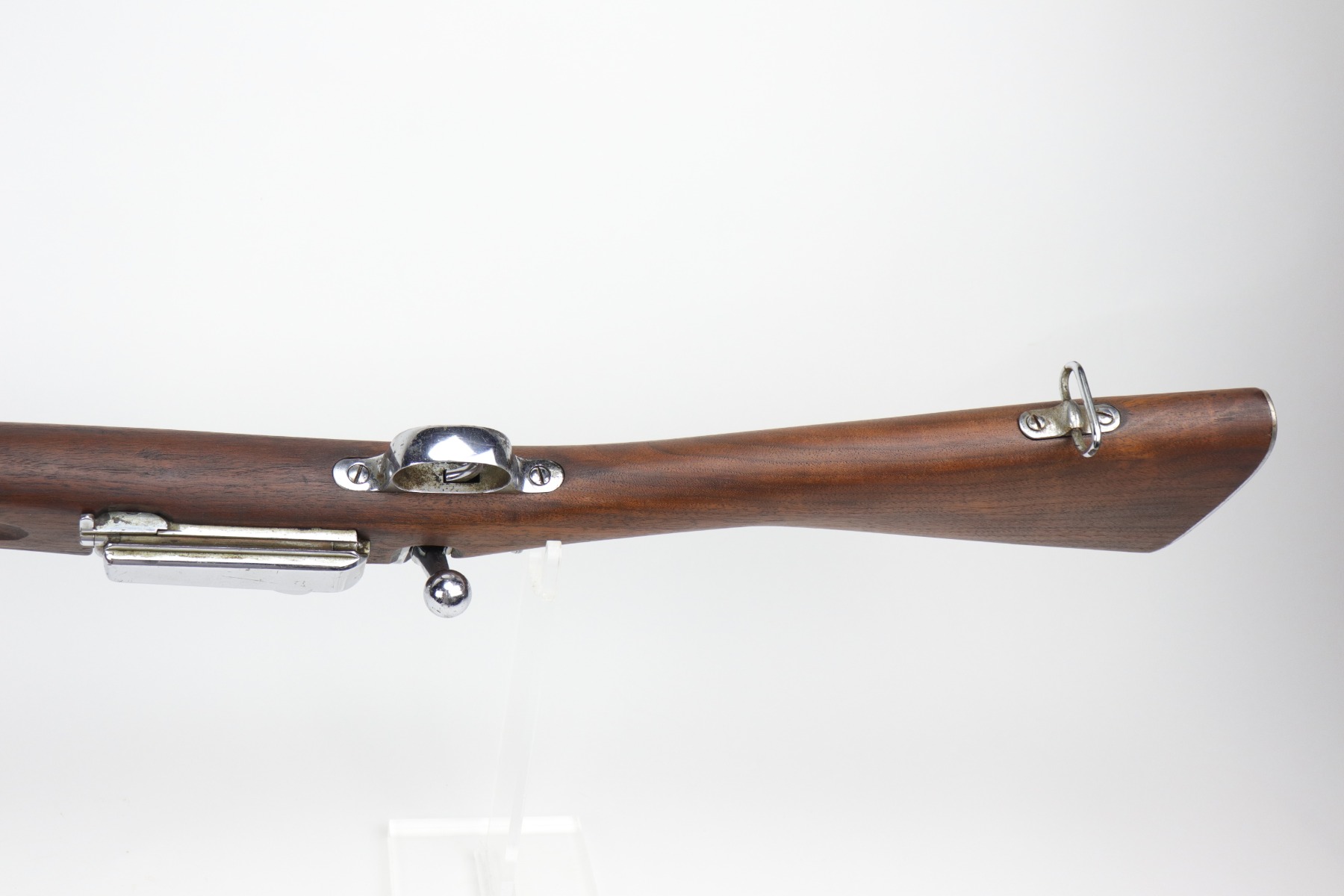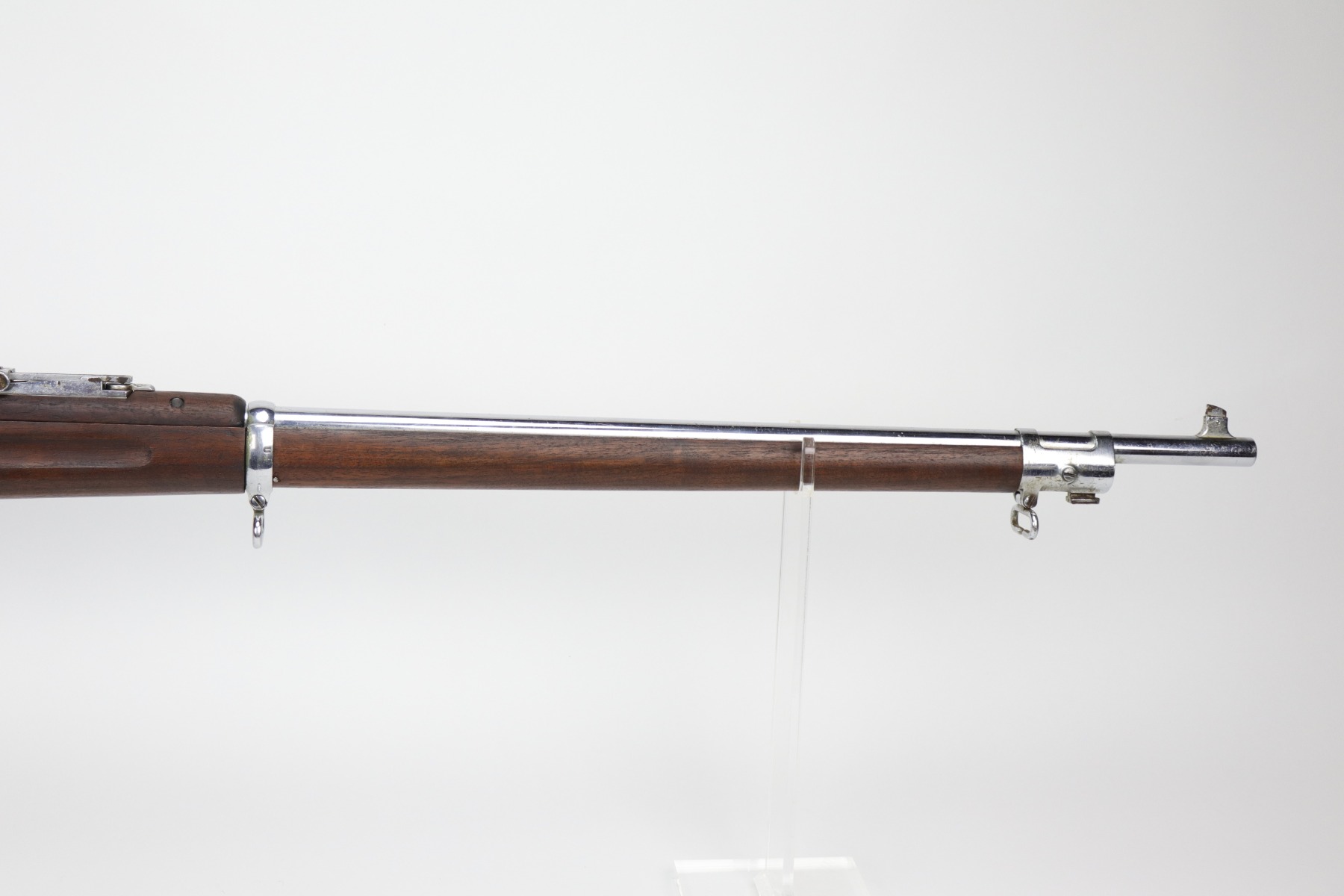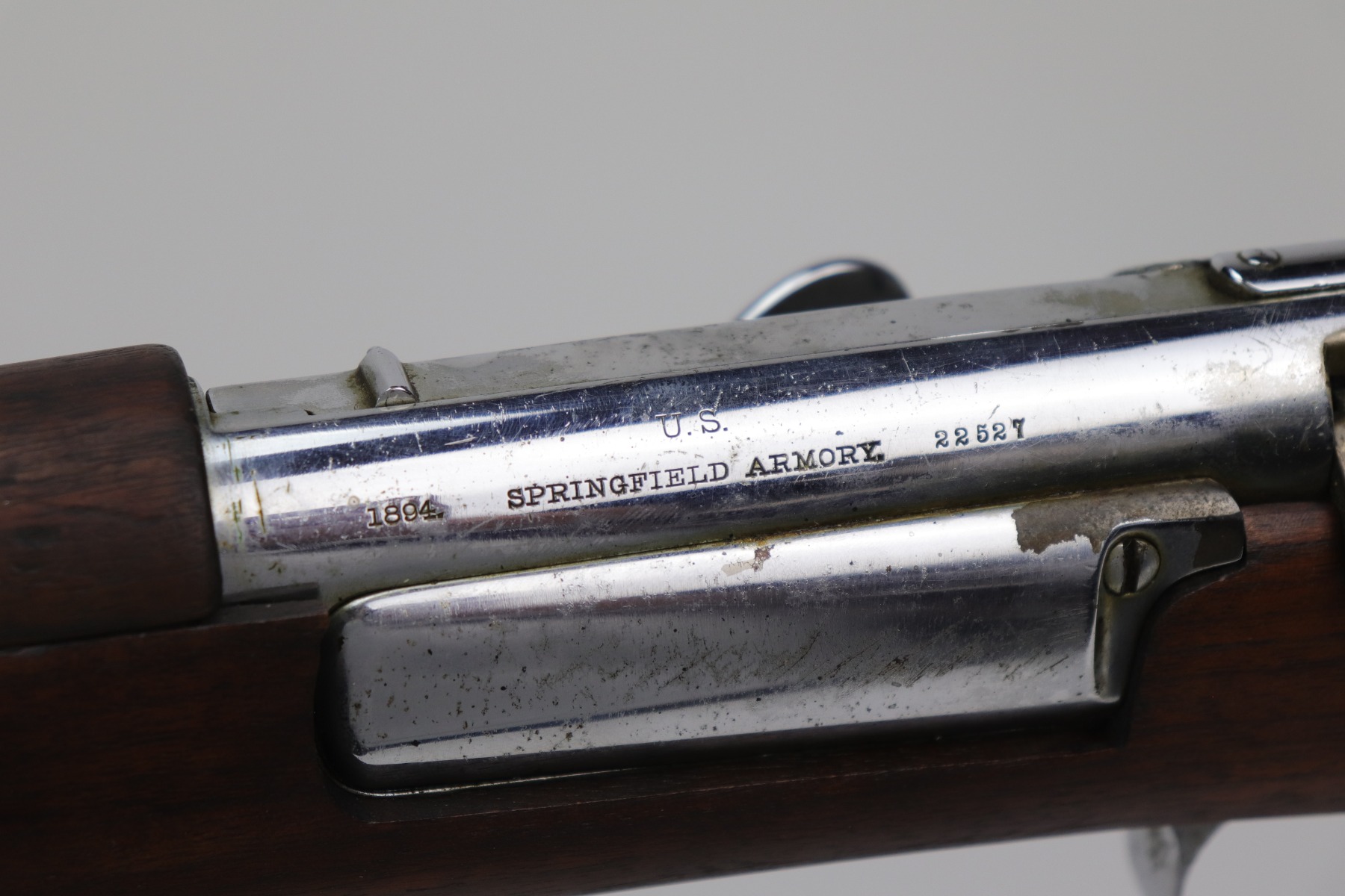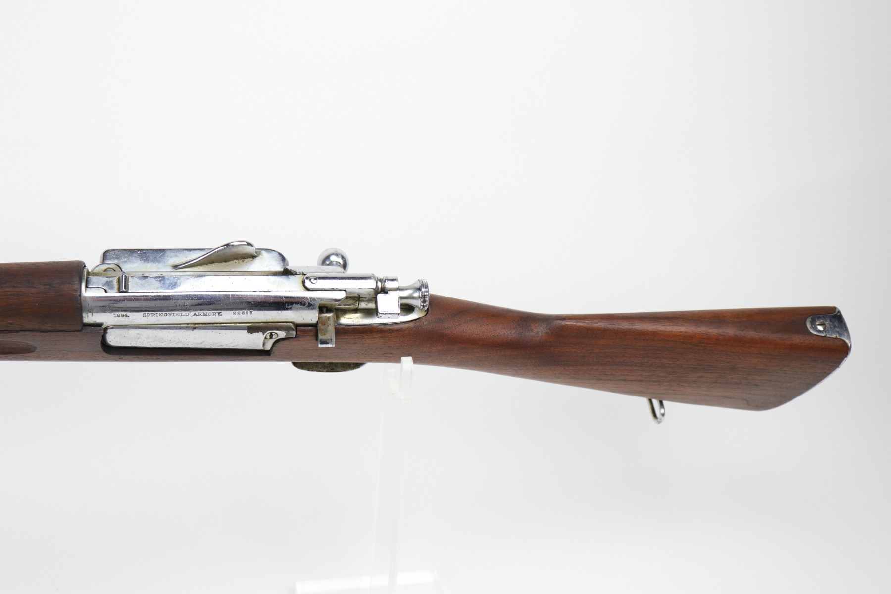 9/24/20 – This is a Springfield Krag Model 1894 that was nickel-plated and prepared for parade use. From the serial number, we believe it was manufactured in 1896. The majority of the nickel finish is in tact, but there are small dings and surface scratches throughout. There are areas of spotty oxidation throughout as well. The butt plate is covered in patina. The stock is excellent but has no markings. It was likely replaced or at least heavily sanded. The bore has some rifling left but there is heavy pitting throughout. The gun appears to function properly.