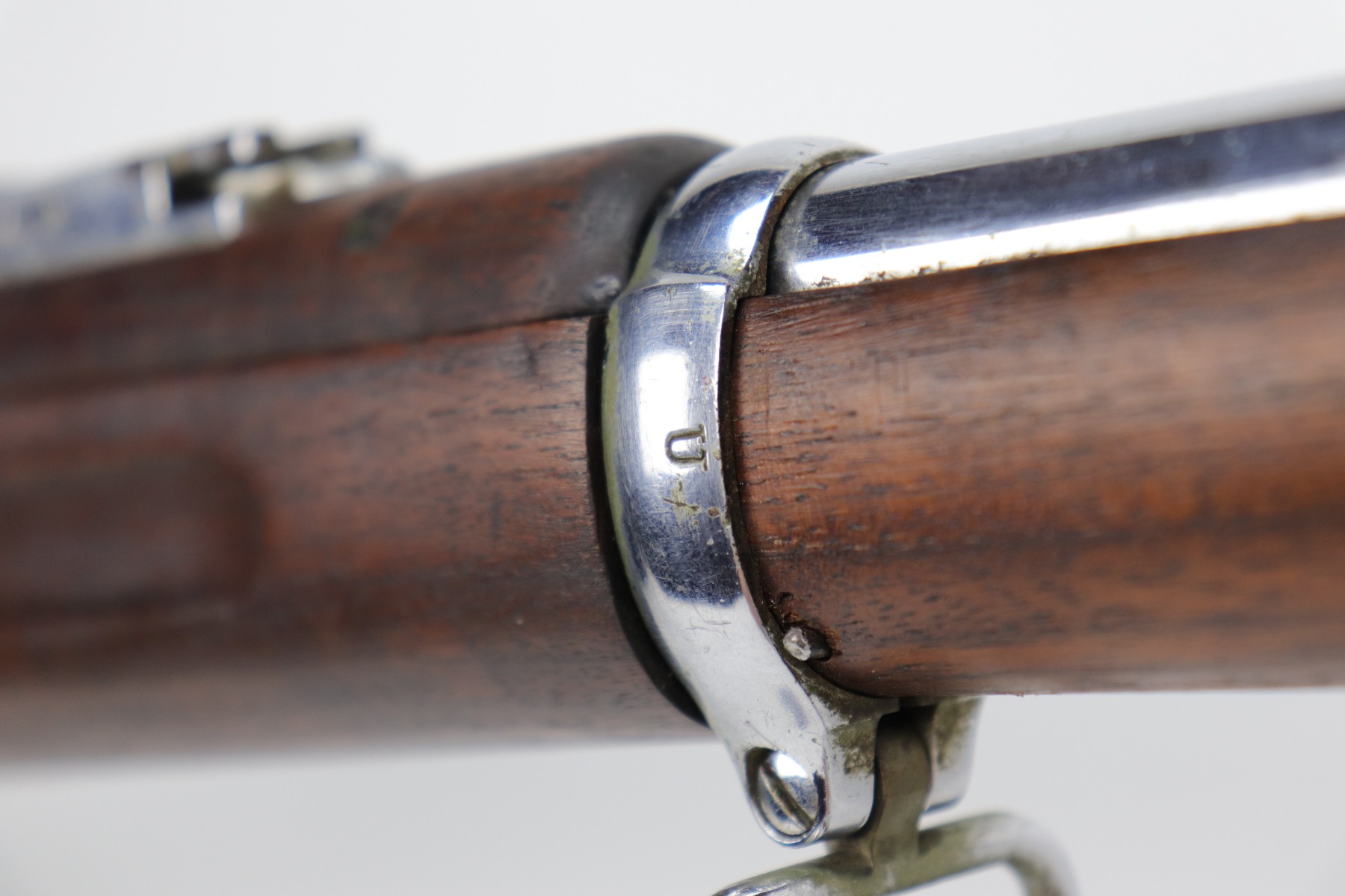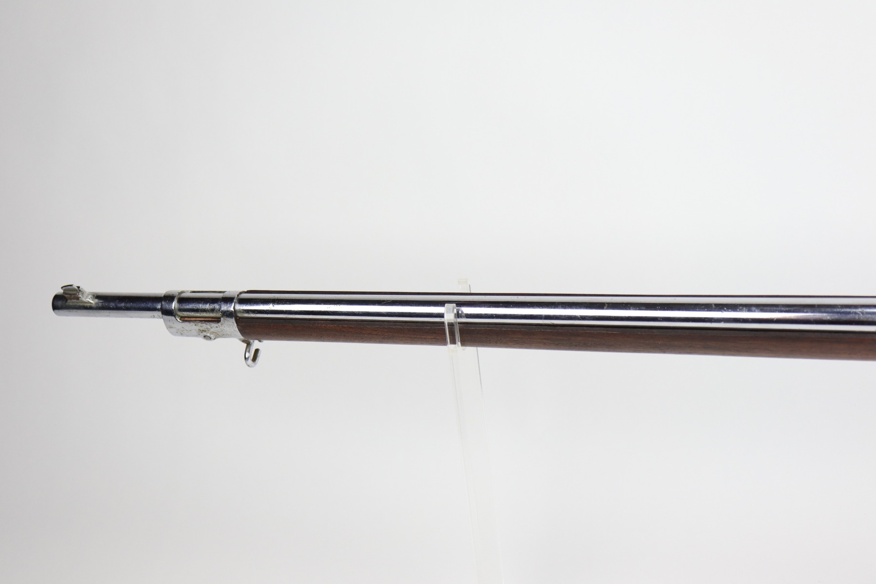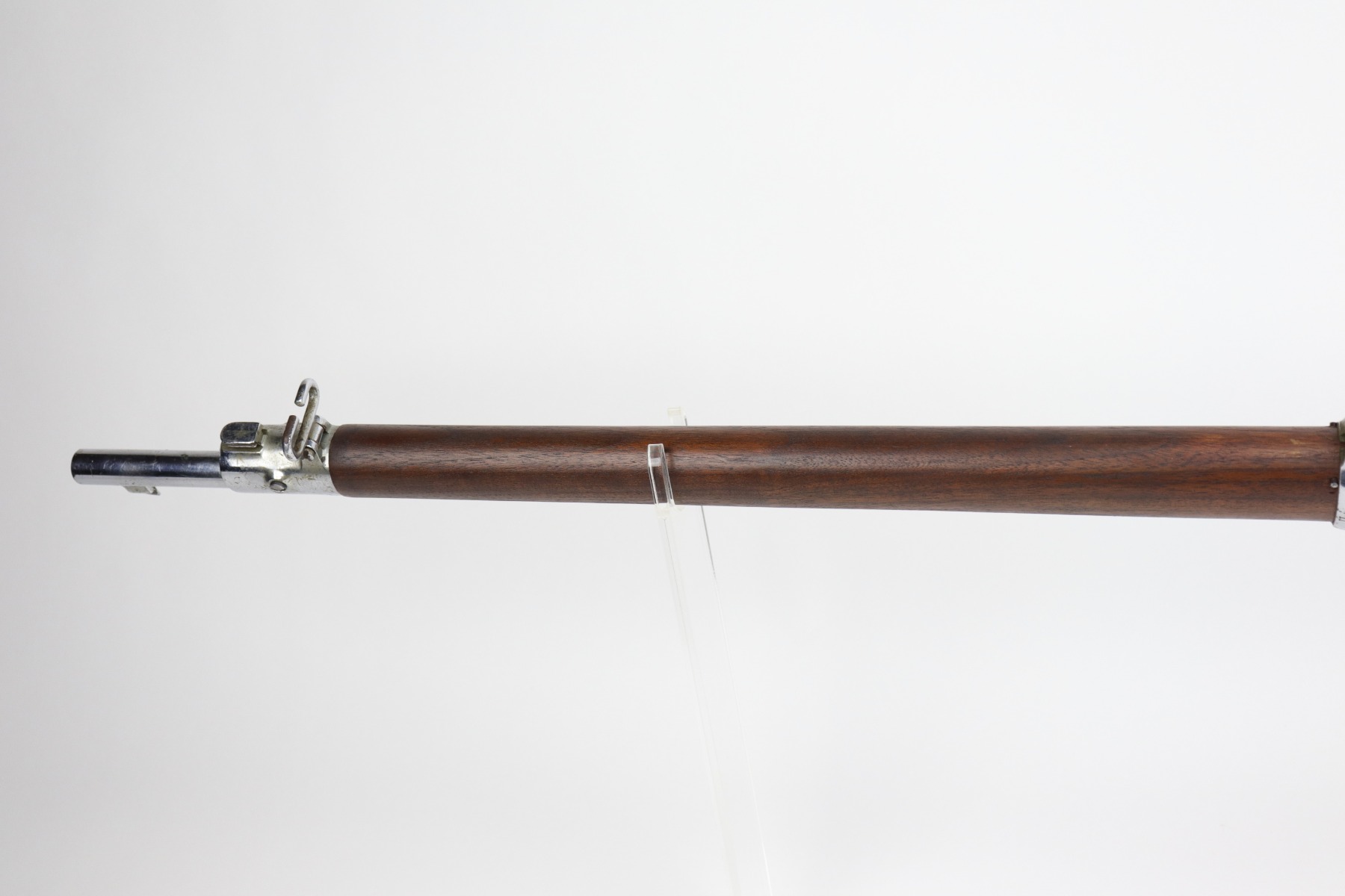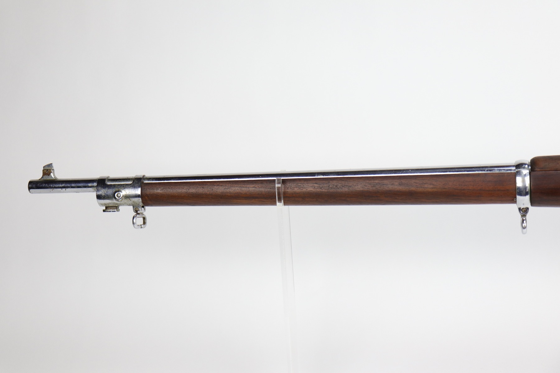 9/24/20 – This is a Springfield Krag Model 1894 that was nickel-plated and prepared for parade use. From the serial number, we believe it was manufactured in 1896. The majority of the nickel finish is in tact, but there are small dings and surface scratches throughout. There are areas of spotty oxidation throughout as well. The butt plate is covered in patina. The stock is excellent but has no markings. It was likely replaced or at least heavily sanded. The bore has some rifling left but there is heavy pitting throughout. The gun appears to function properly.