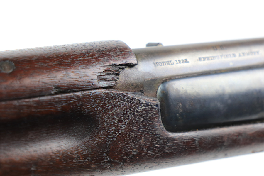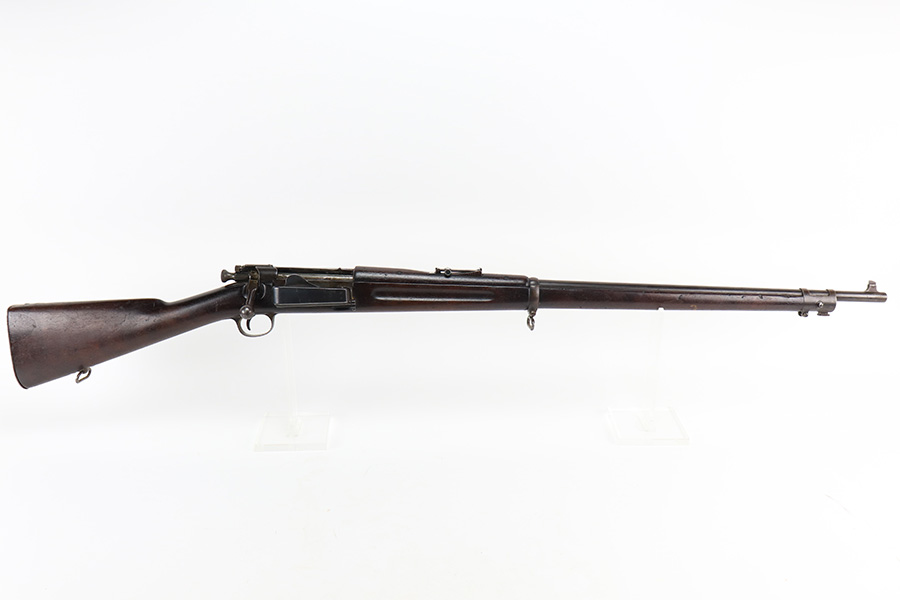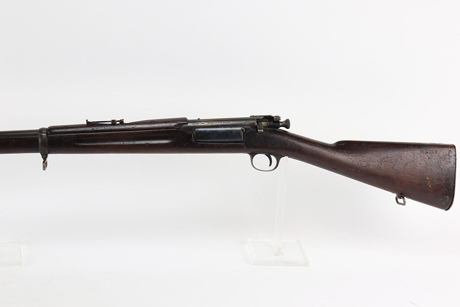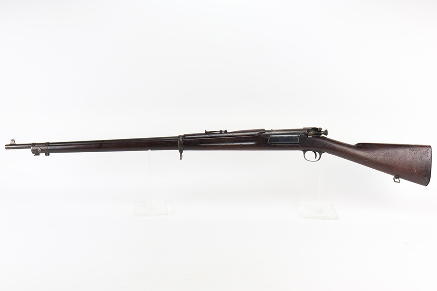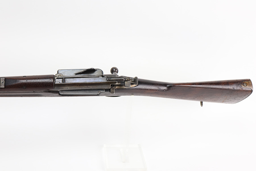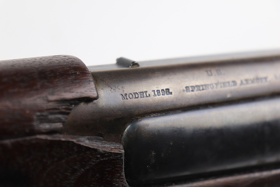 3/25/22 – This is a Springfield Krag Model 1896 issued to the US military in 1898, making this an antique. The gun is fully functional, is very faintly dated 1898 on the left side of the stock, has the proper military inspection stamp, and has a “P” proof on the wrist. Overall, the gun is in fair condition. On the receiver, there is thinning, light brown patina, and a few textured scratches. Small spots of discoloration on the left side plate and magazine. There is spotty oxidation along the barrel. An area of minor thinning on the barrel and minor wear around the muzzle. Brown patina on both barrel bands and on the trigger guard. Spotty oxidation on the butt plate. There are scratches here and there on the stock, most noticeable on the left side of the but stock. There is a noticeable chip in the wood on the left side where the receiver meets the stock. The rifling in the bore is worn with spotty oxidation throughout.