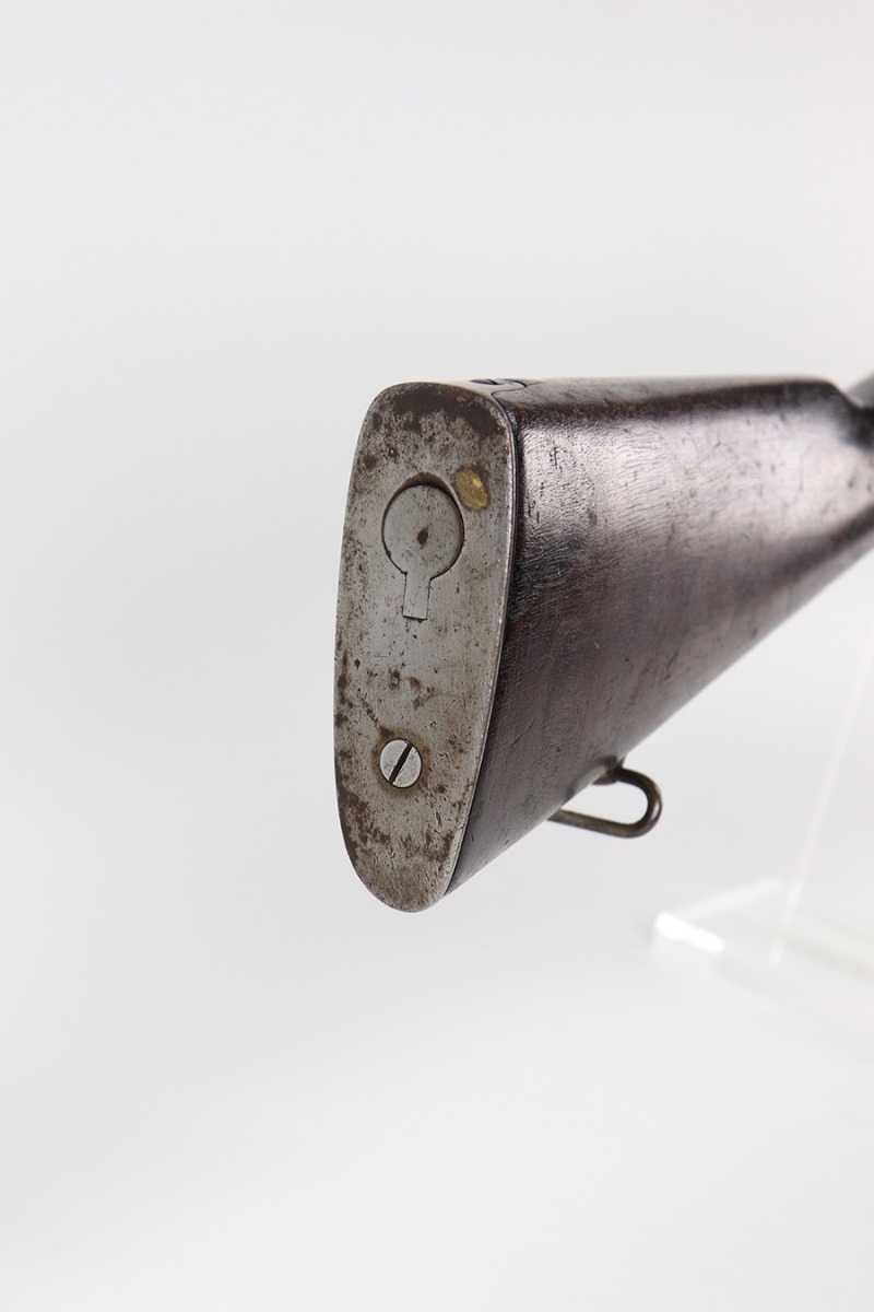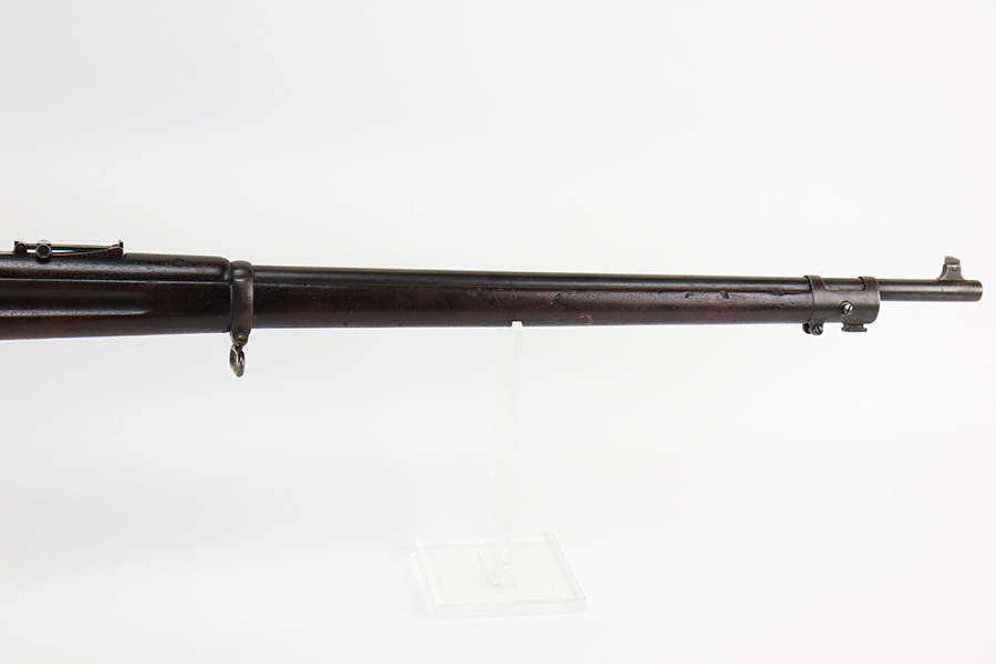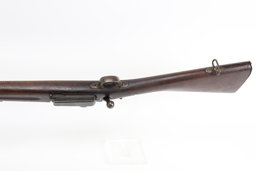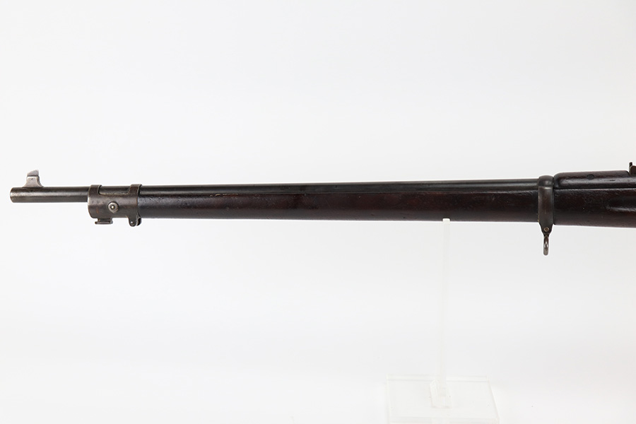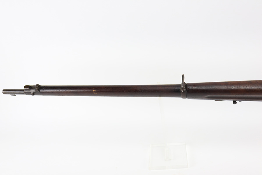 3/25/22 – This is a Springfield Krag Model 1896 issued to the US military in 1898, making this an antique. The gun is fully functional, is very faintly dated 1898 on the left side of the stock, has the proper military inspection stamp, and has a “P” proof on the wrist. Overall, the gun is in fair condition. On the receiver, there is thinning, light brown patina, and a few textured scratches. Small spots of discoloration on the left side plate and magazine. There is spotty oxidation along the barrel. An area of minor thinning on the barrel and minor wear around the muzzle. Brown patina on both barrel bands and on the trigger guard. Spotty oxidation on the butt plate. There are scratches here and there on the stock, most noticeable on the left side of the but stock. There is a noticeable chip in the wood on the left side where the receiver meets the stock. The rifling in the bore is worn with spotty oxidation throughout.