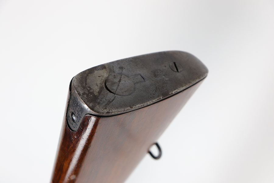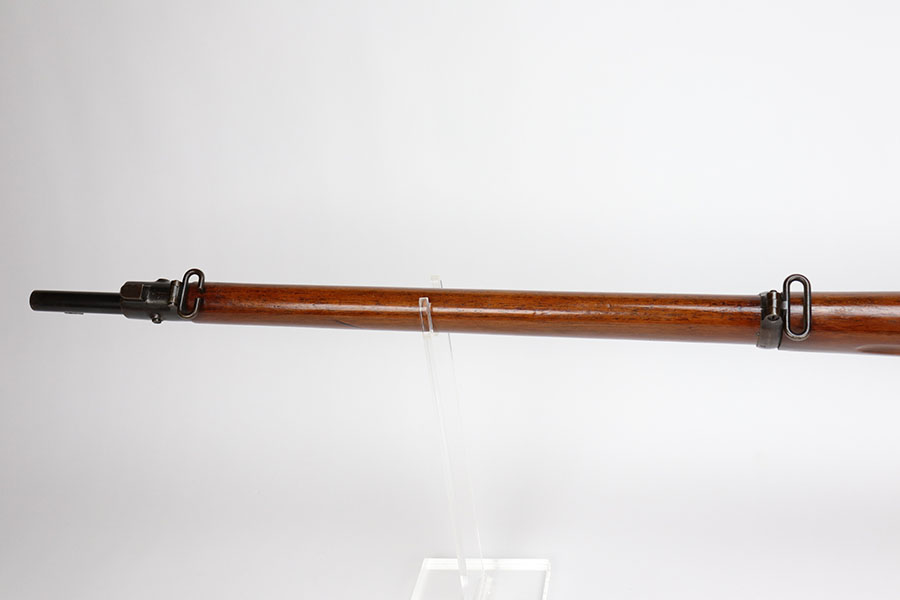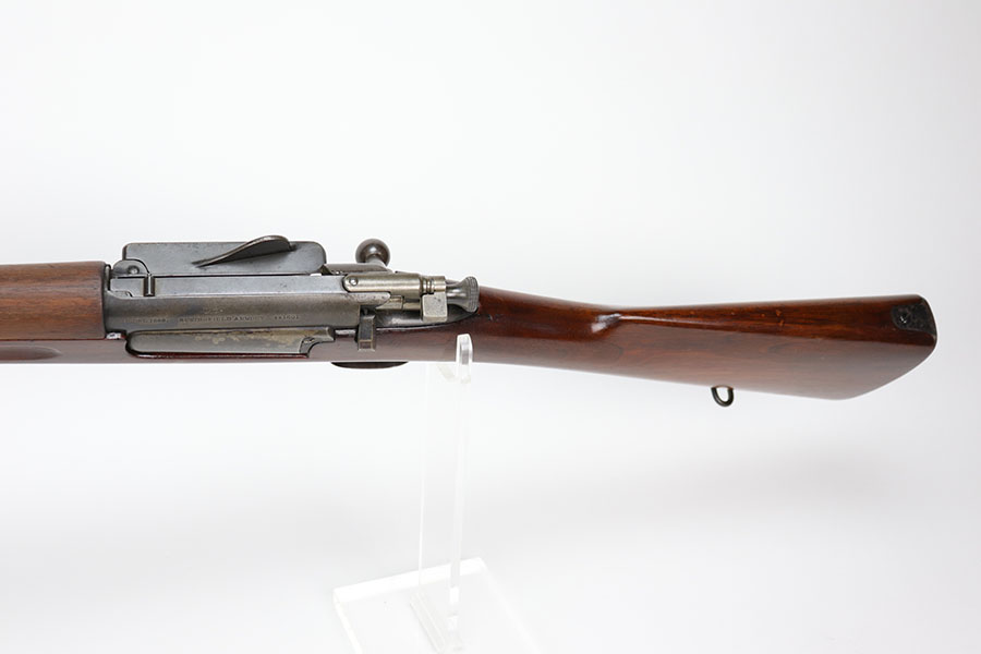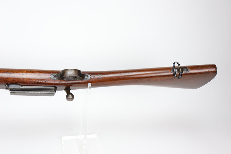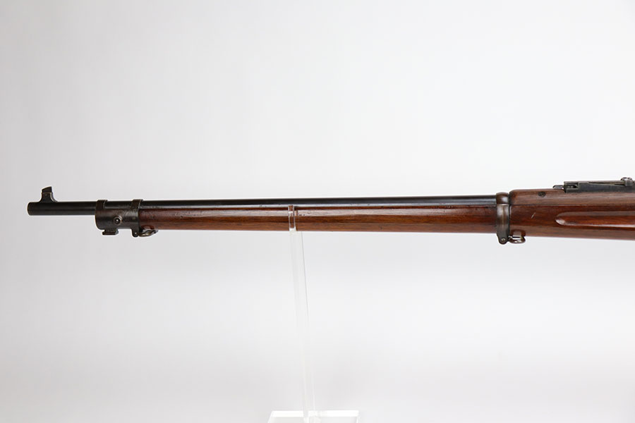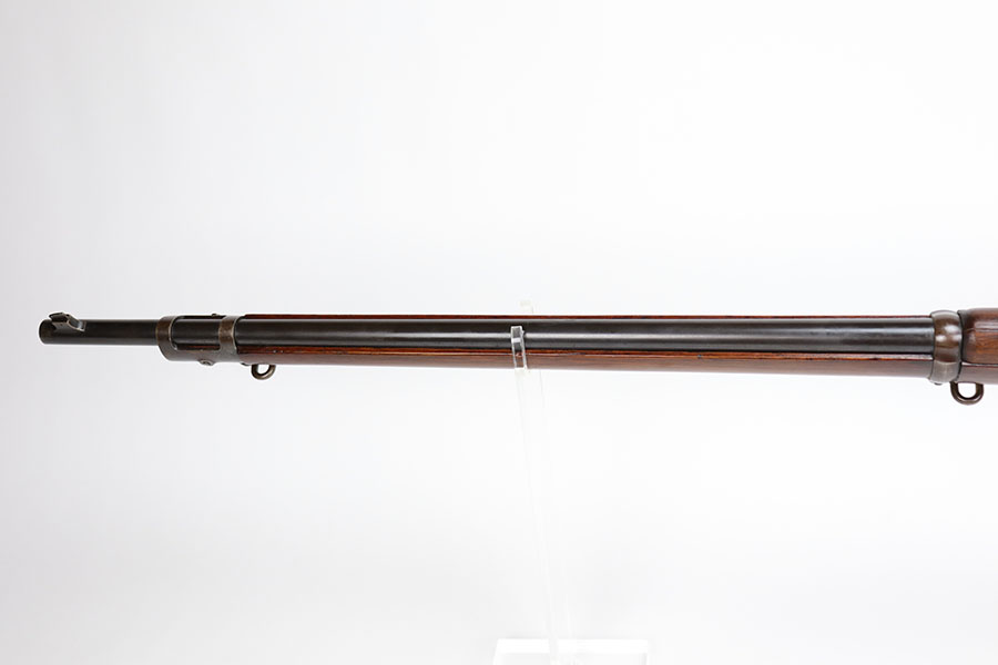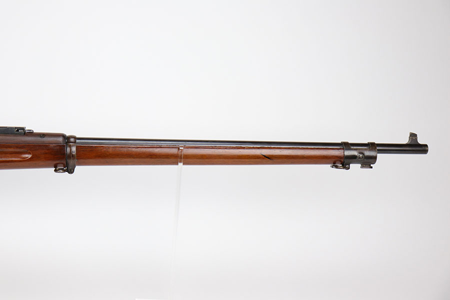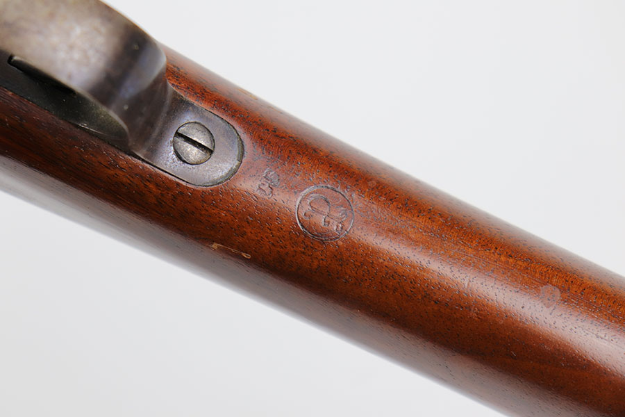 12/1/20 – This is a very nice example of a Springfield Krag Model 1898, manufactured in 1904. Overall, it is in very nice condition. It has retained most of its original bluing on the barrel, but there is thinning on the rest of the metal parts. The gun is fully functional and the action is buttery-smooth. The stock is marked with a “P” proof. It is in excellent condition with hardly any dings or nicks. Bore is shiny with strong rifling but there’s a bit of frost and freckling near the muzzle.