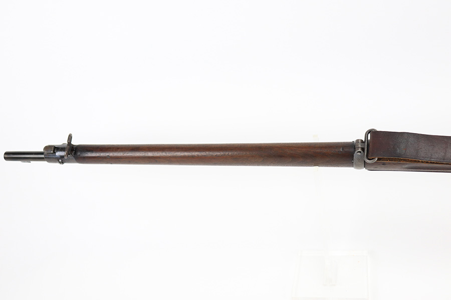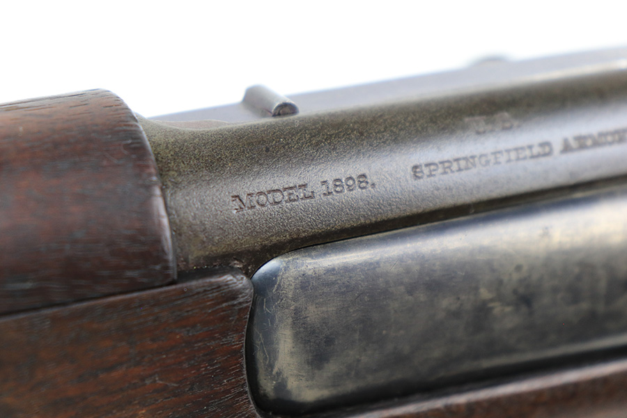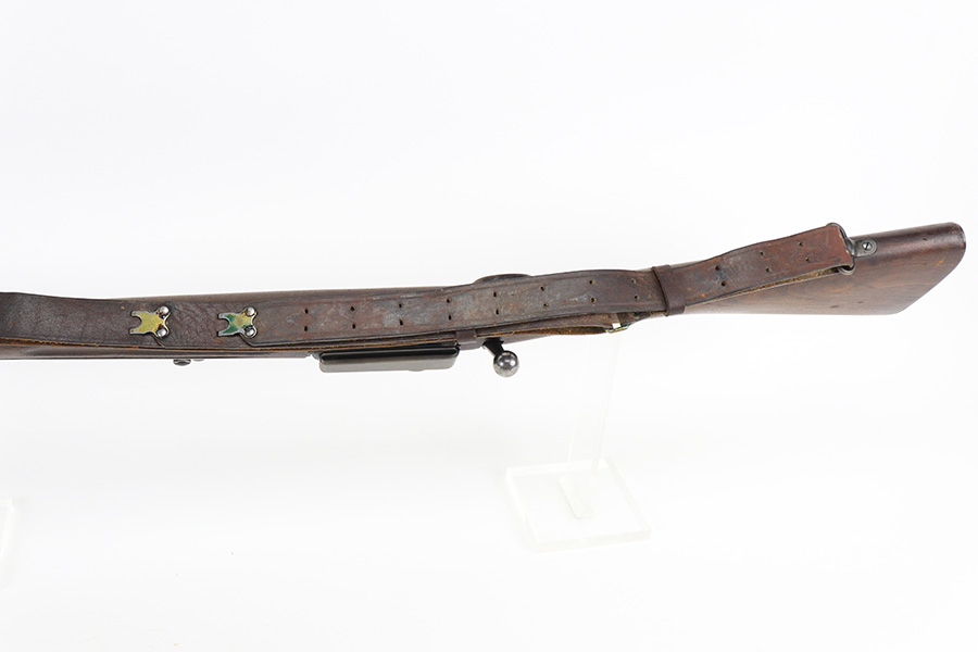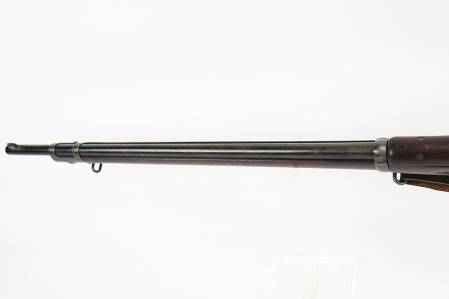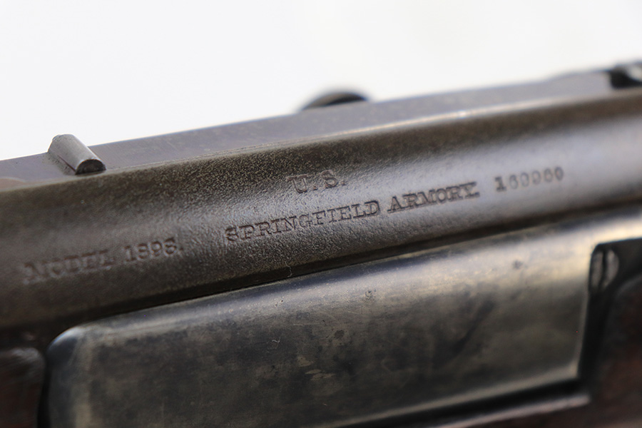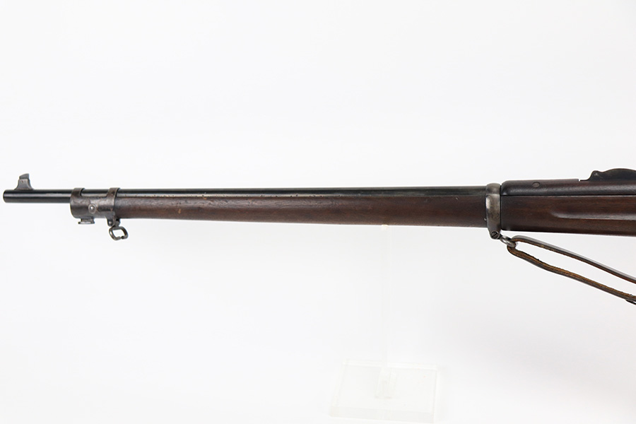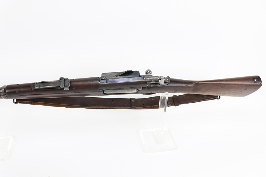 6/9/22 – This is a nice example of a Springfield Krag Model 1898 rifle issued to the US military in 1899. Overall, the gun is in very nice condition. There is noticeable thinning and pin-pricking on the receiver. Spotty wear on the left side plate, rear barrel band, and underside of the trigger guard. Noticeable spotty discoloration on the front barrel band. Noticeable thinning on the back half of the barrel. There is still some really nice fire bluing on the top of the bolt. The stock does have an 1899 date and military inspection stamp, but it is very faint – the stock was likely sanded. There are some spots on the left side of the butt stock where it looks like the wood finish has dulled. Comes with a nice leather sling. Shiny bore with great rifling and some areas of minor pitting here and there.