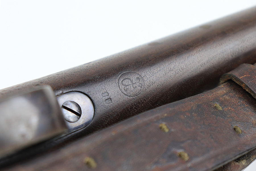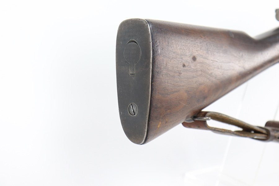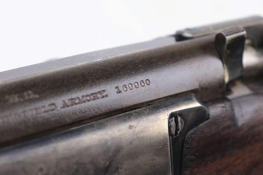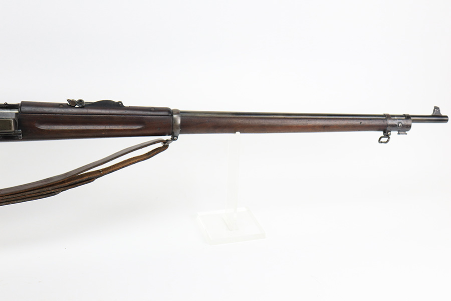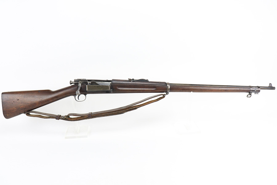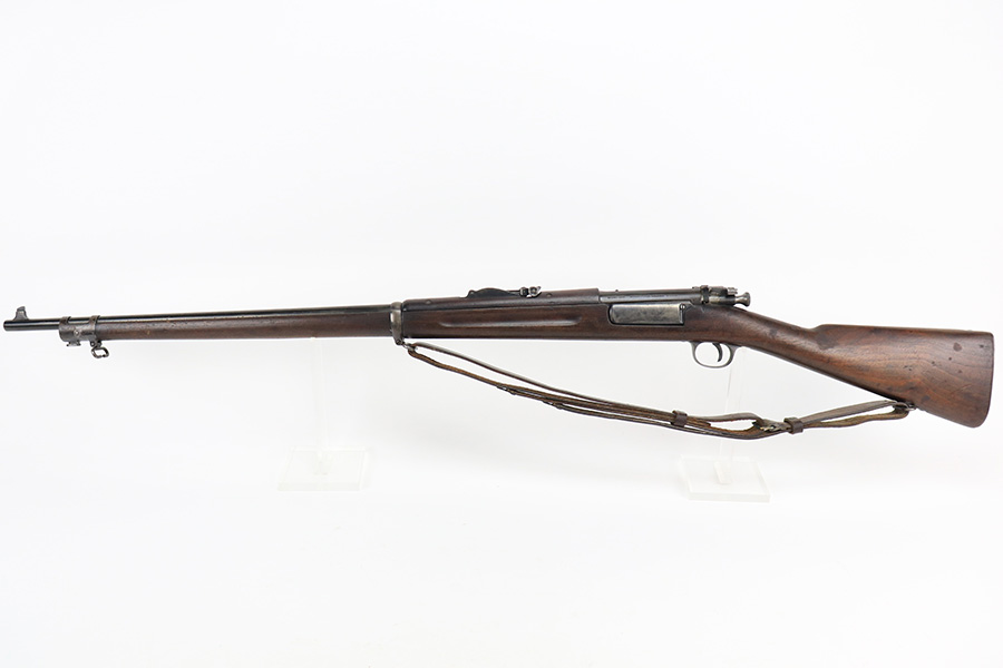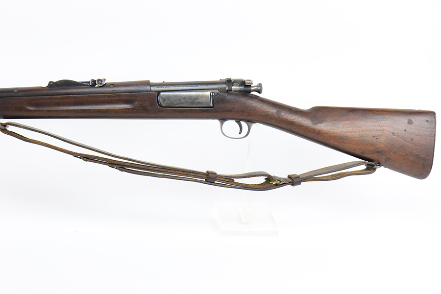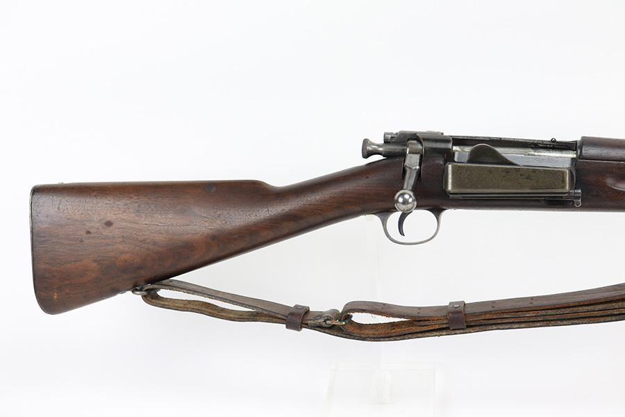 6/9/22 – This is a nice example of a Springfield Krag Model 1898 rifle issued to the US military in 1899. Overall, the gun is in very nice condition. There is noticeable thinning and pin-pricking on the receiver. Spotty wear on the left side plate, rear barrel band, and underside of the trigger guard. Noticeable spotty discoloration on the front barrel band. Noticeable thinning on the back half of the barrel. There is still some really nice fire bluing on the top of the bolt. The stock does have an 1899 date and military inspection stamp, but it is very faint – the stock was likely sanded. There are some spots on the left side of the butt stock where it looks like the wood finish has dulled. Comes with a nice leather sling. Shiny bore with great rifling and some areas of minor pitting here and there.