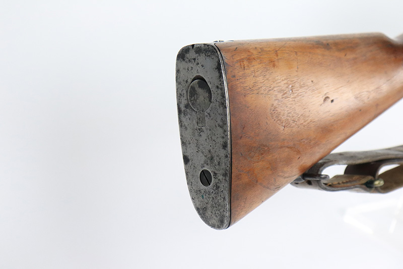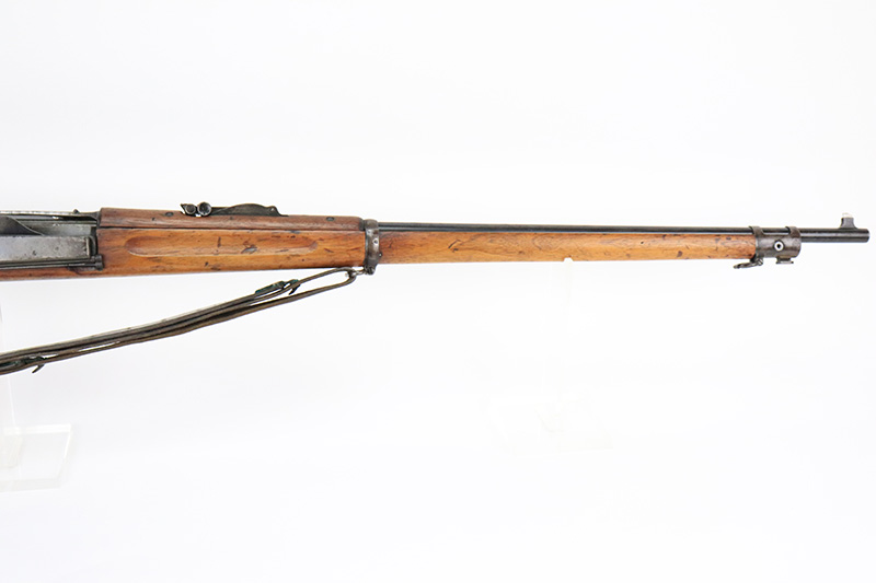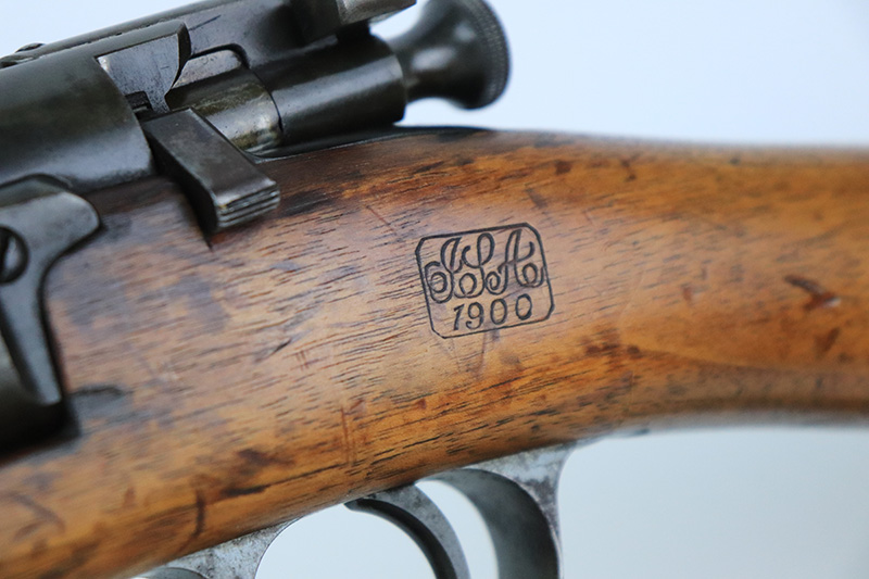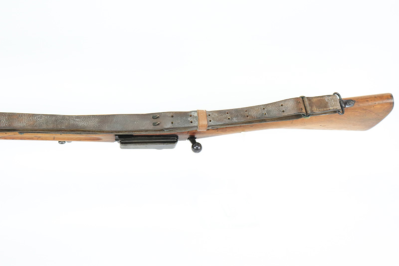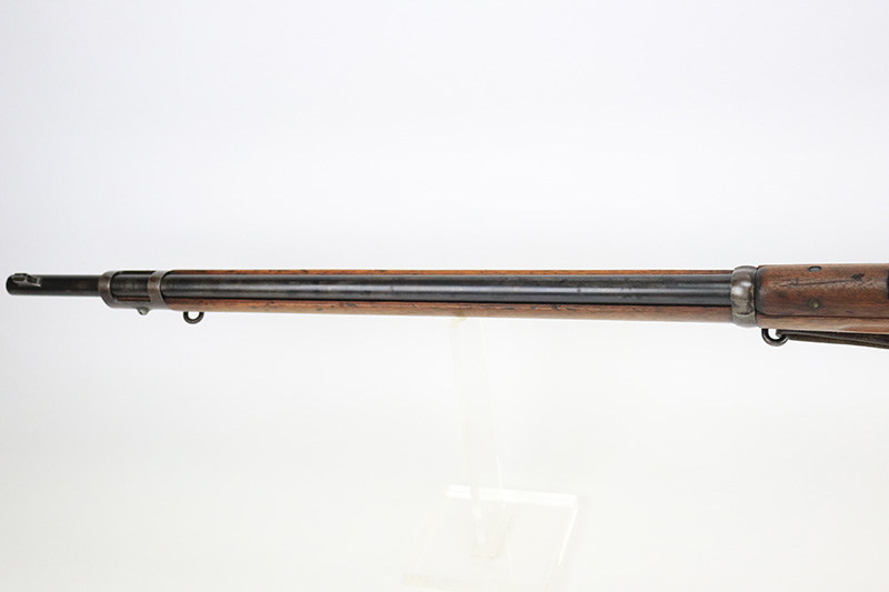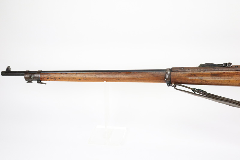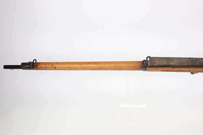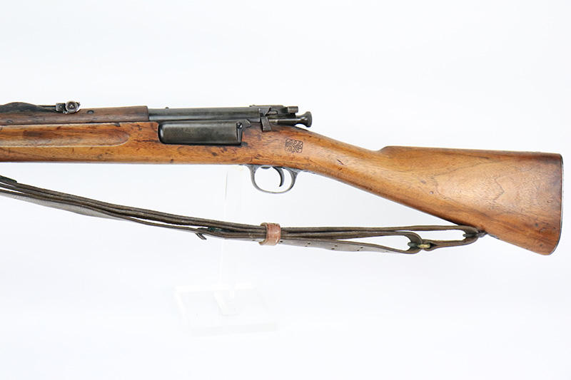 9/16/22 – This is a nice example of a Springfield Krag Model 1898 issued to the US military. The serial number dates this gun to about 1901. The stock has a military inspection stamp dated 1900. However, we believe this is an original stock that was sanded and the proofs reapplied. Overall, the gun is in nice condition. However, there is spotty finish loss and splotchy discoloration on most of the metal surfaces. Most of the remaining finish is along the barrel. Spotty oxidation on the butt plate. Comes with a nice leather sling and 11 rds of .30-40 Krag ammunition. Minor bruising on the stock throughout, but there is no major damage. The bore has good rifling with a few small areas of minor oxidation.