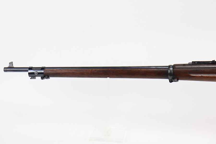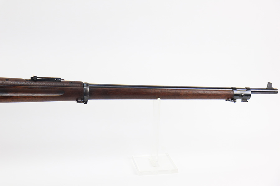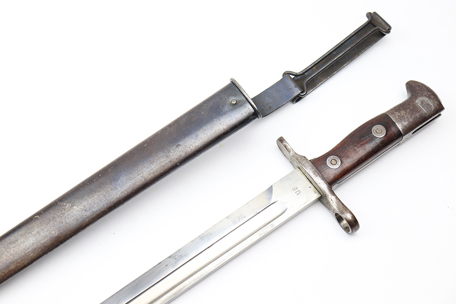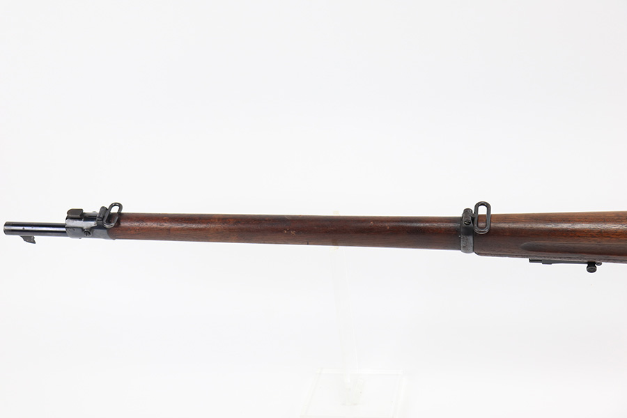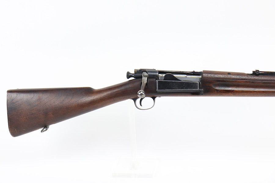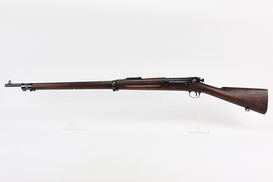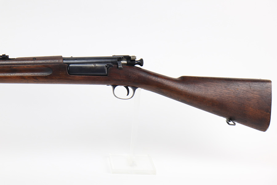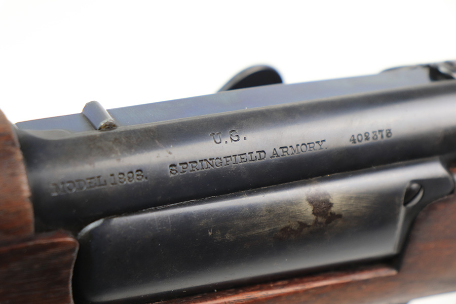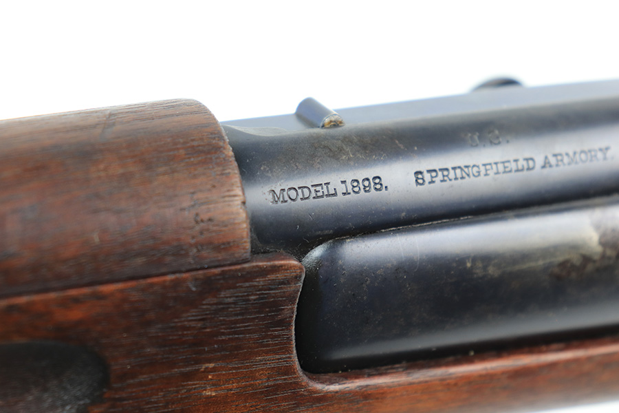 3/17/22 – This is an excellent example of a Springfield Krag Model 1898 issued to the US military in 1902. The right side of the stock is dated 1902 and has the proper military inspection stamp. The wrist has the proper “P” proof. The gun also comes with a period-correct 1901-dated bayonet with an original scabbard. The original wire cartridge belt loop is still intact on the scabbard. Overall, the gun is in excellent condition. There is not much actual finish loss throughout. However, there is an area of noticeable wear and oxidation on the left side of the receiver. Very minor wear around the muzzle and some spots of light oxidation on the barrel bands. Excellent stock with light scratches and handling marks here and there. Mint bore. Note: the bayonet fits snug on this gun is a little hard to get off.