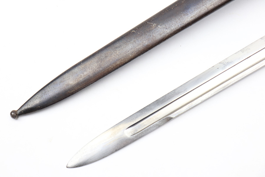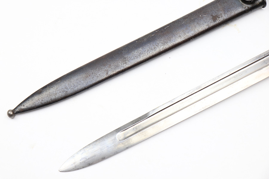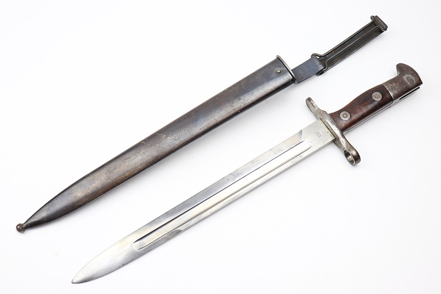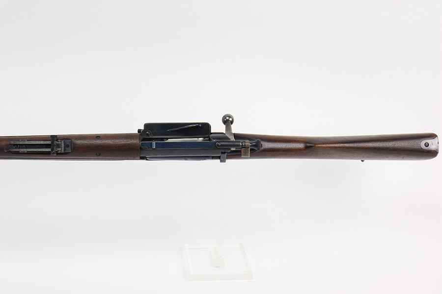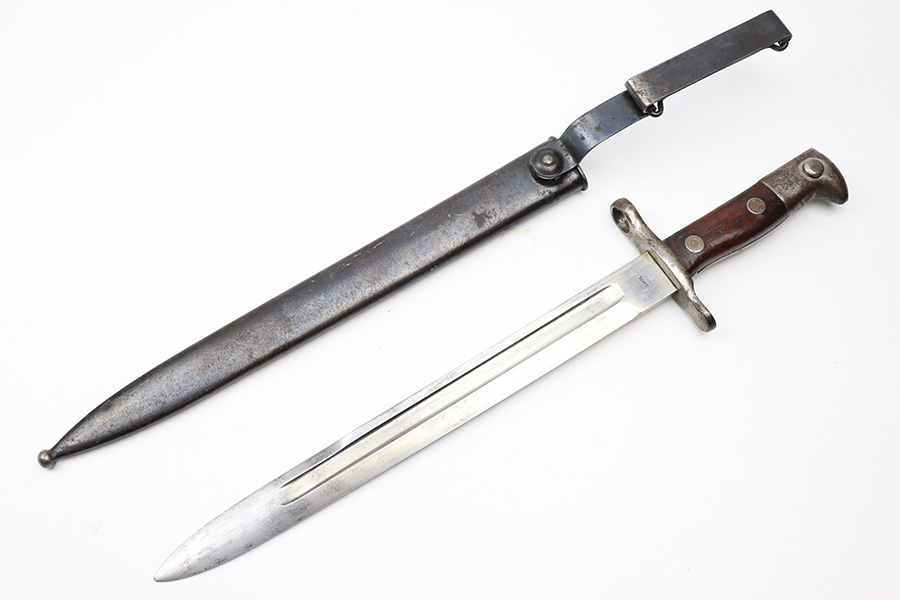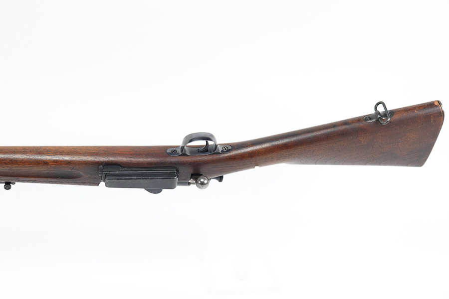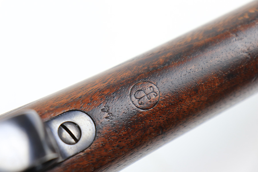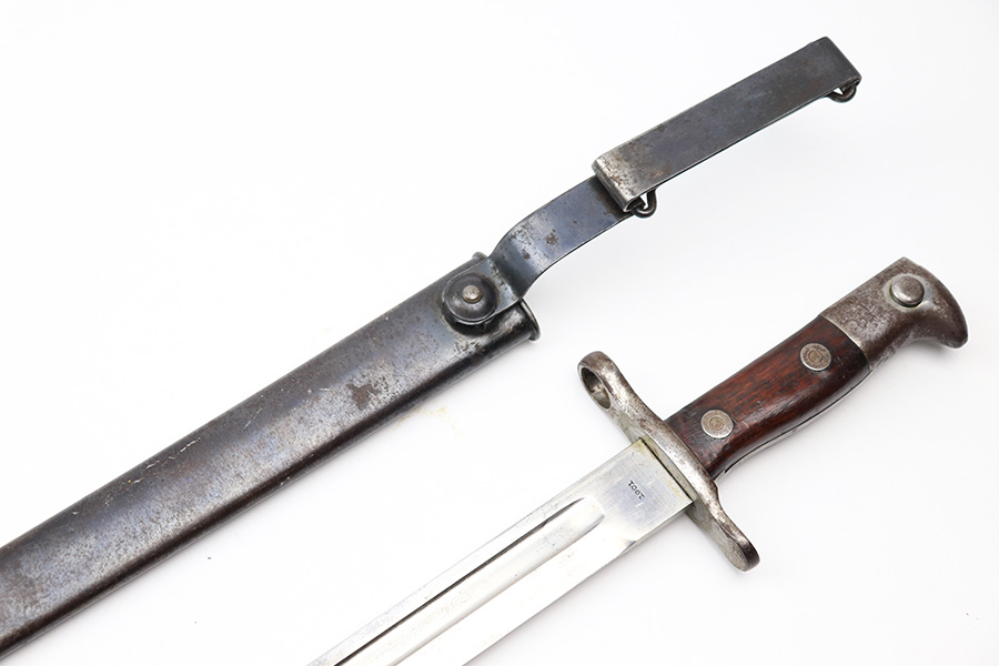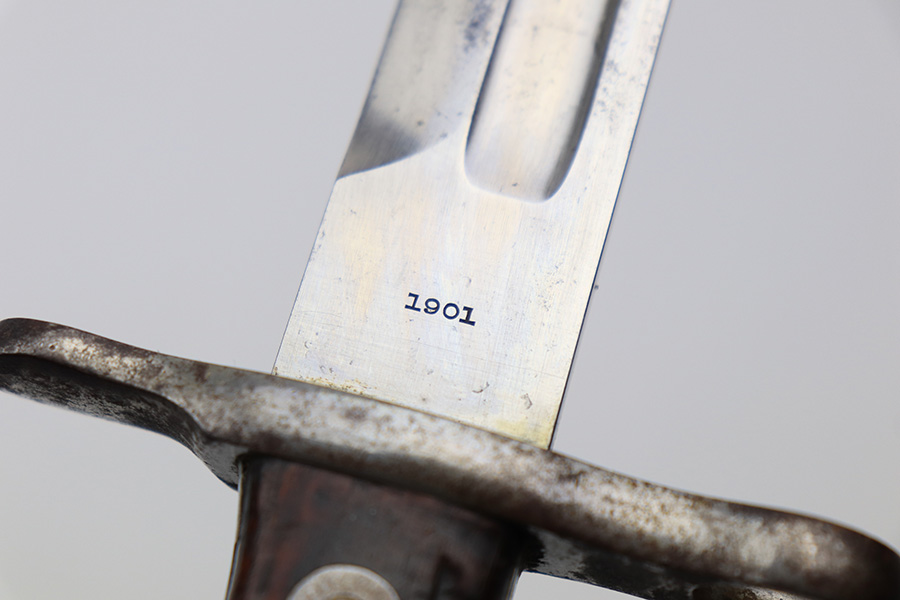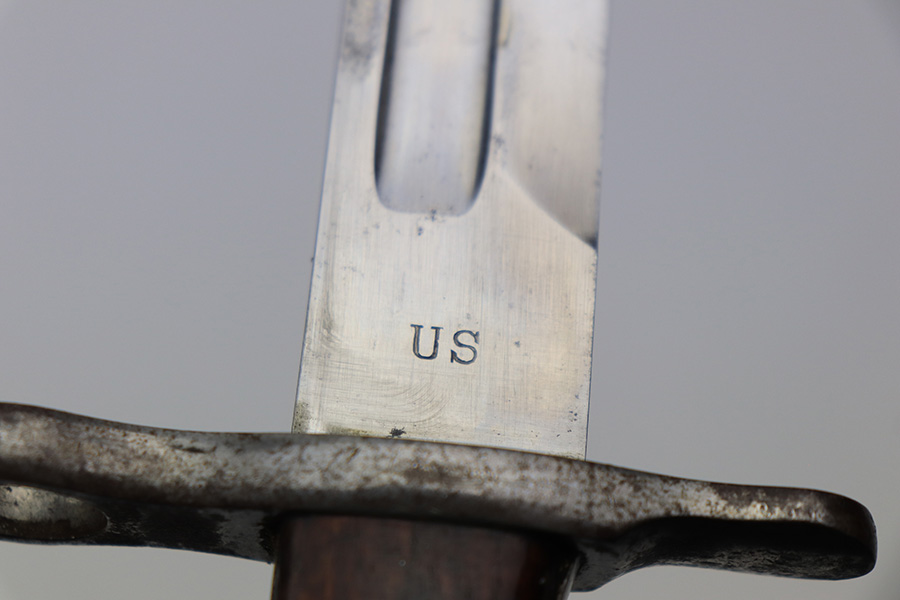 3/17/22 – This is an excellent example of a Springfield Krag Model 1898 issued to the US military in 1902. The right side of the stock is dated 1902 and has the proper military inspection stamp. The wrist has the proper “P” proof. The gun also comes with a period-correct 1901-dated bayonet with an original scabbard. The original wire cartridge belt loop is still intact on the scabbard. Overall, the gun is in excellent condition. There is not much actual finish loss throughout. However, there is an area of noticeable wear and oxidation on the left side of the receiver. Very minor wear around the muzzle and some spots of light oxidation on the barrel bands. Excellent stock with light scratches and handling marks here and there. Mint bore. Note: the bayonet fits snug on this gun is a little hard to get off.