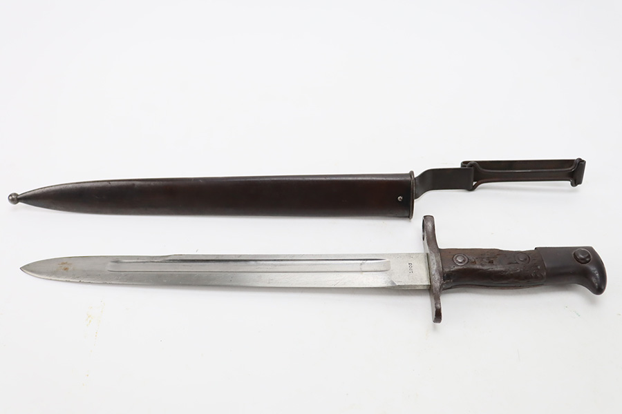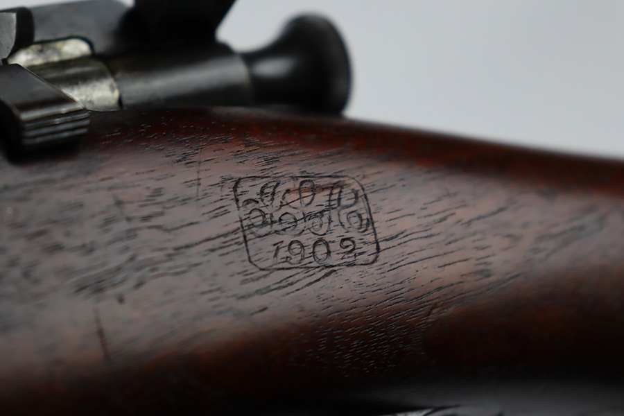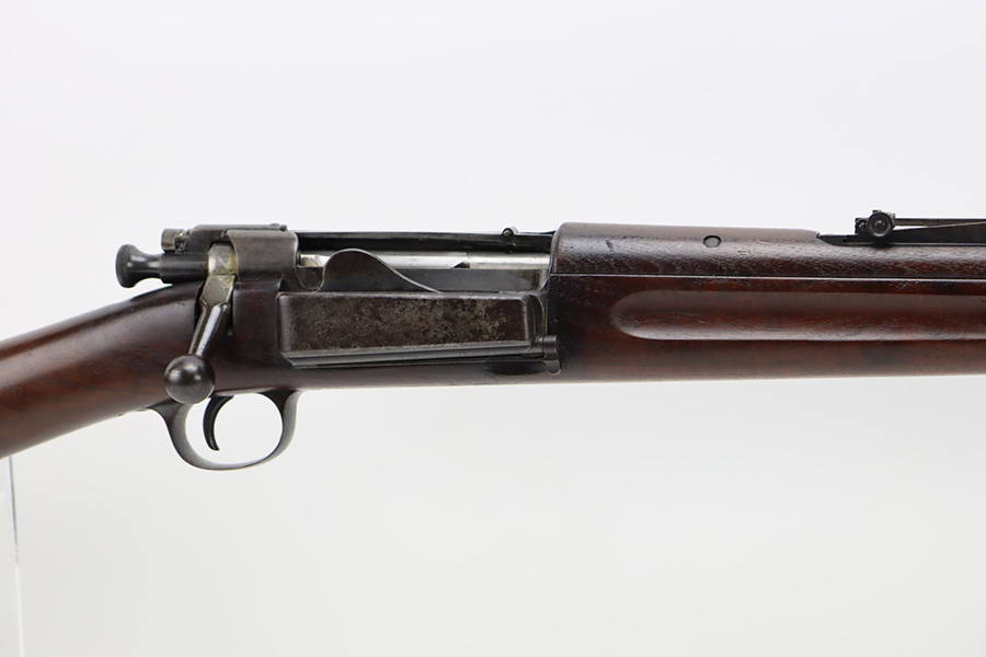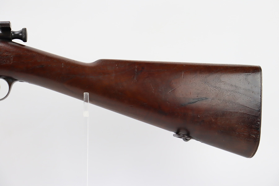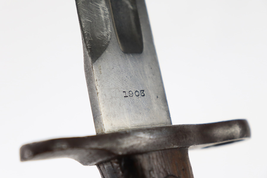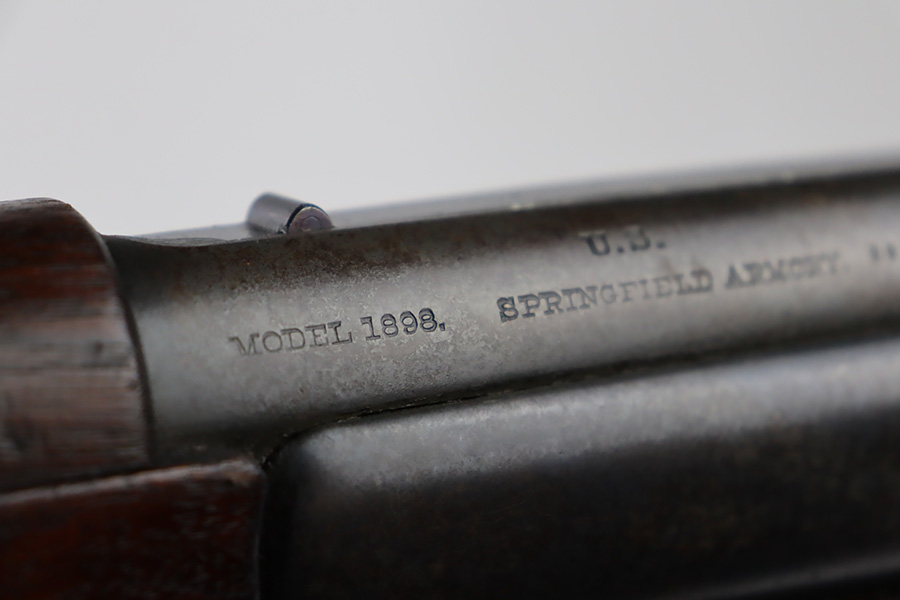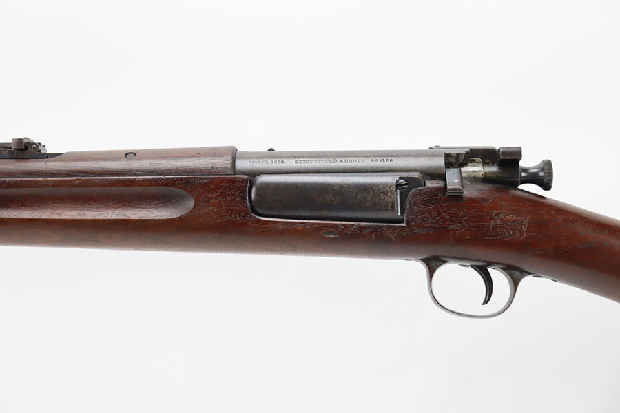 12/7/23 – This is a nice example of a Springfield Krag Model 1898 issued to the US military in 1902. The left side of the stock is dated 1902 and has the proper military inspection stamp. The wrist has the proper “P” proof. The gun also comes with a period-correct 1903-dated bayonet with an original scabbard. The original wire cartridge belt loop is still intact on the scabbard. Overall, the gun isn’t bad for its age. There is some thinning on and around the receiver area. But the most obvious sign of wear is dark brown patina and some spotty oxidation throughout. The original fire-bluing is still visible on the top of the bolt. Excellent stock with below-average wear. The bore has decent rifling, but there is tiny pitting throughout.