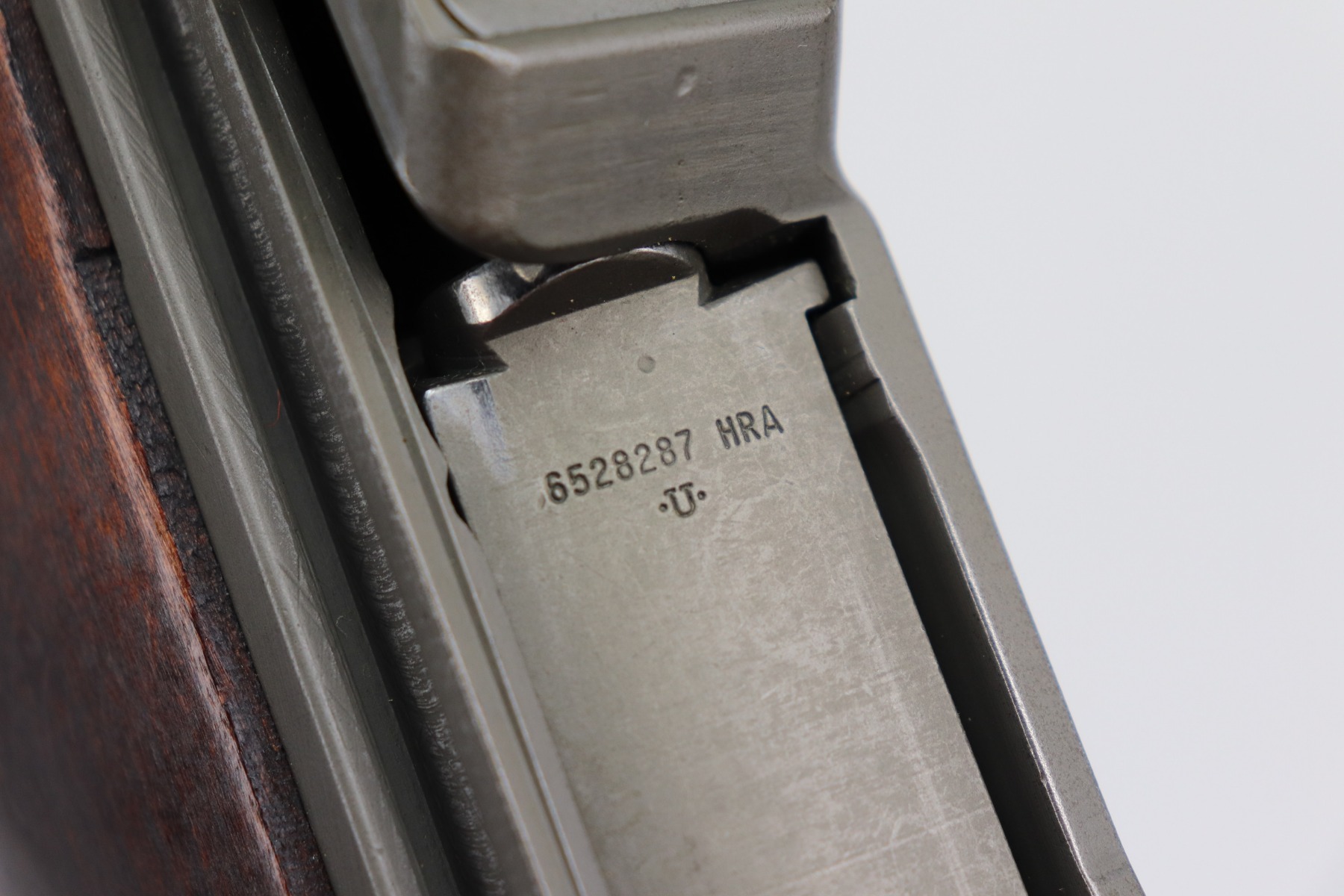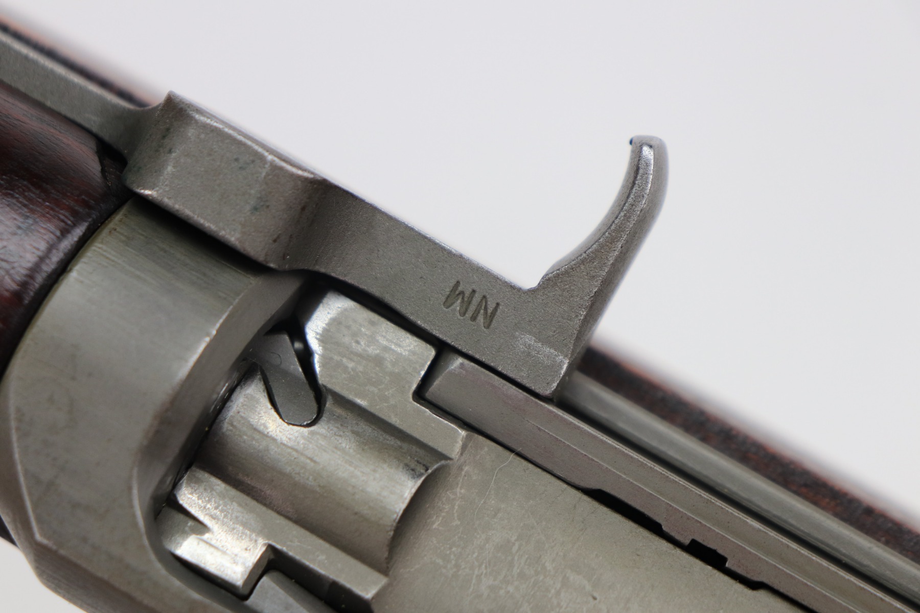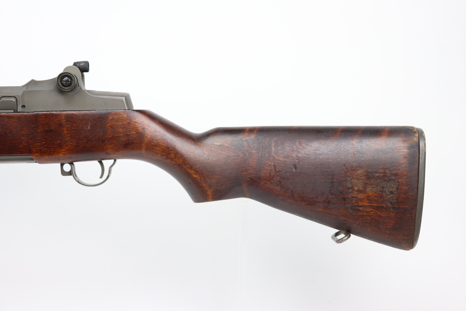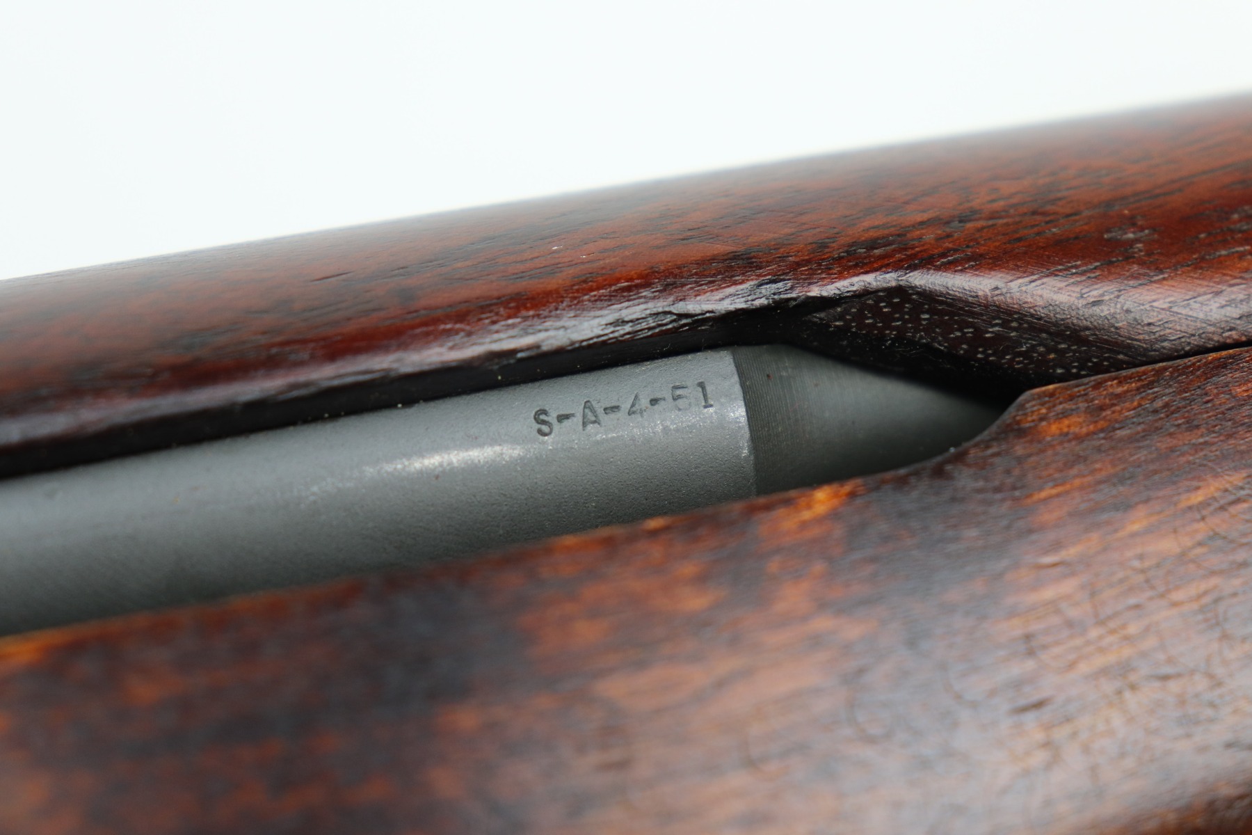3/26/21 – This is an excellent Springfield M1 Garand. The receiver dates to 1942 and the barrel is dated 1951. This gun was likely reworked for the Korean war. A peep sight was added to the rear sight. “NM” mark on the op rod. It looks like it has been re-parkerized. It has retained most of its finish with minor handling marks. There is a “P” proof on the wrist of the stock. The stock is very nice with minor dings and scratches here and there. The bore has good rifling with minor pin-pricking in the grooves.