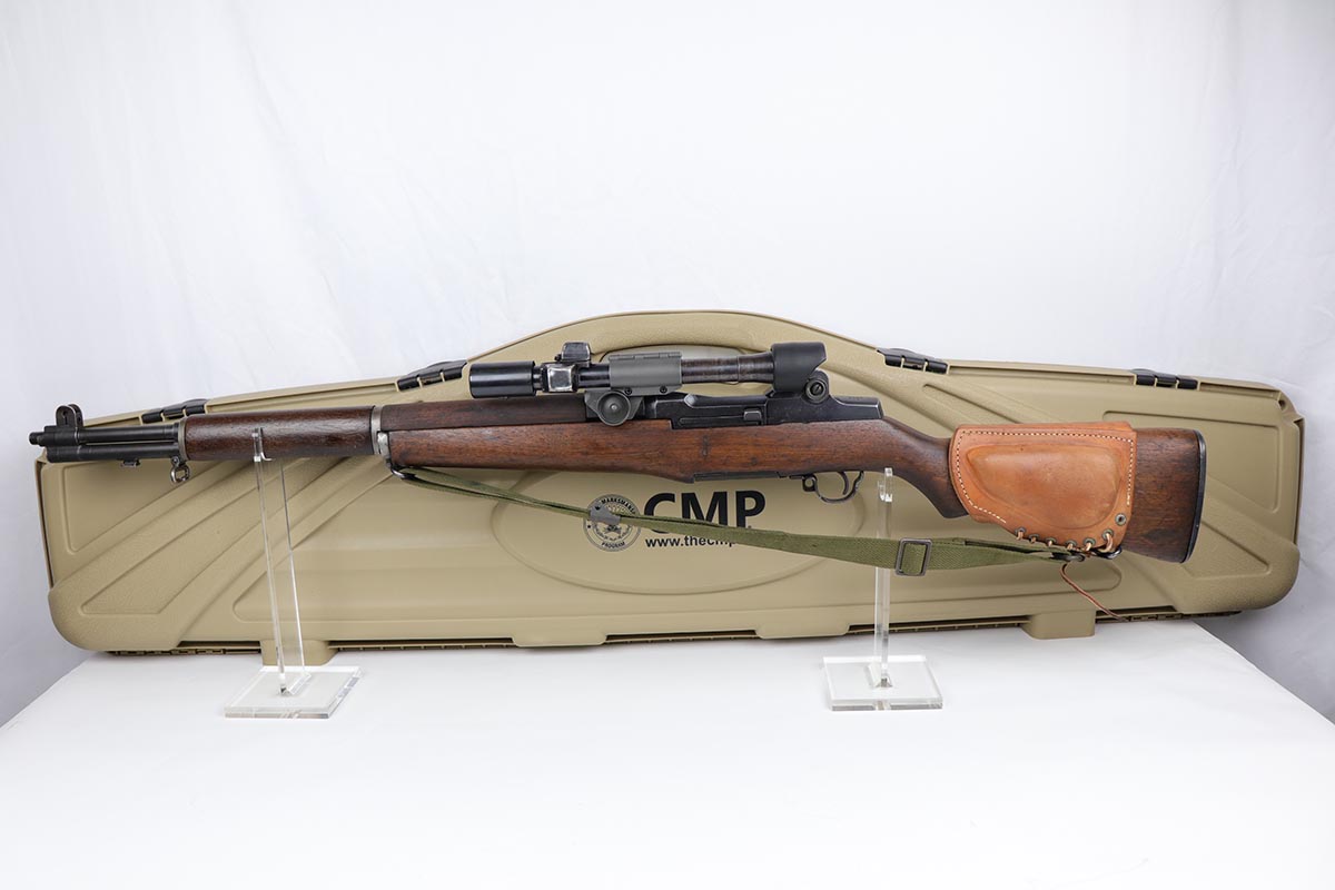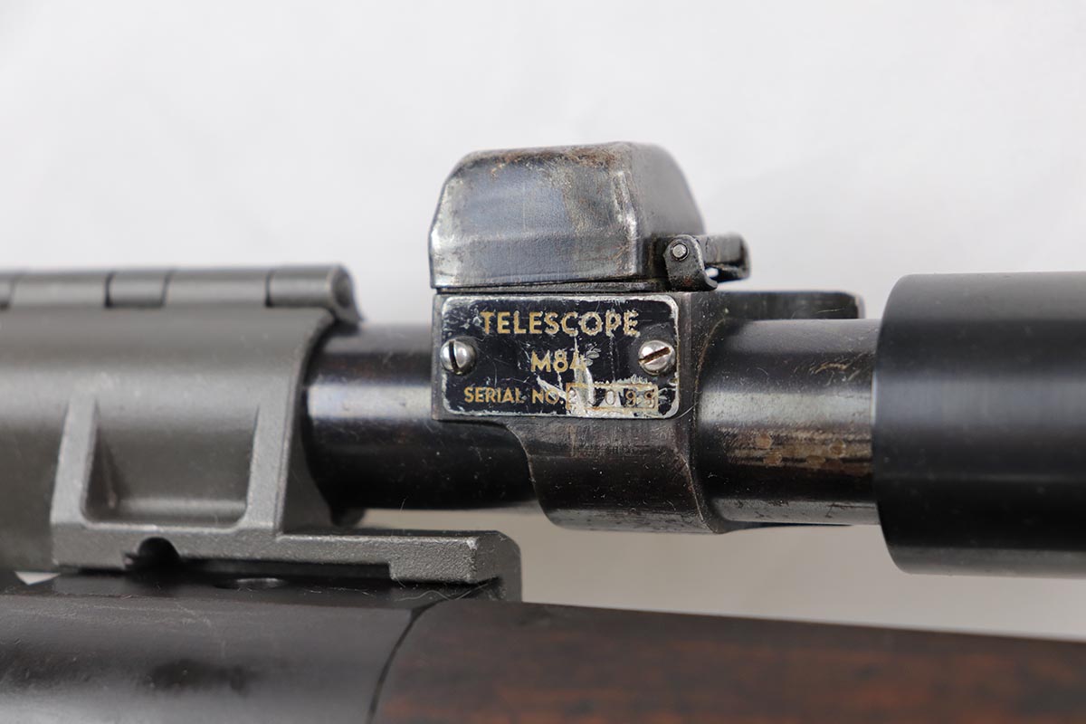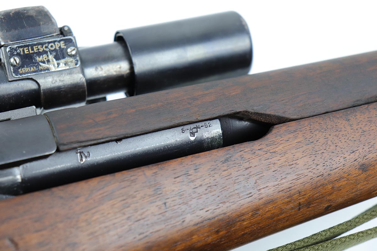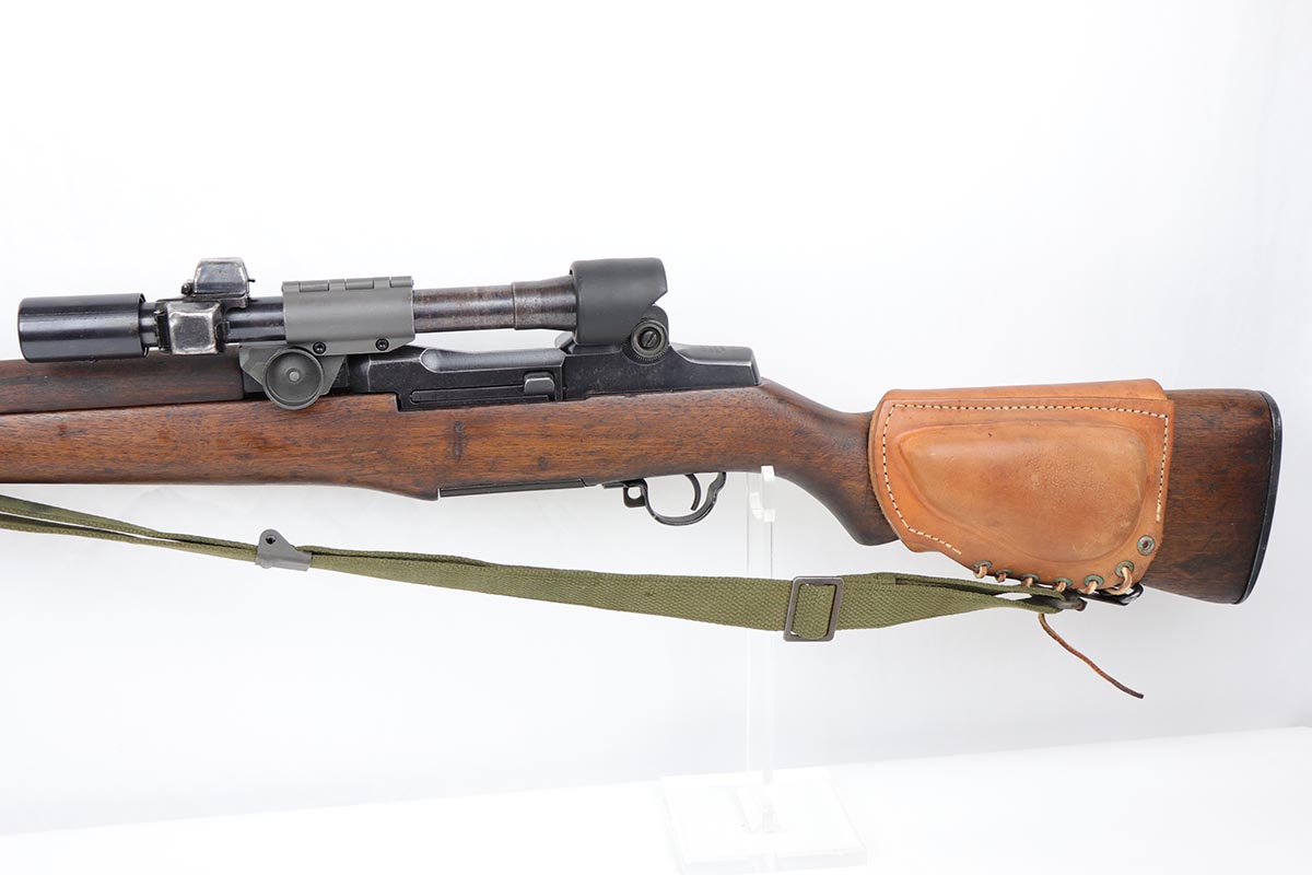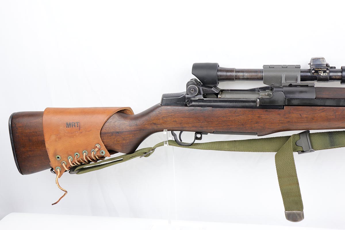 9/12/19 – The M1D Garand Sniper was designed so that troops in Korea could essentially turn the Garand into a sniper rifle with a field kit, rather than needing to drill mount the scope like the M1C. This particular gun was made in 1943, then arsenal upgraded to the M1D in April of 1952 (barrel date). The rifle is likely a put-together in the M1D style and in excellent condition. The stock is unmarked but in excellent shape with no major defects. The scope has clear optics and is marked “Telescope M84” with serial 23096. While the optics are clear, there is a little moisture inside the scope – it doesn’t obstruct view but buyer may want to try removing it. Nice, original sling and cheek pad, with the pad marked ‘MRT’. Bore is shiny with strong rifling but does have minor frost throughout. Gun comes with the CMP hard case.