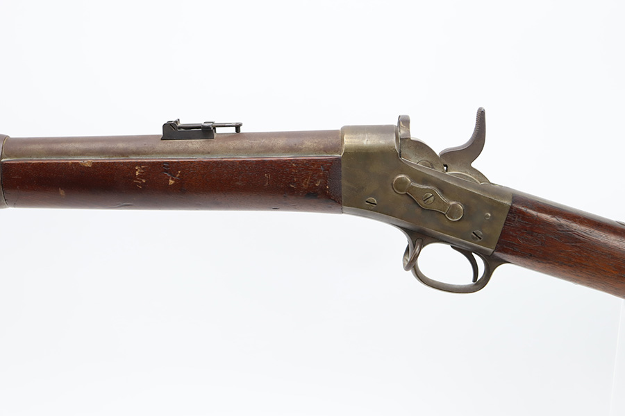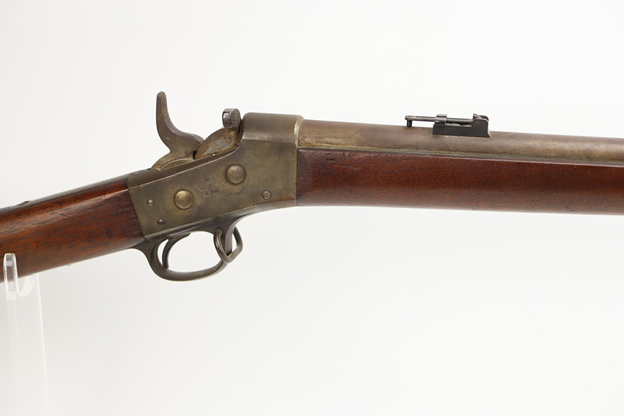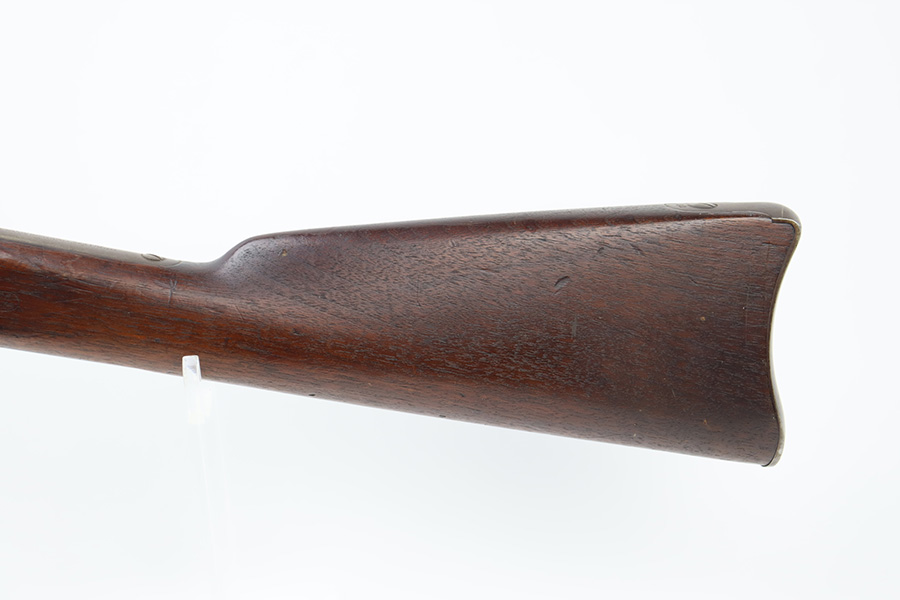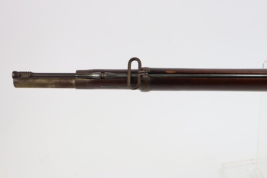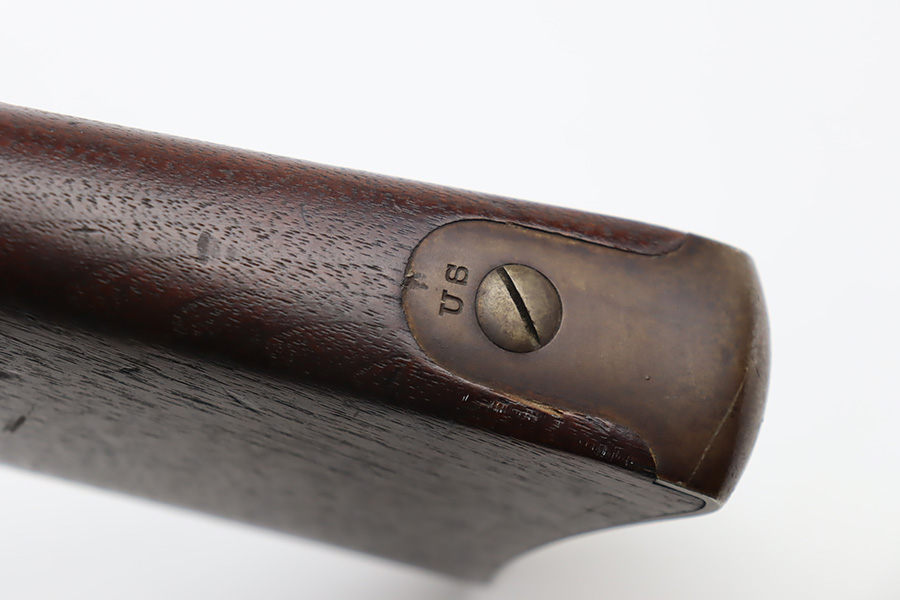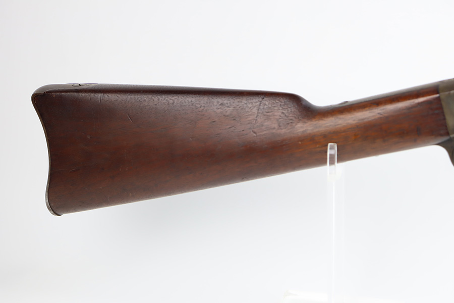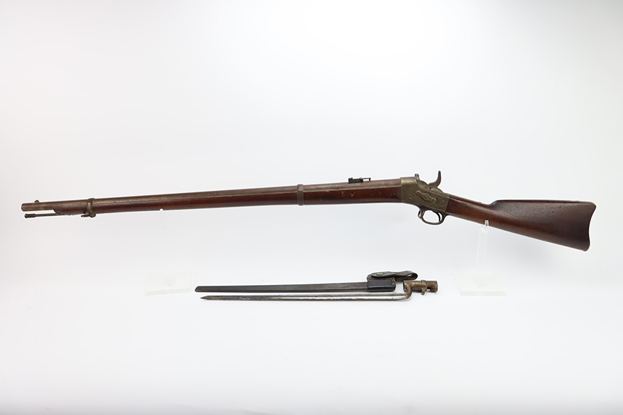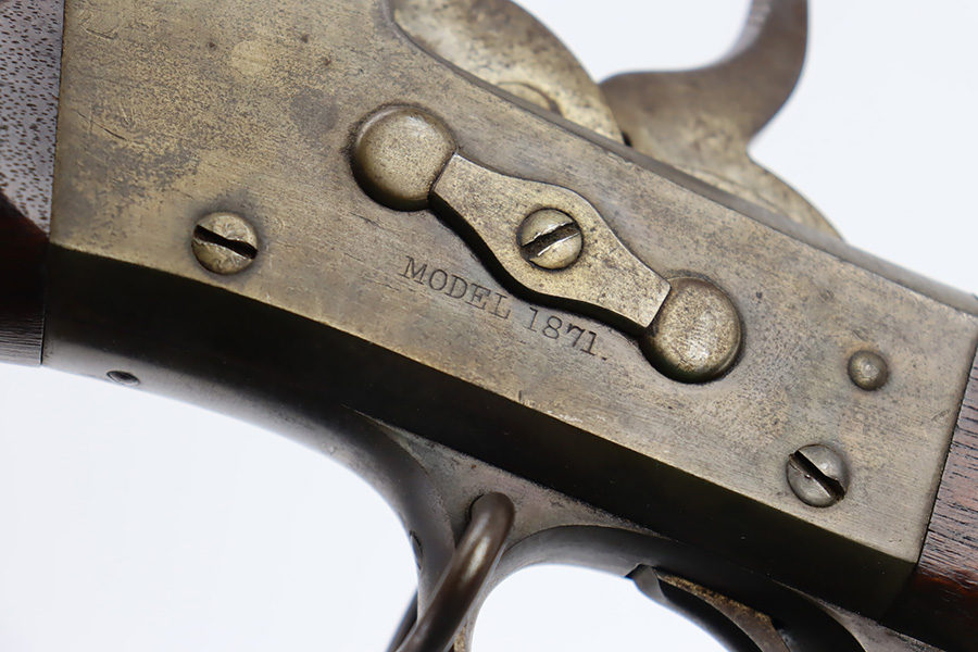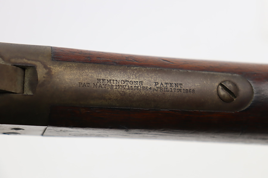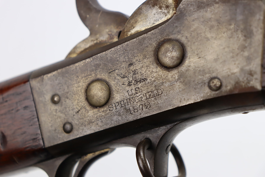 11/28/23 – This is a nice example of a scarce Springfield Model 1871 Rolling Block Rifle manufactured in 1872. Approximately 10,000 U.S. Army Rolling Block rifles were manufactured c. 1871-1872 by Springfield Armory under a royalty agreement with E. Remington & Sons. “MODEL 1871” marked on the left side of the receiver and an eagle and shield over “U.S./SPRINGFIELD/1872” marked on the right side. Crisp military cartouche on the left side of the stock. Comes with a cleaning rod, as well as a bayonet with a USN marked scabbard. Overall, the gun is in nice condition. Notable patina throughout, with some wear around the muzzle due to the bayonet attachment. Areas of light spotty oxidation throughout. Excellent wood stock with only minor dings and scratches here and there. The bore is very nice with strong rifling. Buttplate is also ‘U.S’ marked.